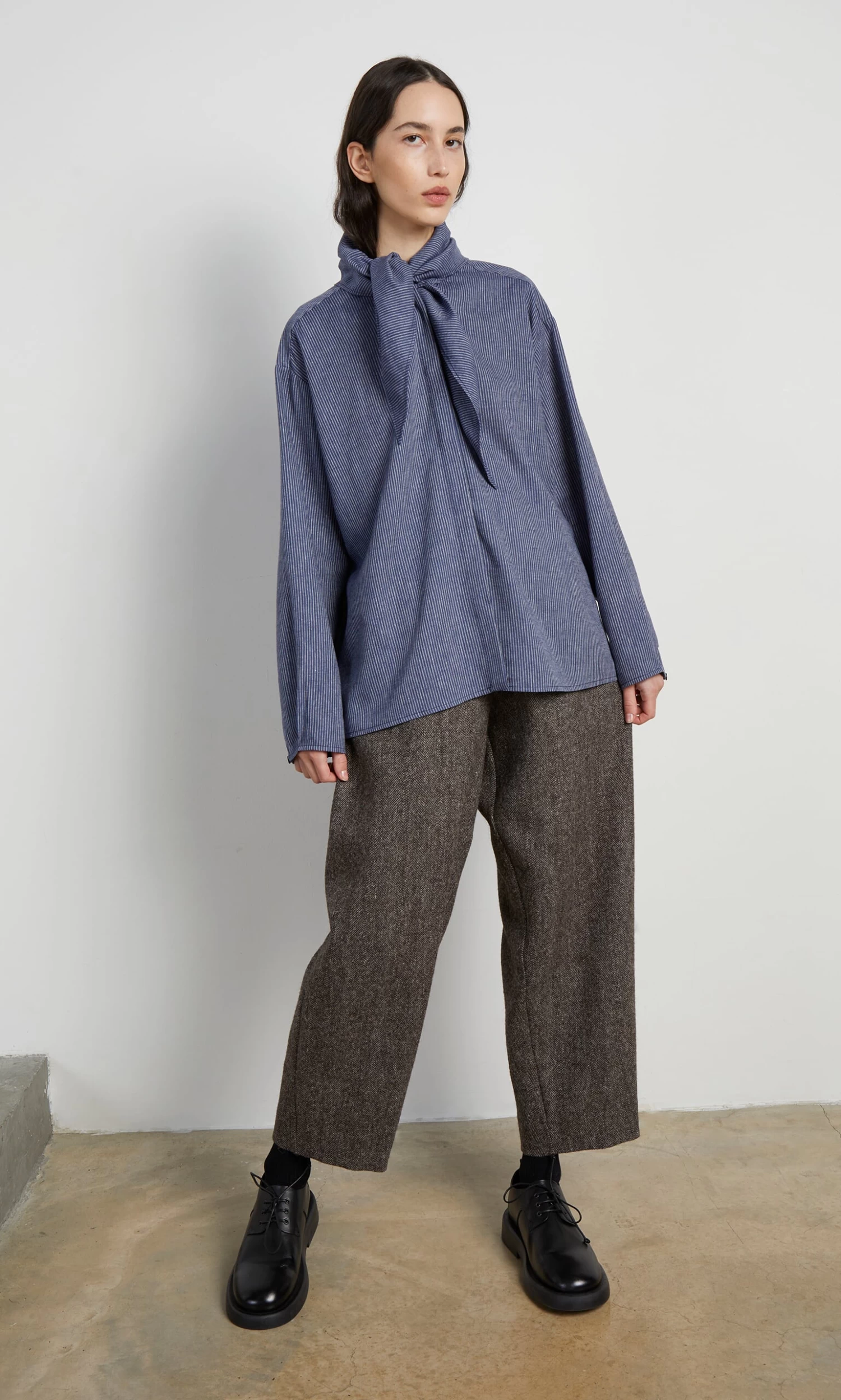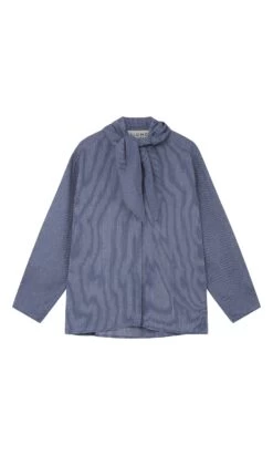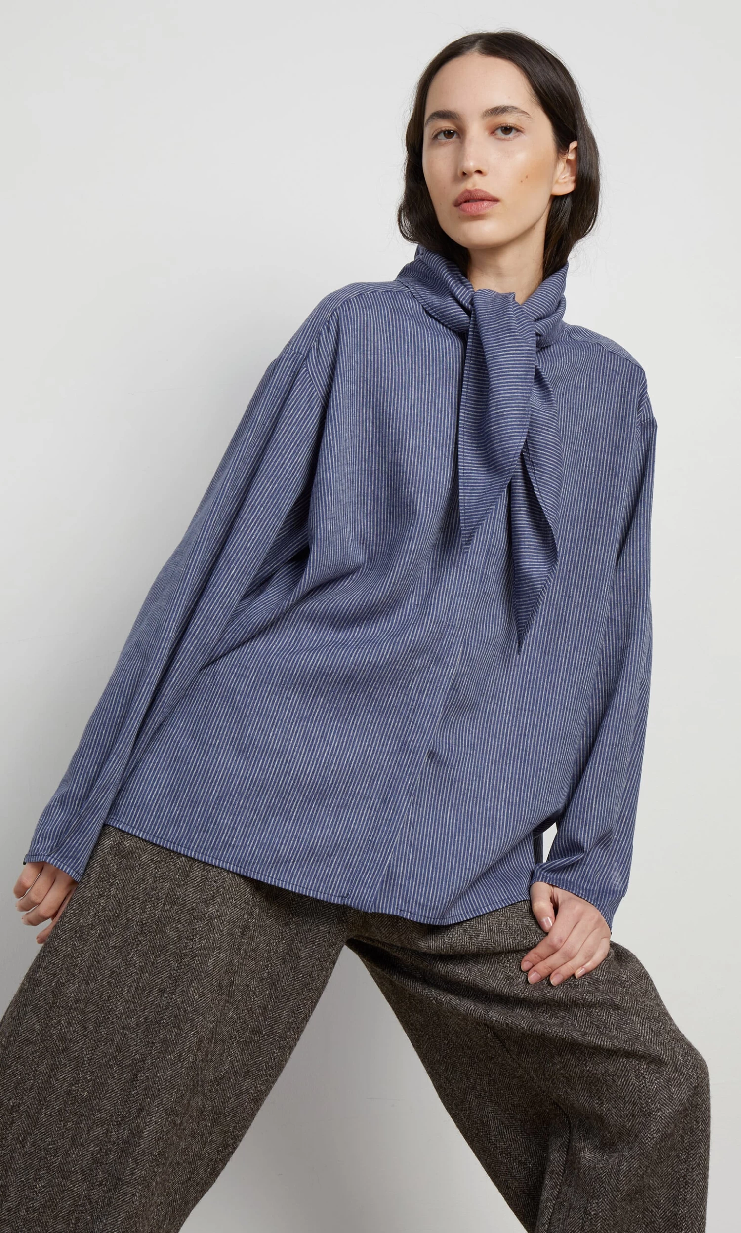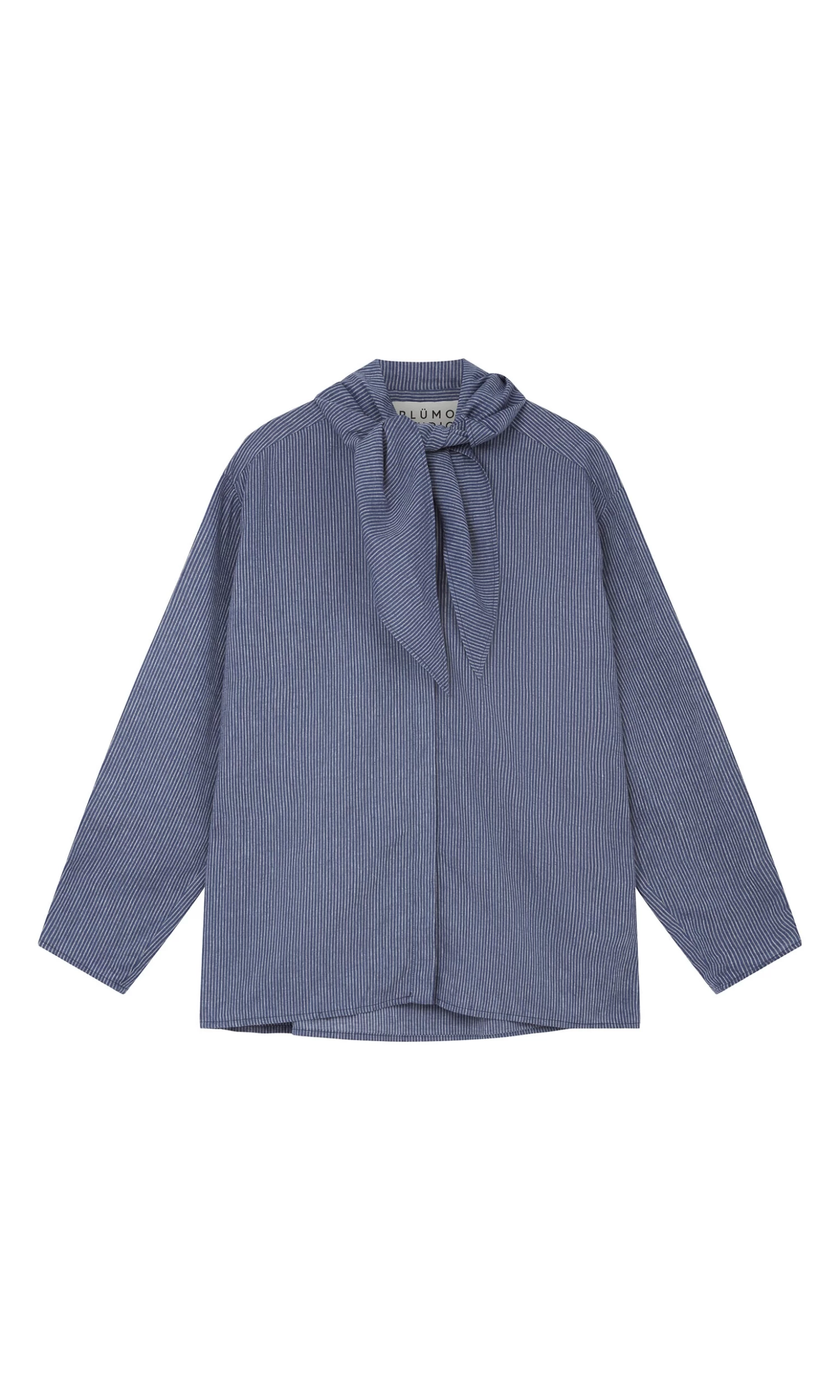 Indigo pinstripe blouse with integrated triangle neckerchief. Box pleating across shoulders at back and on cuffs adds gentle volume. Button-through front fastening. Relaxed fit.