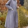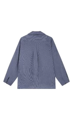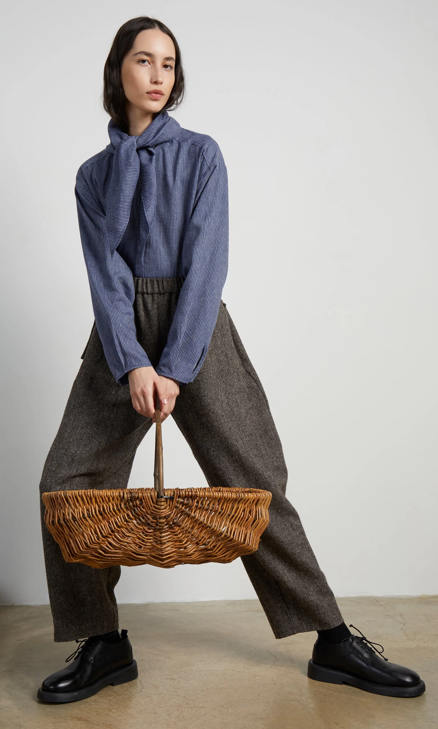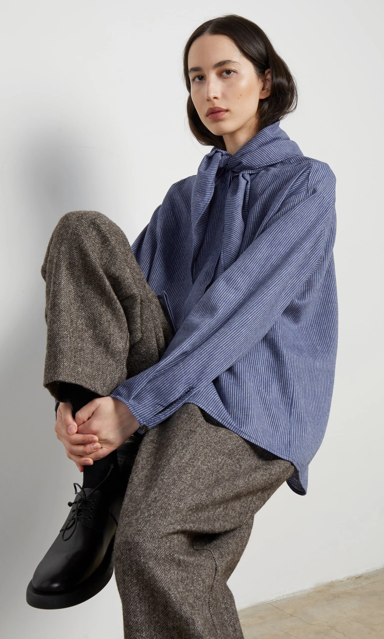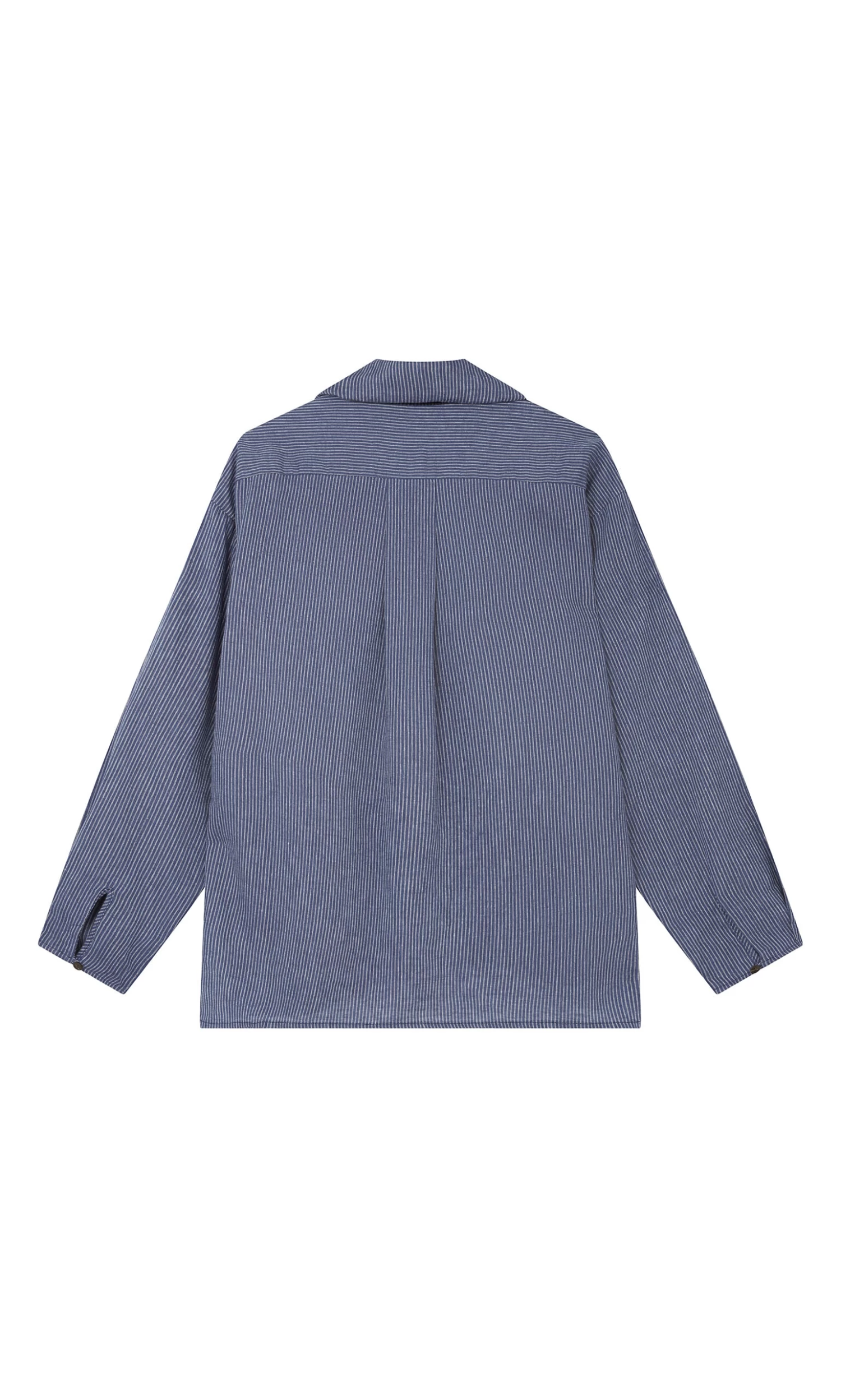 Indigo pinstripe blouse with integrated triangle neckerchief. Box pleating across shoulders at back and on cuffs adds gentle volume. Button-through front fastening. Relaxed fit.