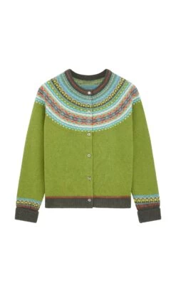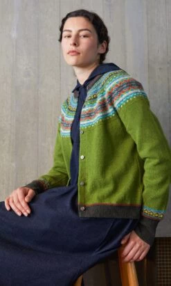 Finely knitted olive lambswool cardigan with traditional fair isle patterning around the yoke. Delicate polished shell buttons fasten at the front. Neatish shape. Long cosy ribbed cuffs. Sustainably crafted and designed in Scotland.