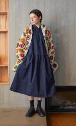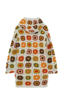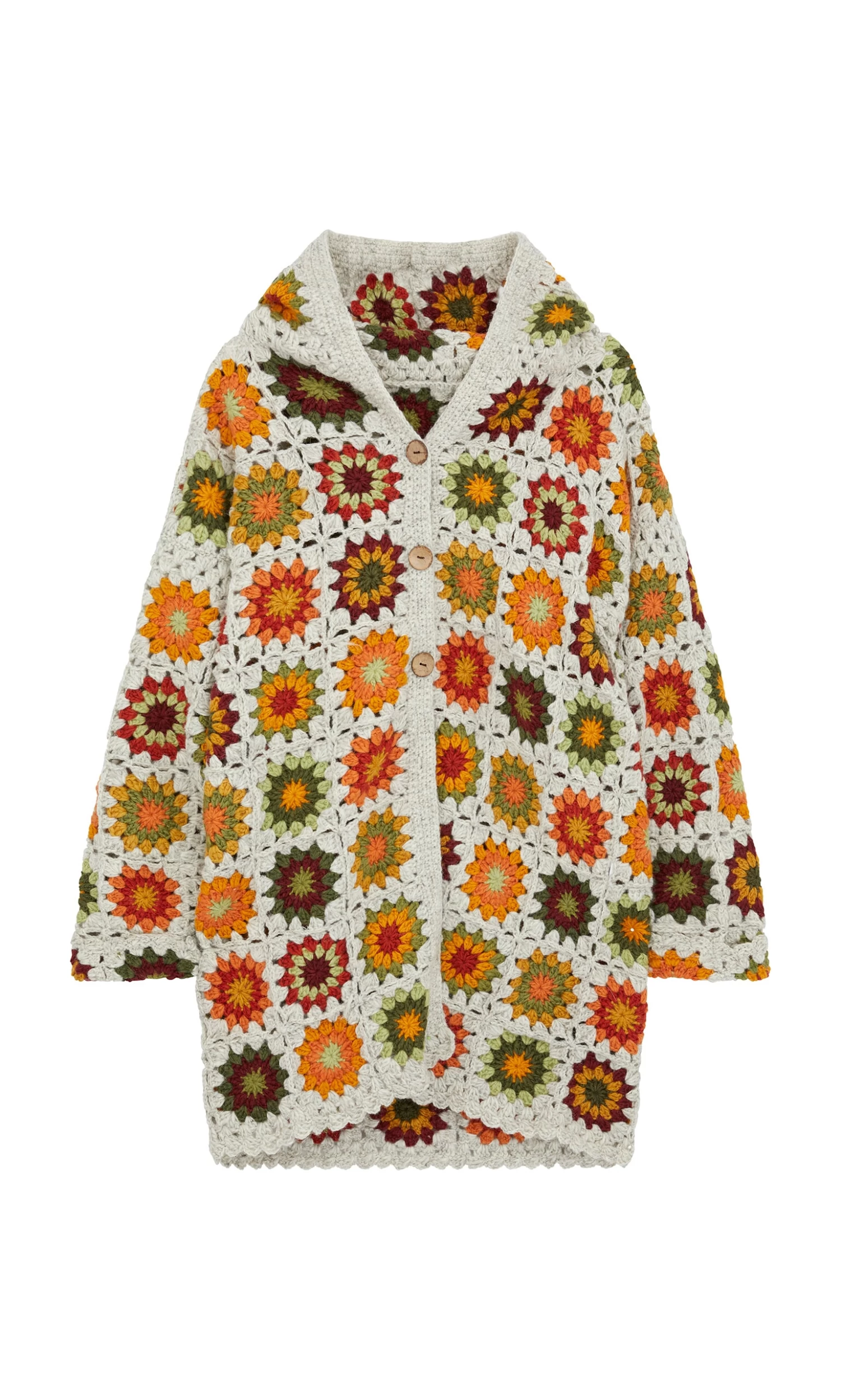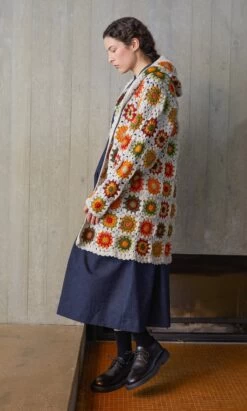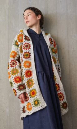 Striking longer length cardigan constructed from a riotous patchwork of crochet flowers. Integrated cosy hood with polished shell buttons fastening at the front. Hand-knitted in Nepal from pure natural wools.