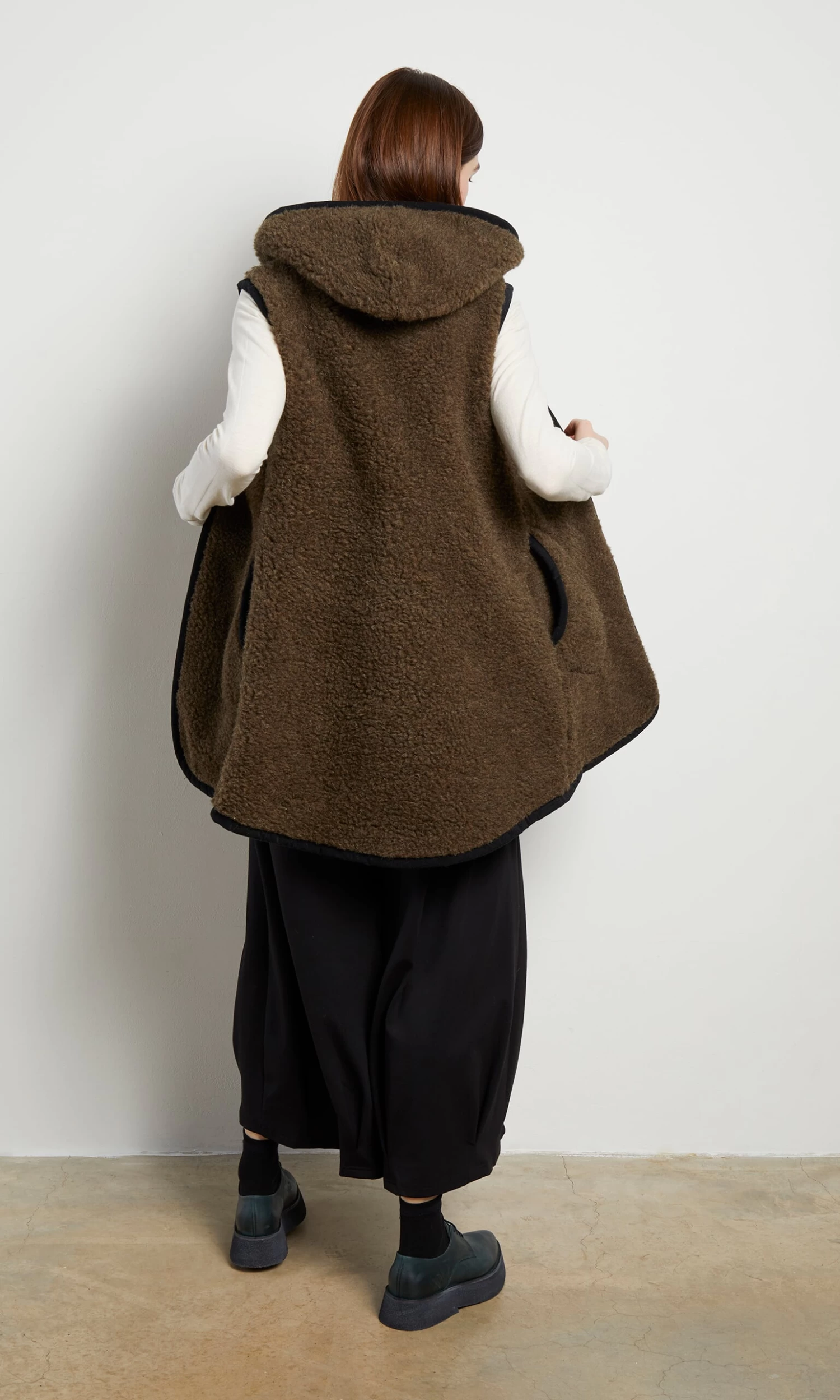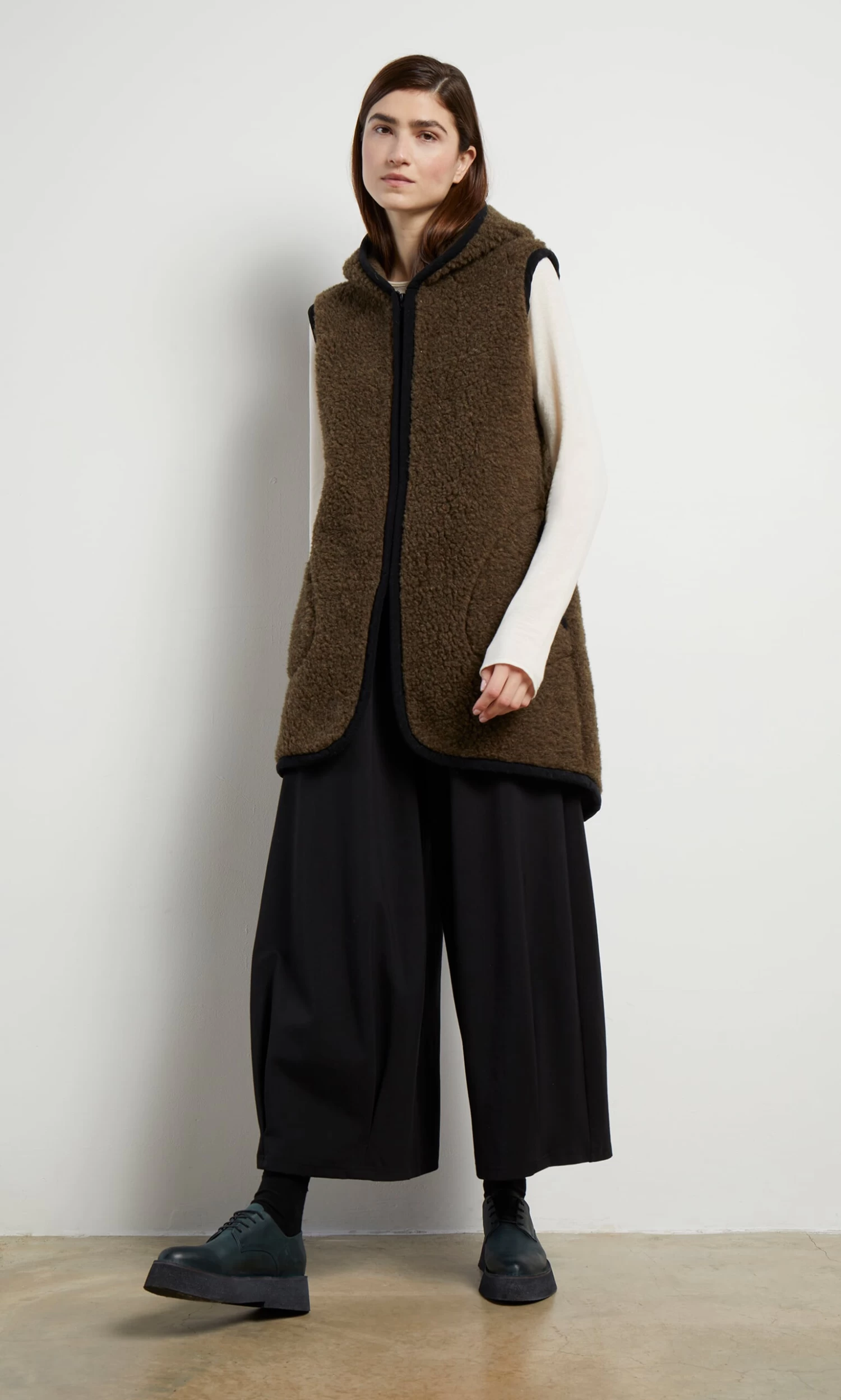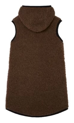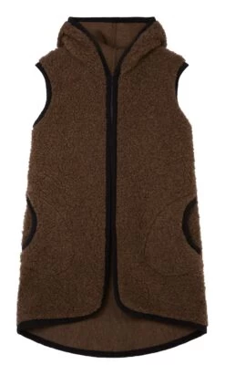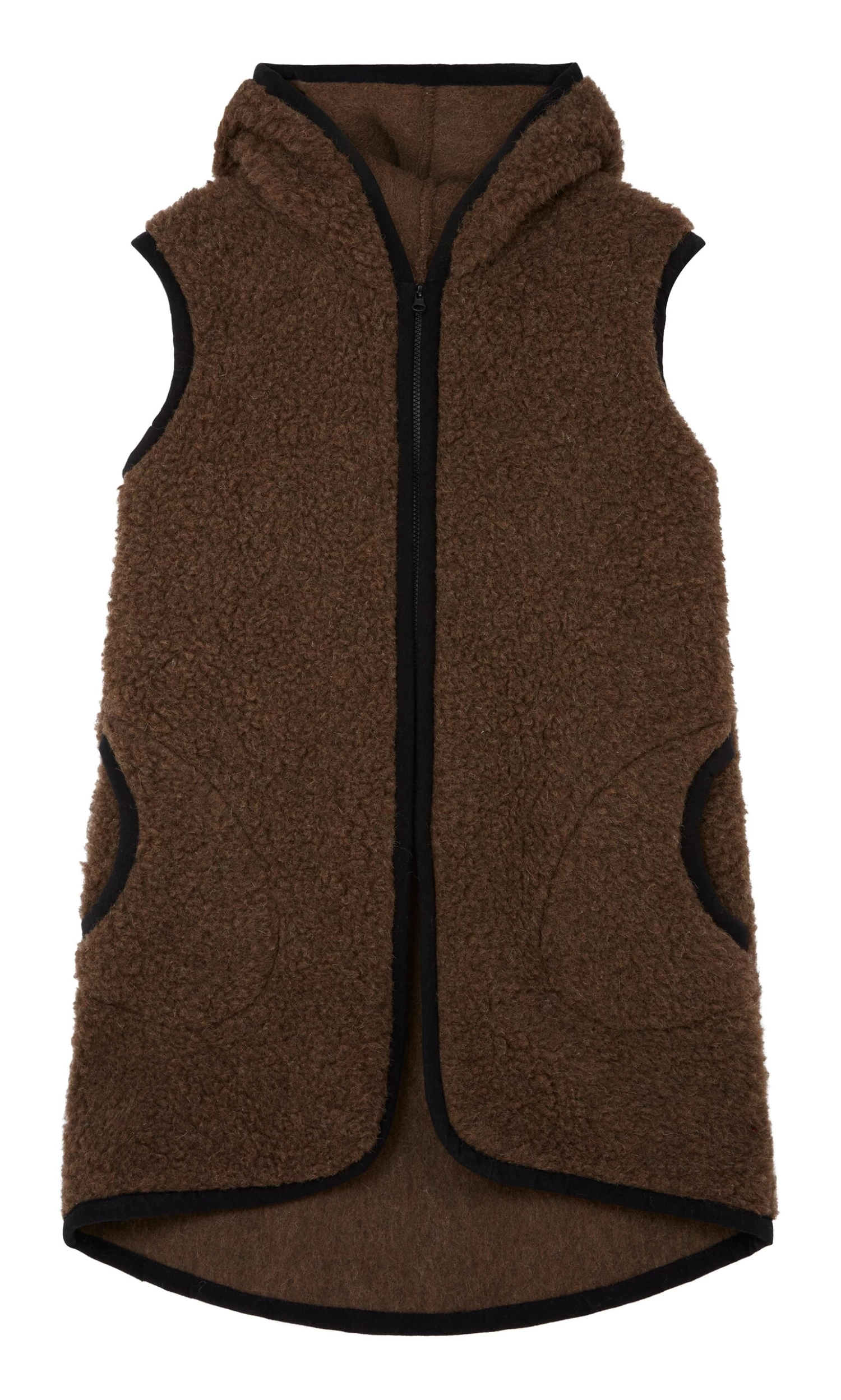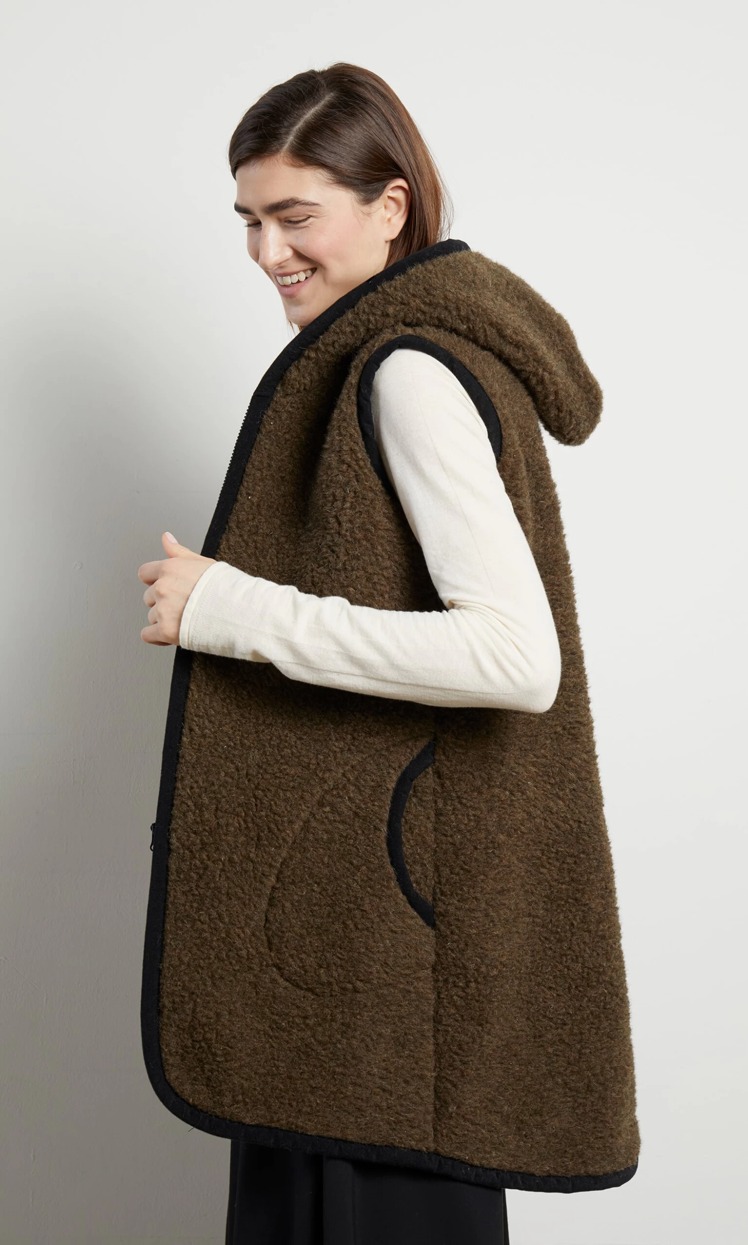 Snug lightweight gilet. Made from tactile Irish wool fleece with an integrated hood and cosy, practical front pockets. Zip fastening at front.