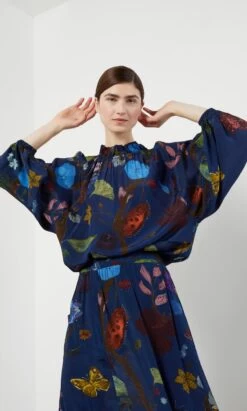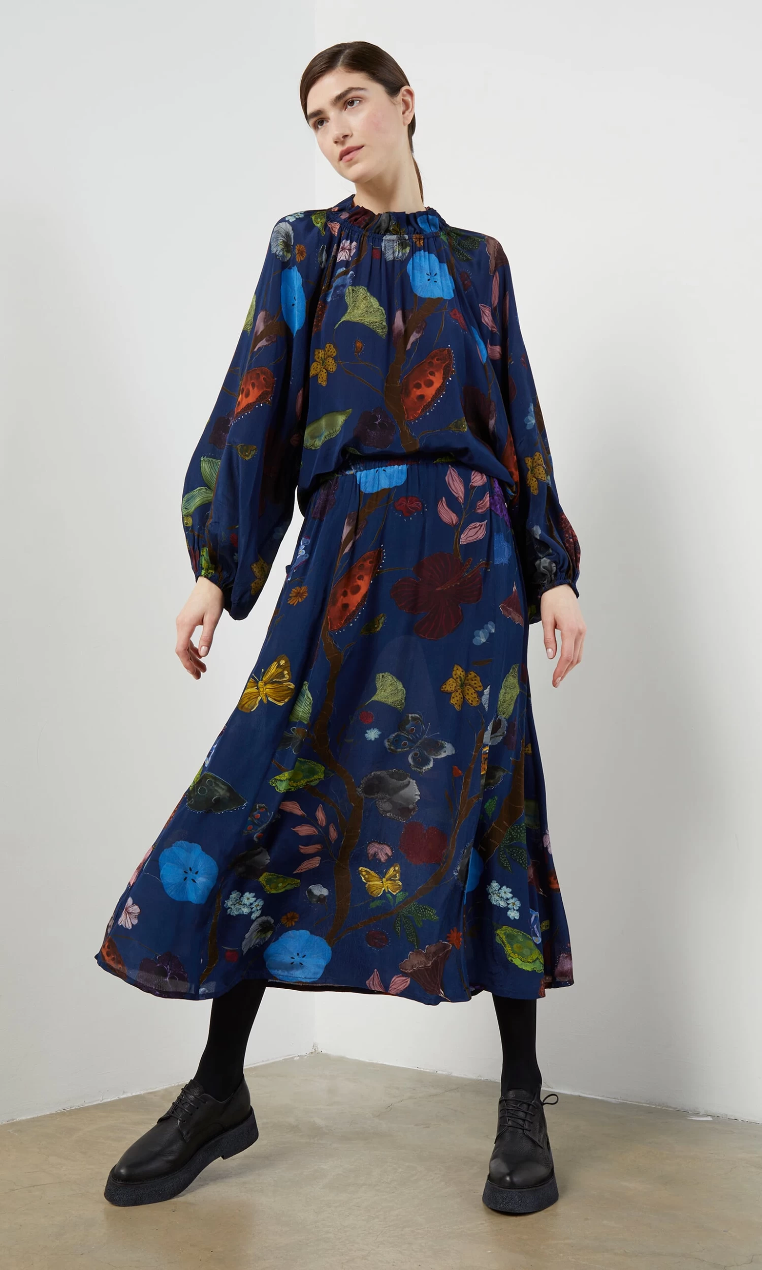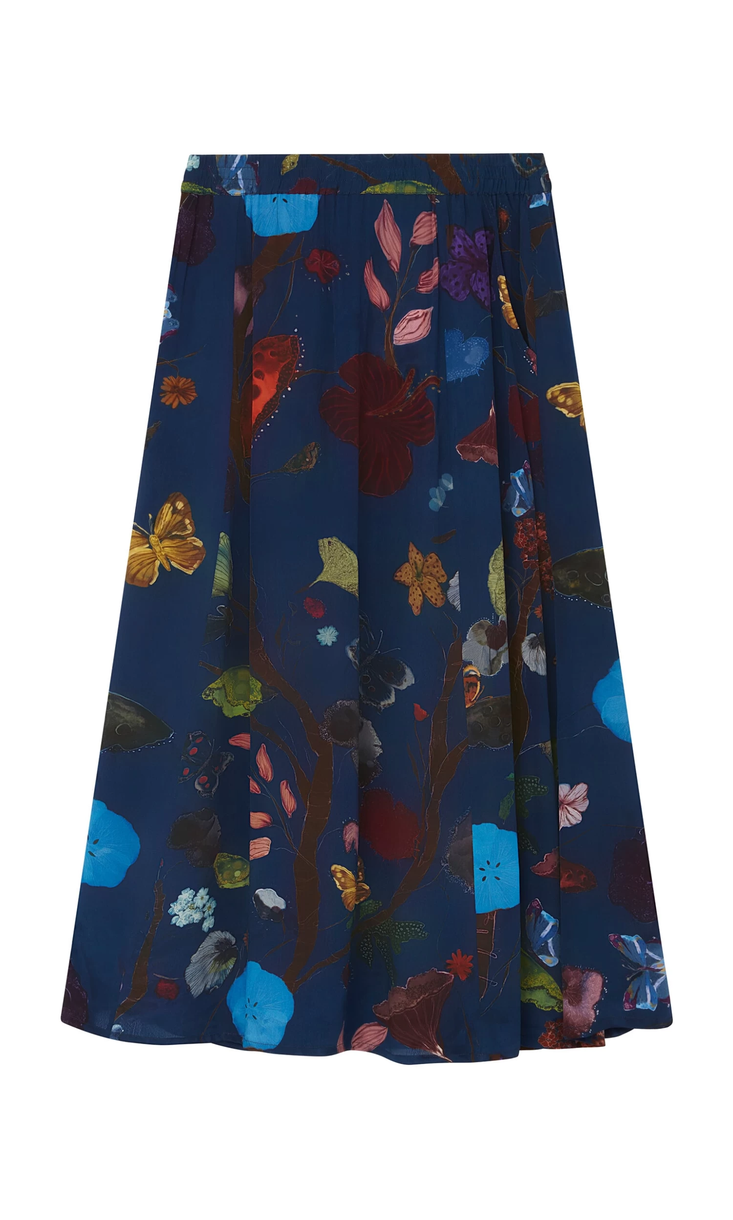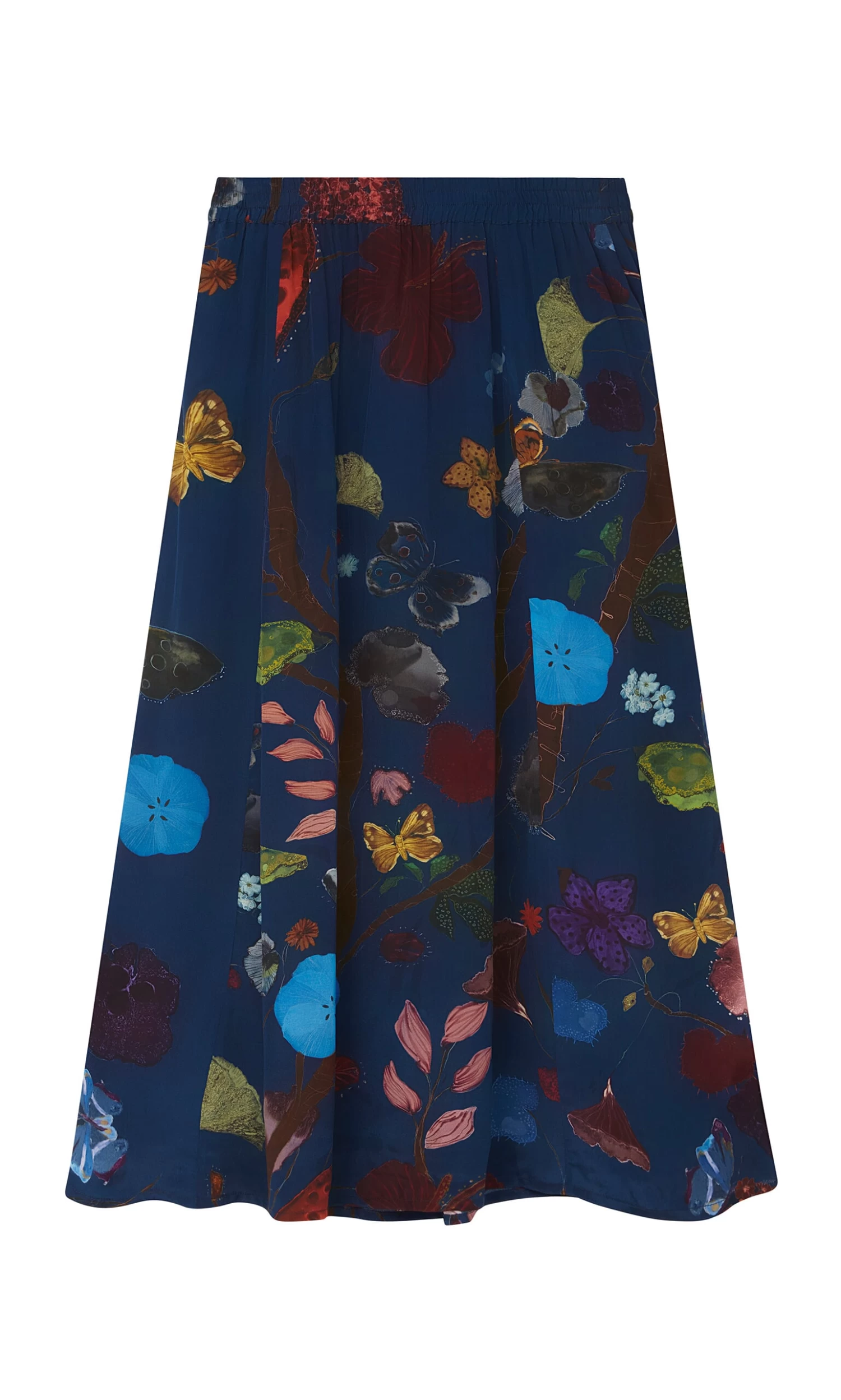 Silky indigo skirt printed in a vibrant botanical design. Gathered onto an elasticated waistband with side pockets. Easy pull-on style.