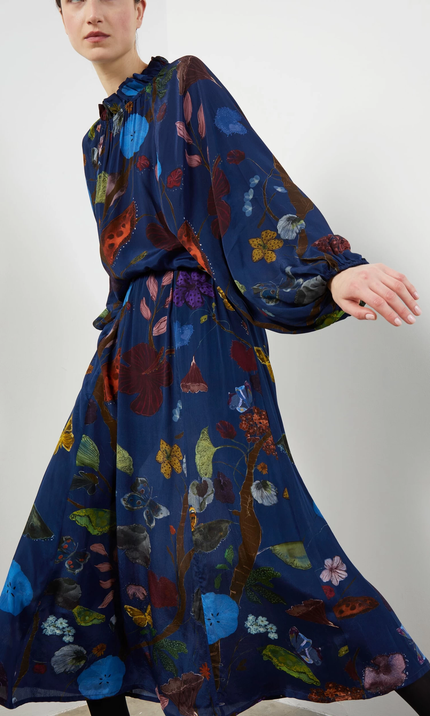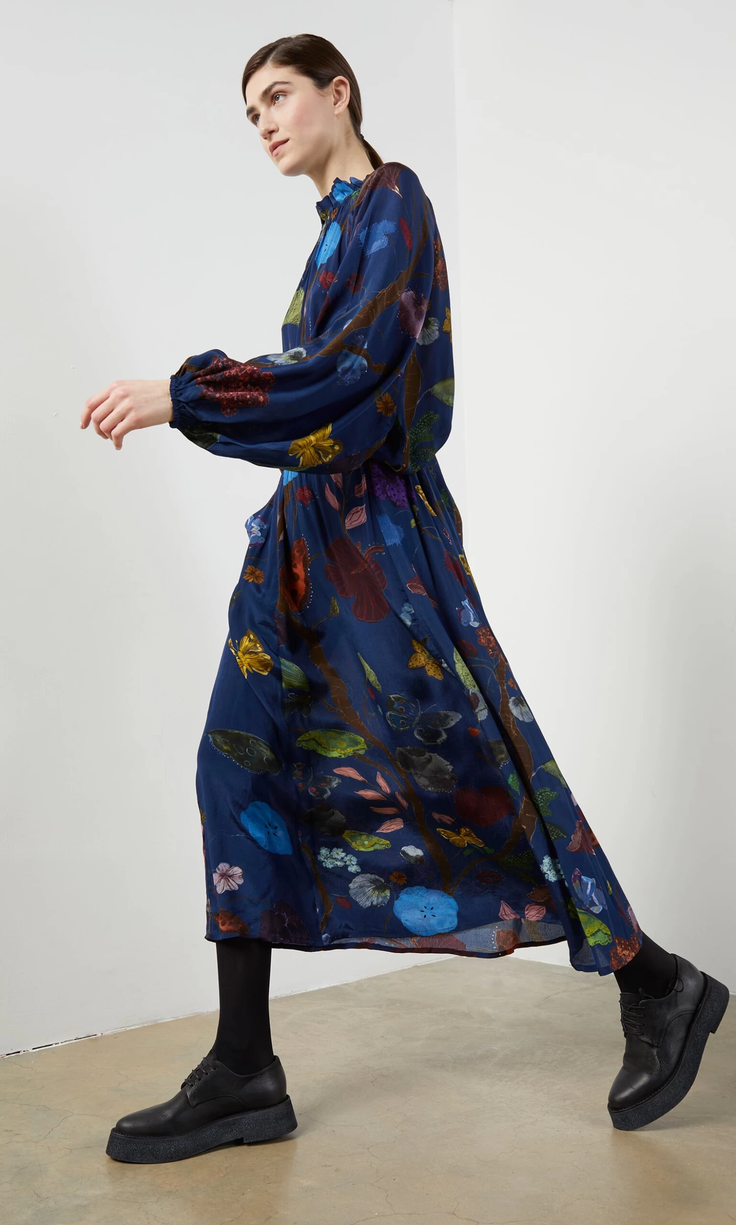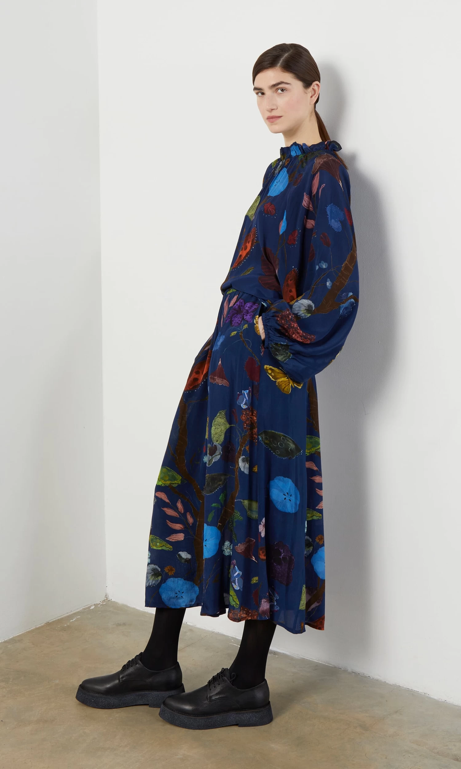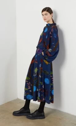 Silky indigo skirt printed in a vibrant botanical design. Gathered onto an elasticated waistband with side pockets. Easy pull-on style.
