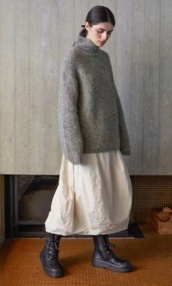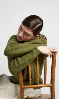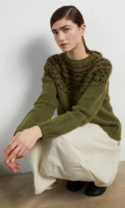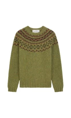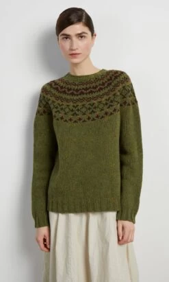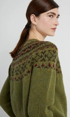 Seamless woollen sweater knitted in a flecky olive green yarn with traditional fair isle patterning around the yoke. Chunky ribbed trims around neck, cuffs and hem. Relaxed shape. Heritage production in Scotland, designs inspired by the landscapes of the Northern Isles.