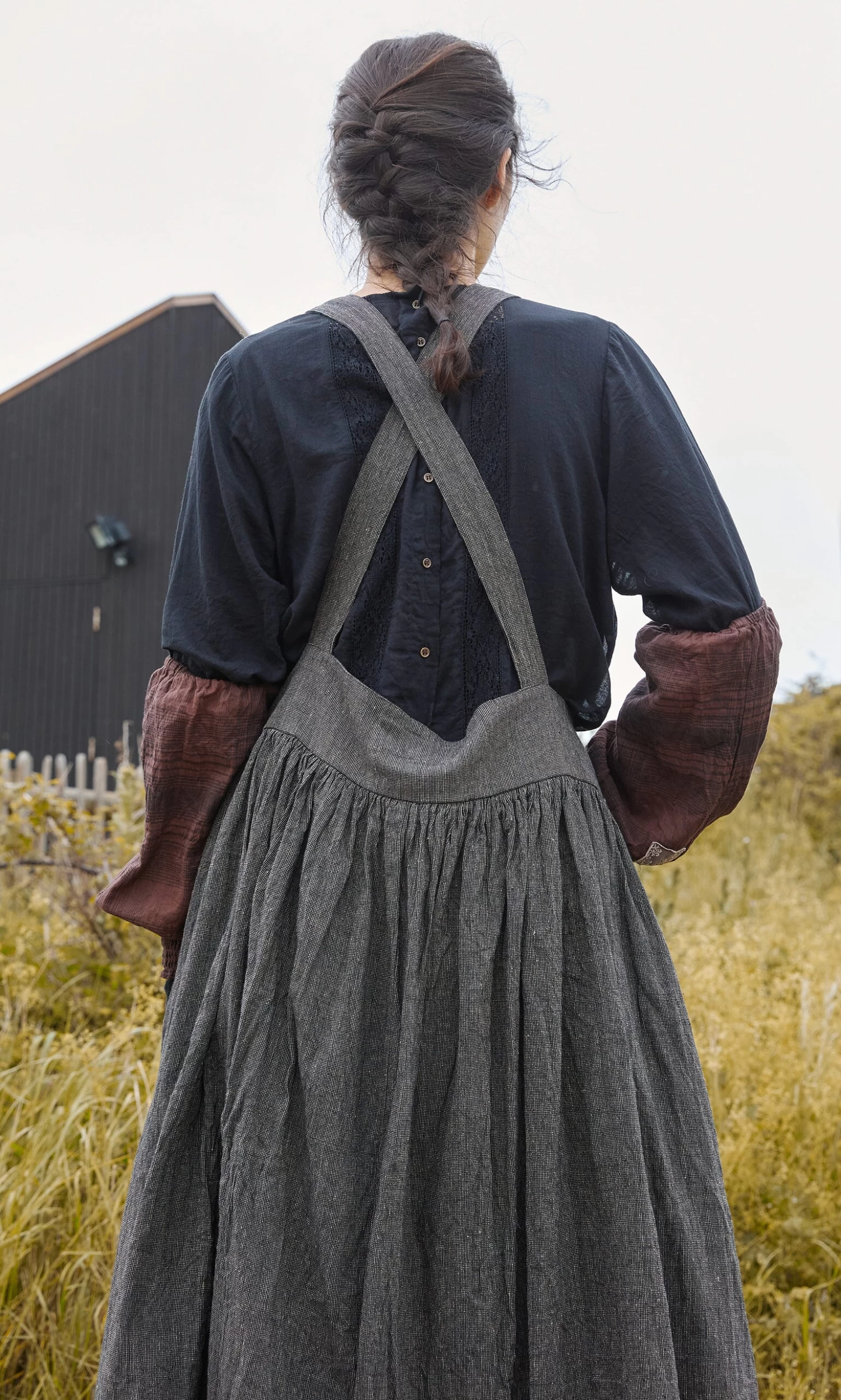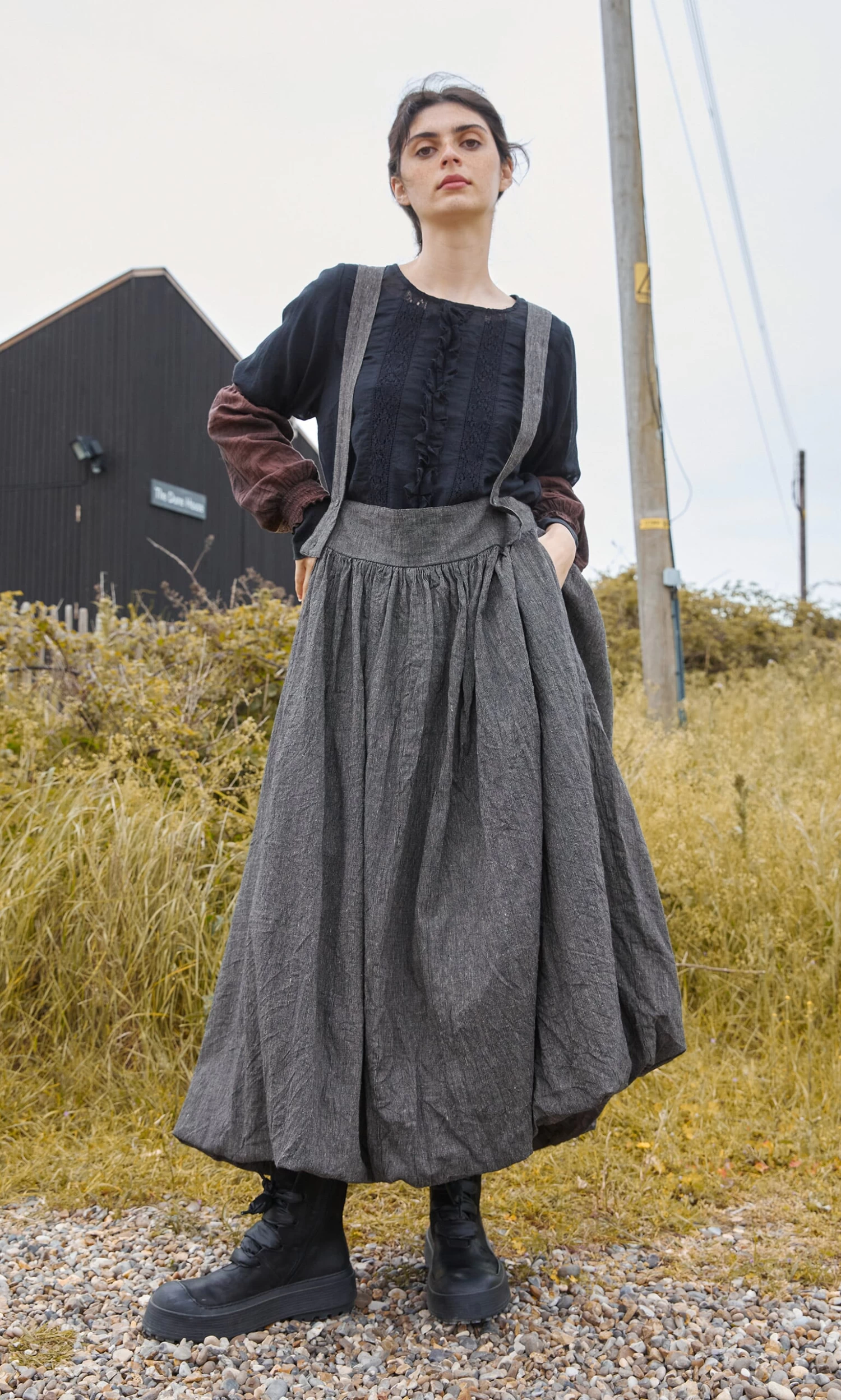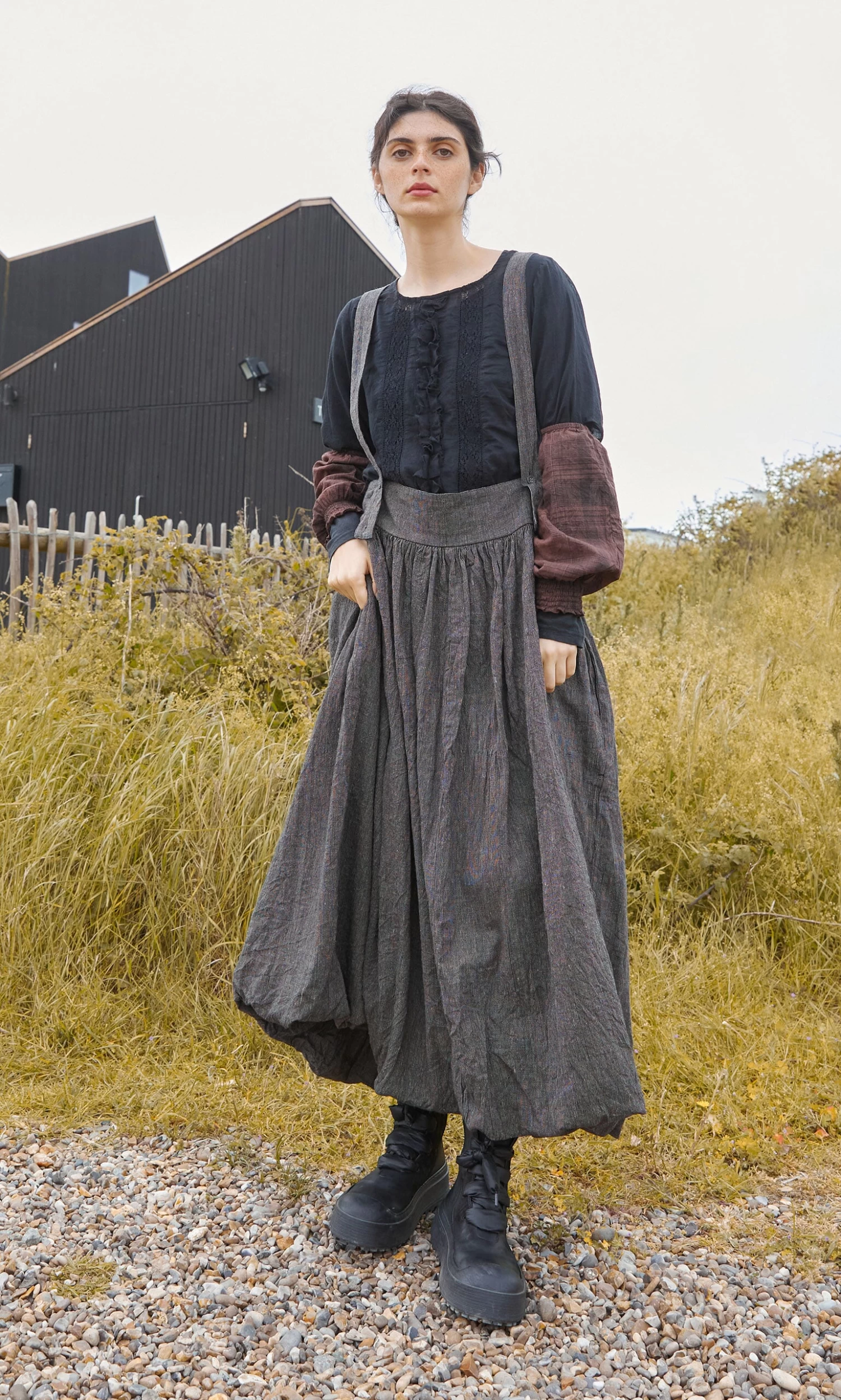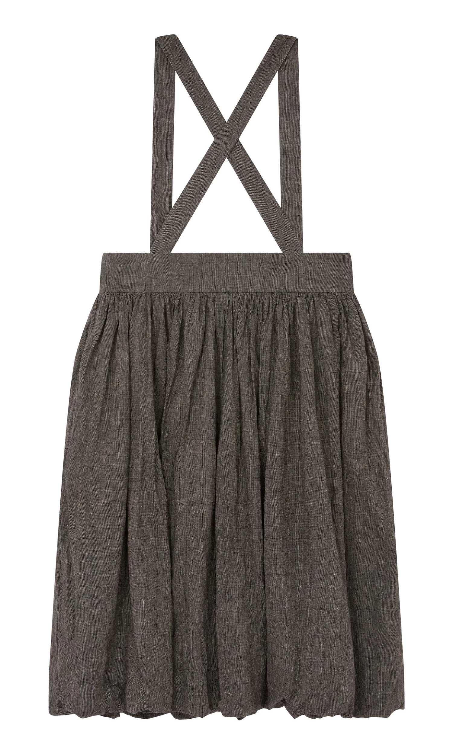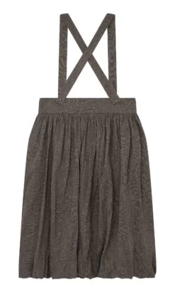 A full cotton skirt gathered onto a wide flat band with hem stitched onto the underskirt to create a blouson effect. Cut from weighty woven cotton and lined with soft fabric with adjustable button braces attached. Each piece is handmade and unique. The skirt comes with a complimentary colourful flower scarf that can be used as decorative waist tie or bandana.