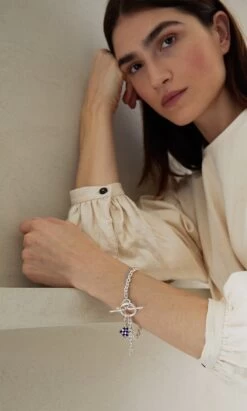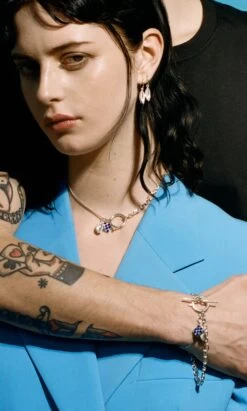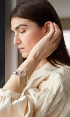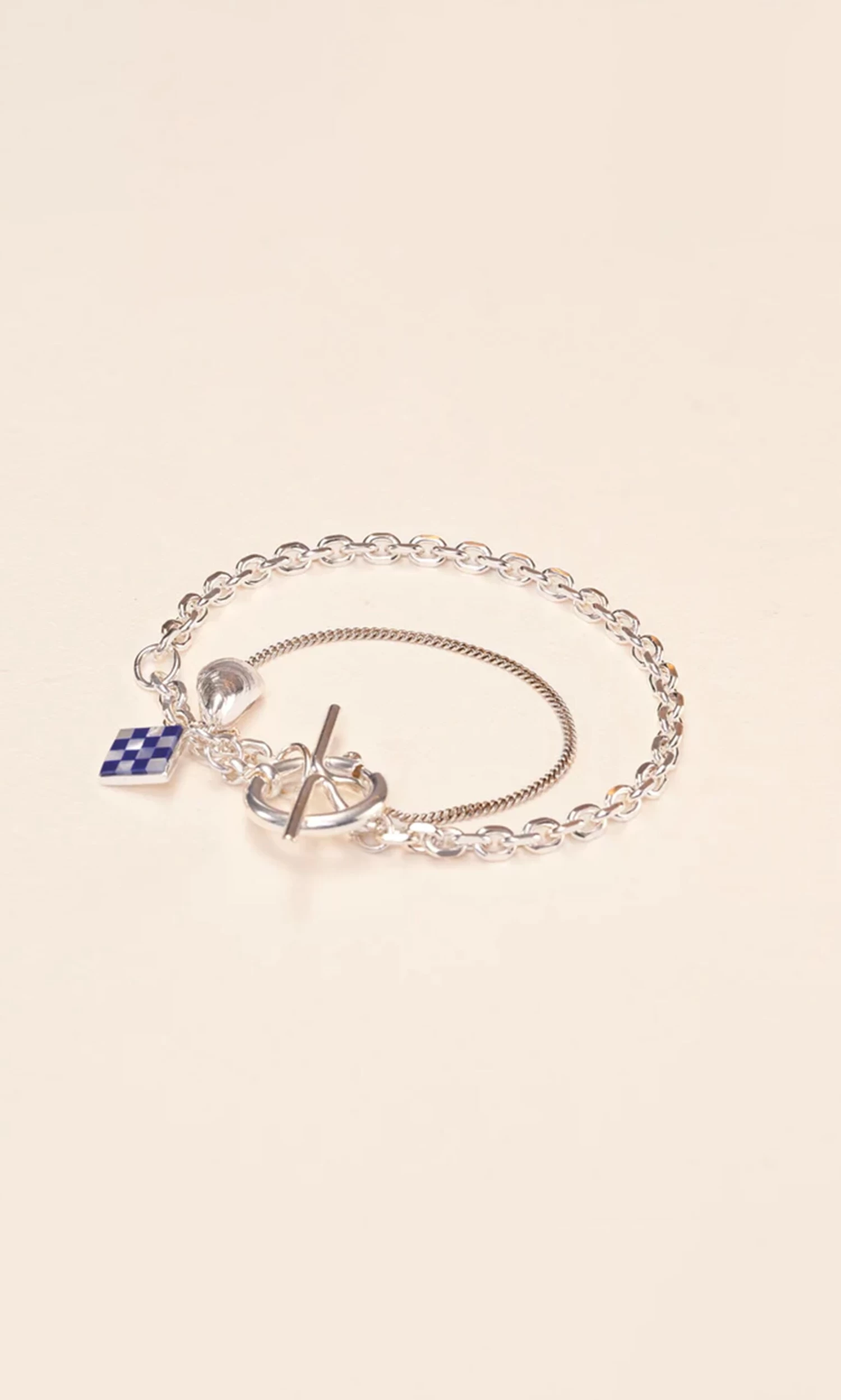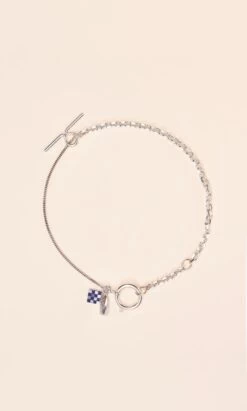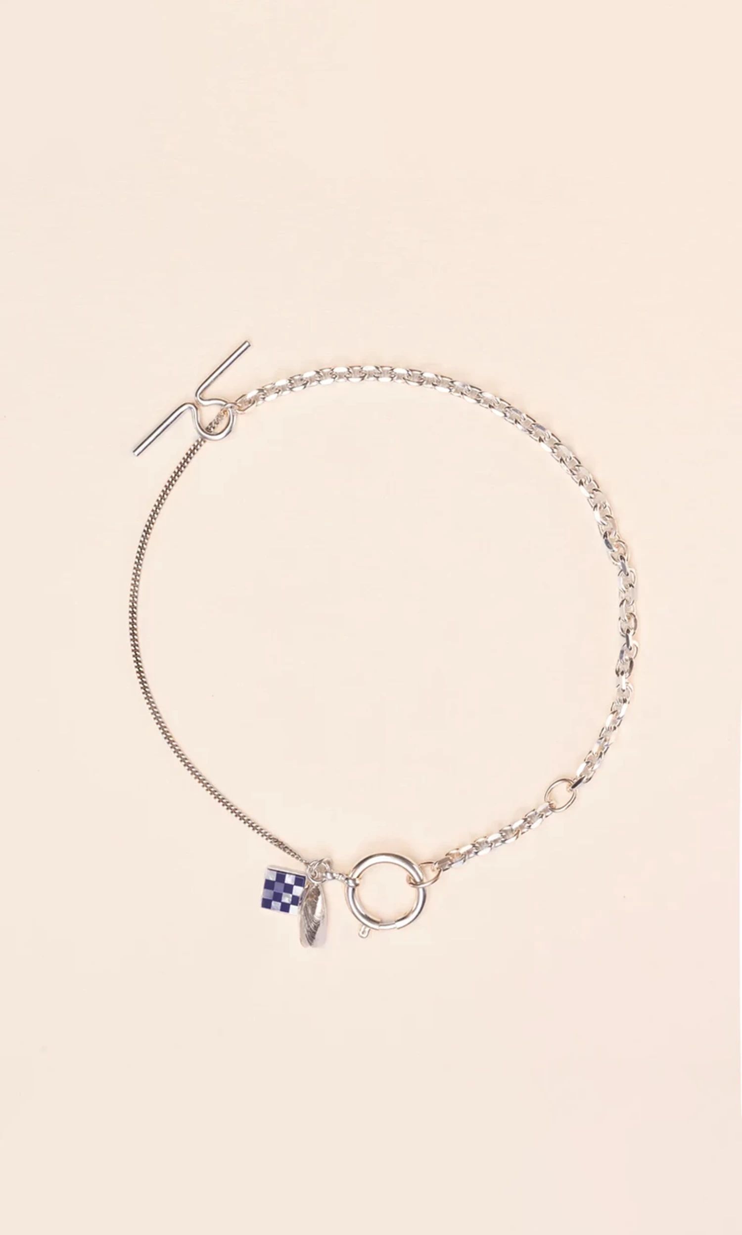 Asymmetric silver chain which can be worn as a necklace or a bracelet. With a checkerboard charm made of inlay lapis lazuli and mother of pearl and a silver plated mussel pendant as a reference to Surrealist Marcel Broodthaers. Including silver chains of two different thicknesses and a large t-clasp lock as a feature. Length as a necklace, 37cm, length as a bracelet 22cm.