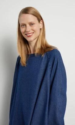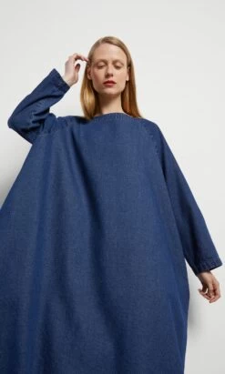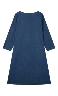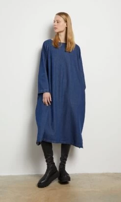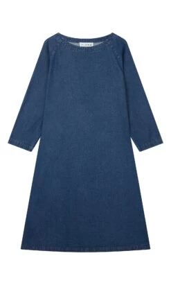A very easy to wear a line cotton dress, made from tumbled soft denim fabric. The shape is relaxed with a simple boatneck, long sleeves tapering slightly at cuffs and practical pockets. Unlined. L114cm.