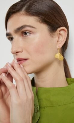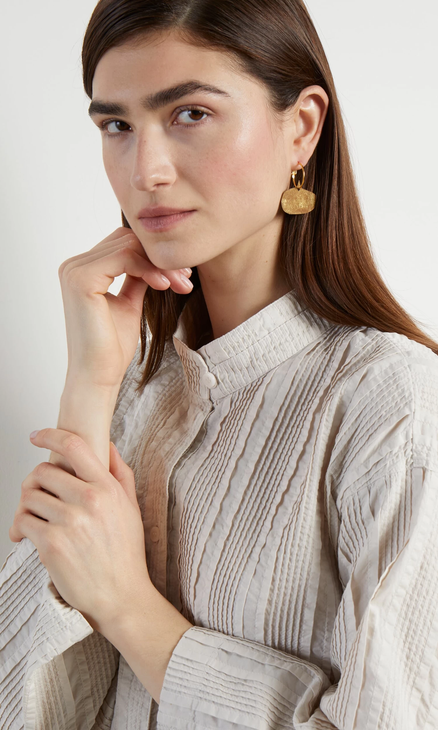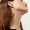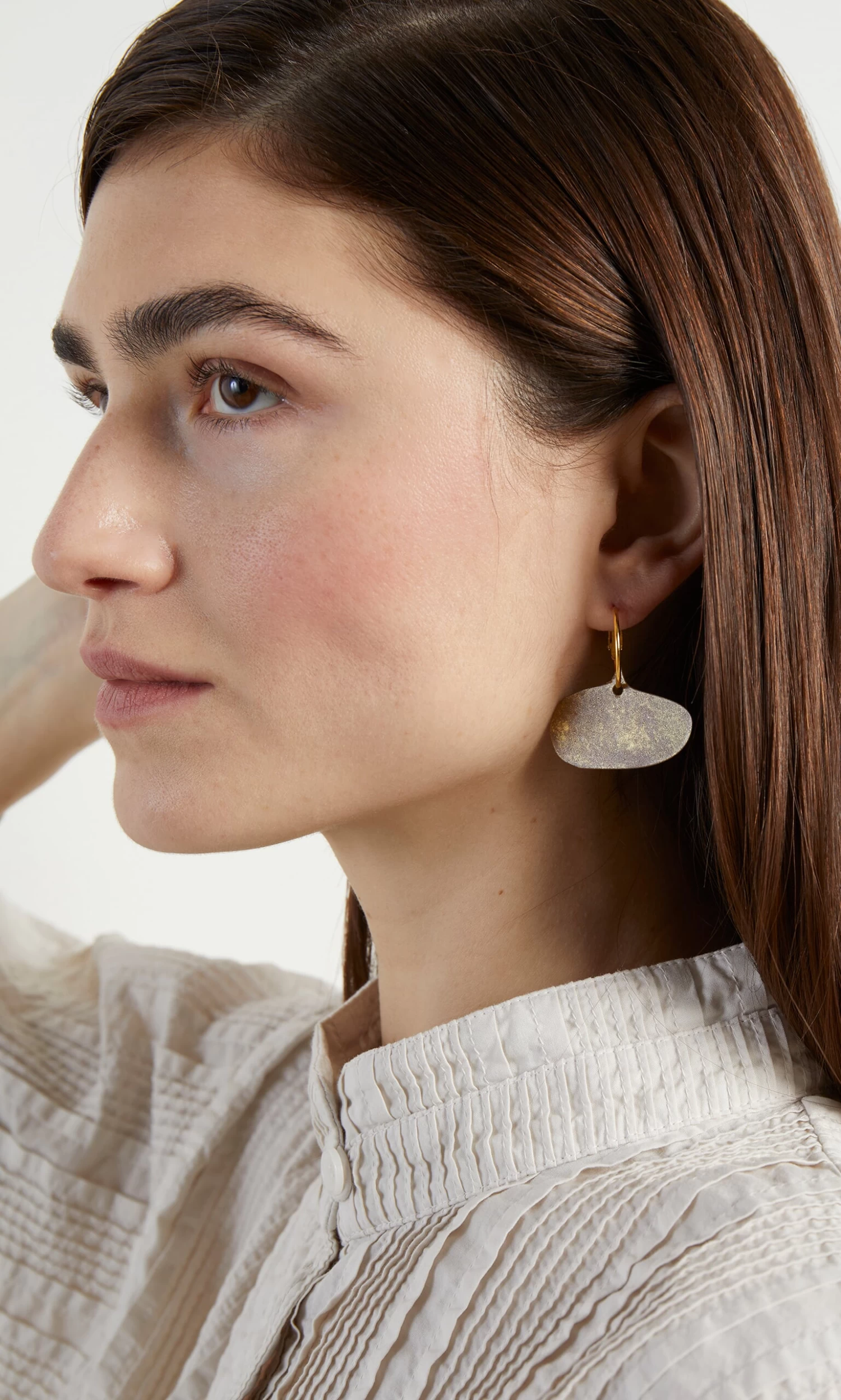 Oval discs made from textured gold plated bronze and suspended from gold hoops. Lightweight and easy to wear. Sterling silver posts. L4cm.