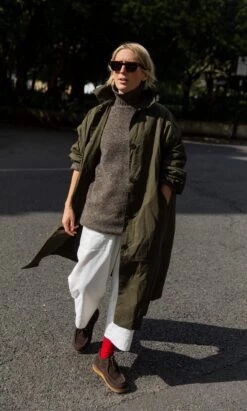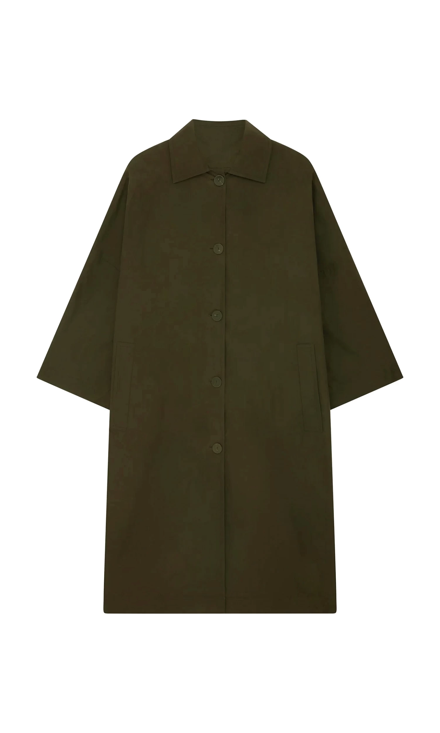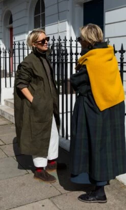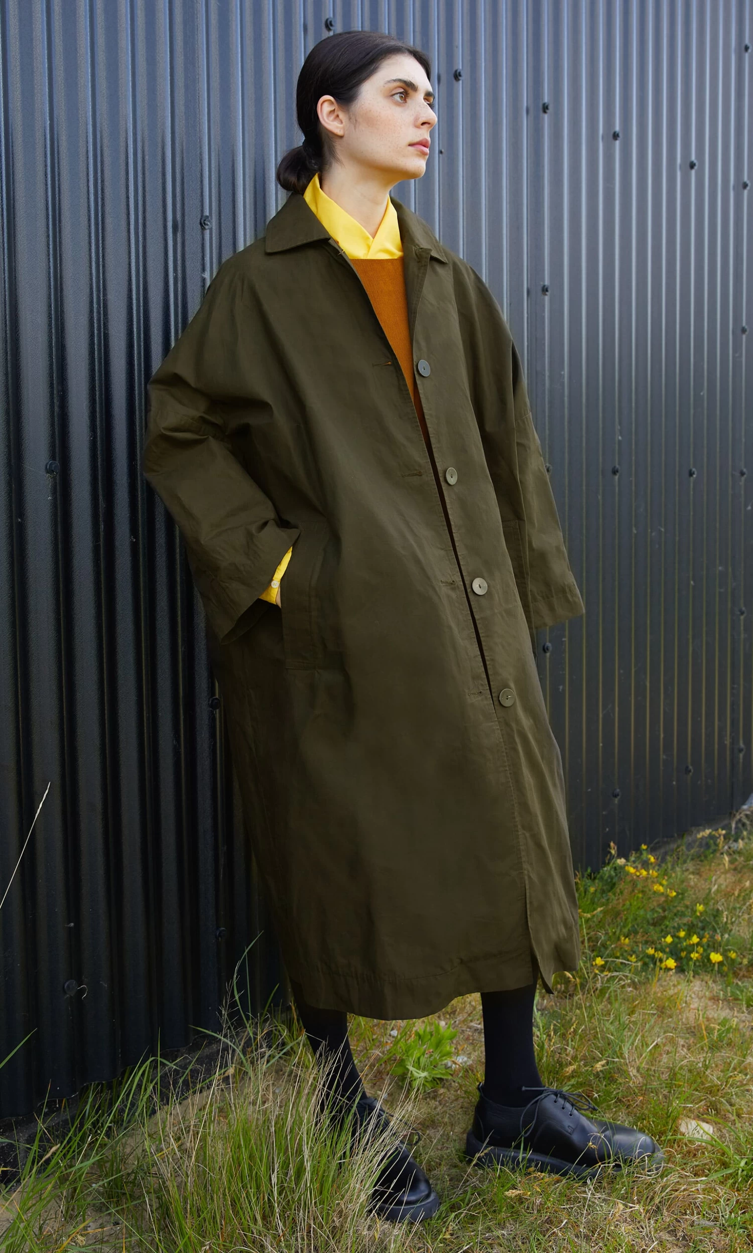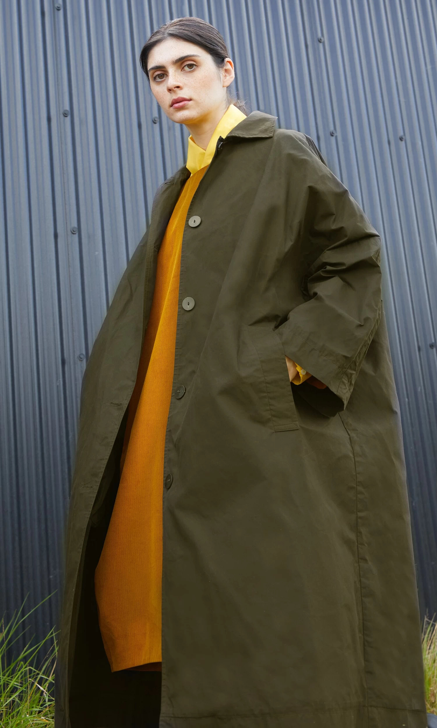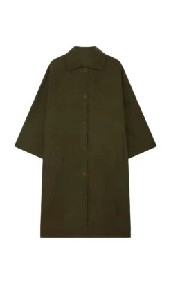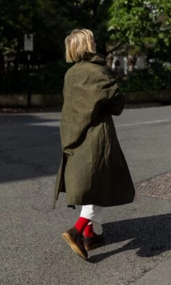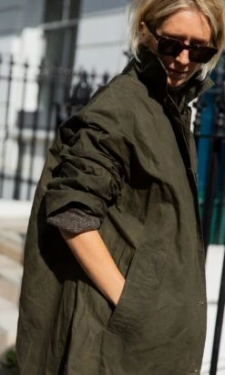 Oversized all weather coat made from moss coloured British heritage waxed cotton. The cut is generous with dropped shoulders, loose sleeves and slip-in front pockets which enhance a relaxed feel. Button-front fastening and deep back vent. Made from breathable. naturally water repelling cotton cloth. The coat is finished with dry wax and with wear, it quickly imitates vintage workwear, slightly creased and worn, which we think looks great. The coat is unlined. Made in North London. L115cm.