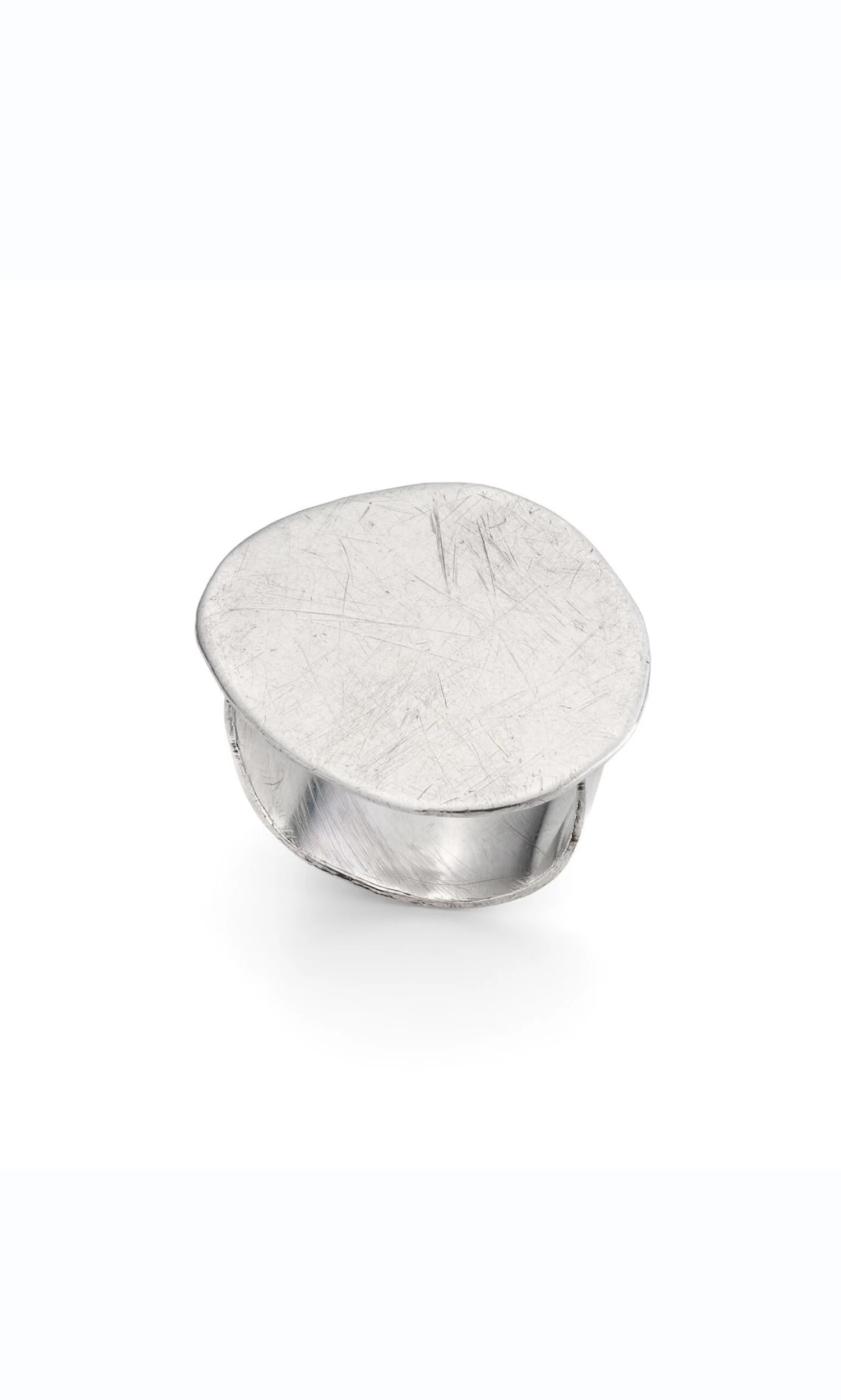 Beautiful large silver pebble-shaped ring with a definite 50s feel. It’s made from textured, scratched eco-silver, designed to look old and treasured. A real statement piece, which can be stylised by itself or with other silver wears you already have. It measures 2cm wide by 3cm long and sits at an angle on your finger. Satin finished . There might be slight variation because the ring is handmade by a local jewellery designer.