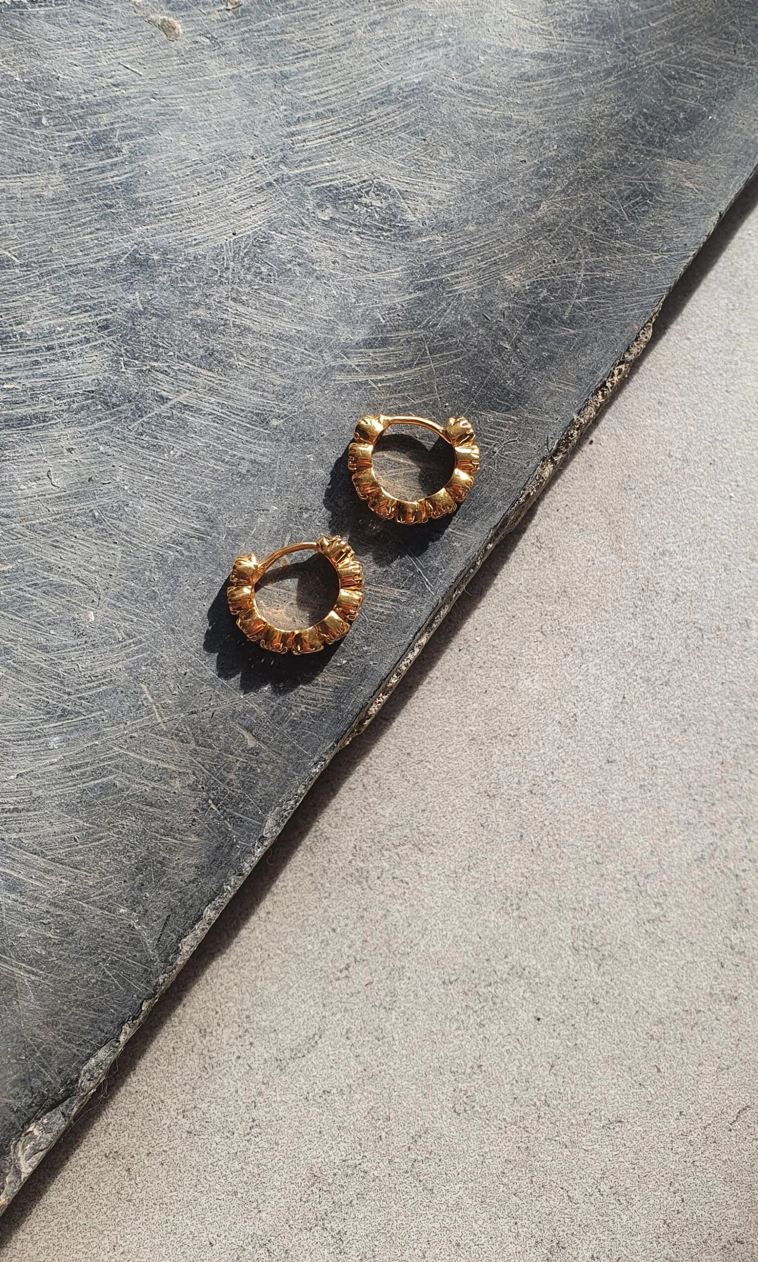 Huggie style small hoop earrings formed of eight small crystals. With an invisible hinge fastening which snaps into place. Handmade in London from 22ct gold on sterling silver. Hypoallergenic.