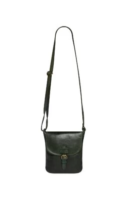 Neat dark green crossbody bag crafted from supple tumbled leather. Artisanal brass buckled front flap with concealed magnetic stud. Exterior and interior zipped pockets for stashing your valuables. Adjustable strap. Lined. H20cm W19cm D5cm.