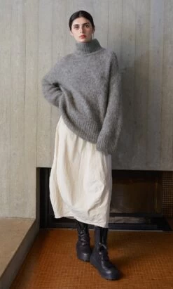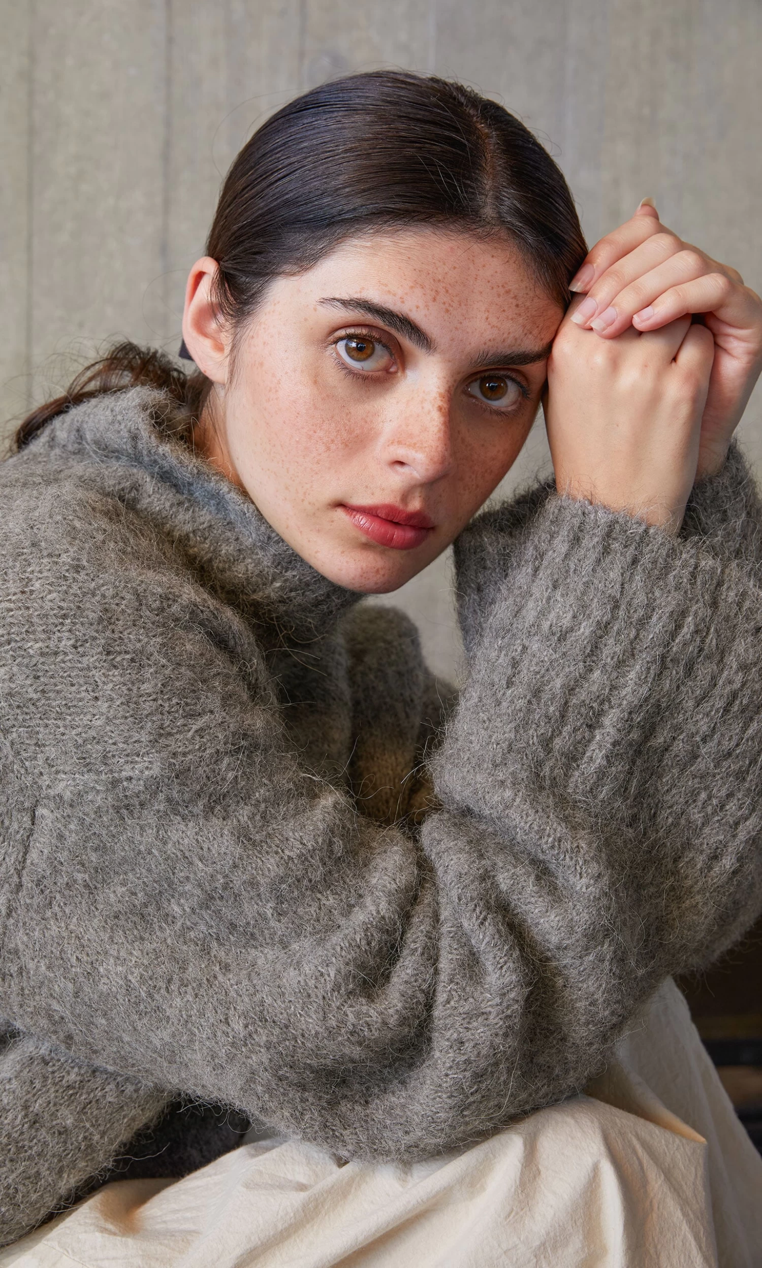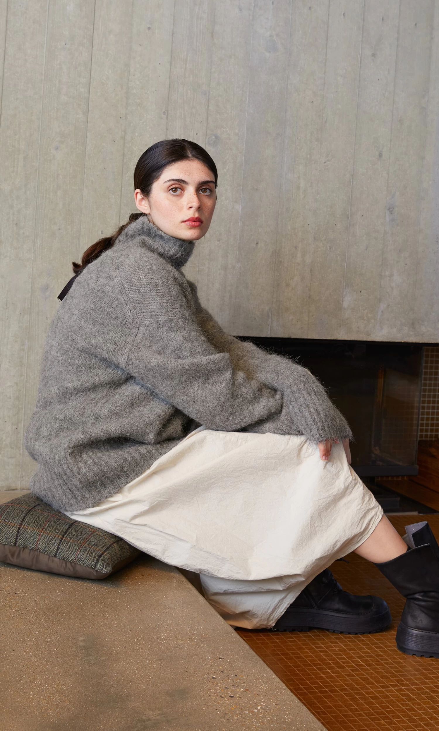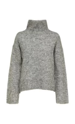 Tufty grey marled roll neck jumper in a warm, airy knit. Relaxed dropped-shoulder shape with integral chunky rib-knit roll neck, cuffs and hem. Responsibly crafted. L64cm