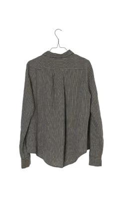 A beautiful shirt in grey linen with fine stripe. With generous collar and mother of pearl buttoning at the front. The back yoke has a box pleat which creates very gentle volume. Full length sleeves with buttoned cuffs. Subtly curved hem with relaxed fit. Designed in Sweden by nygårdsanna.