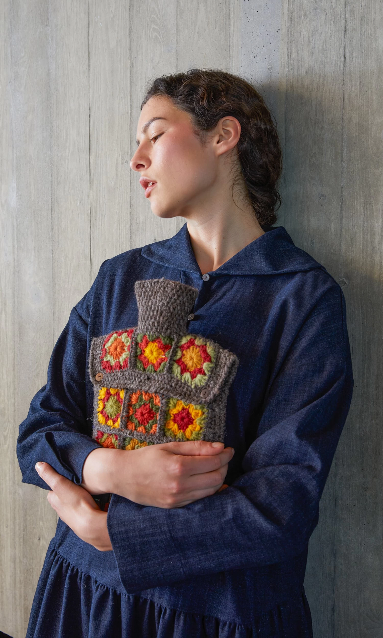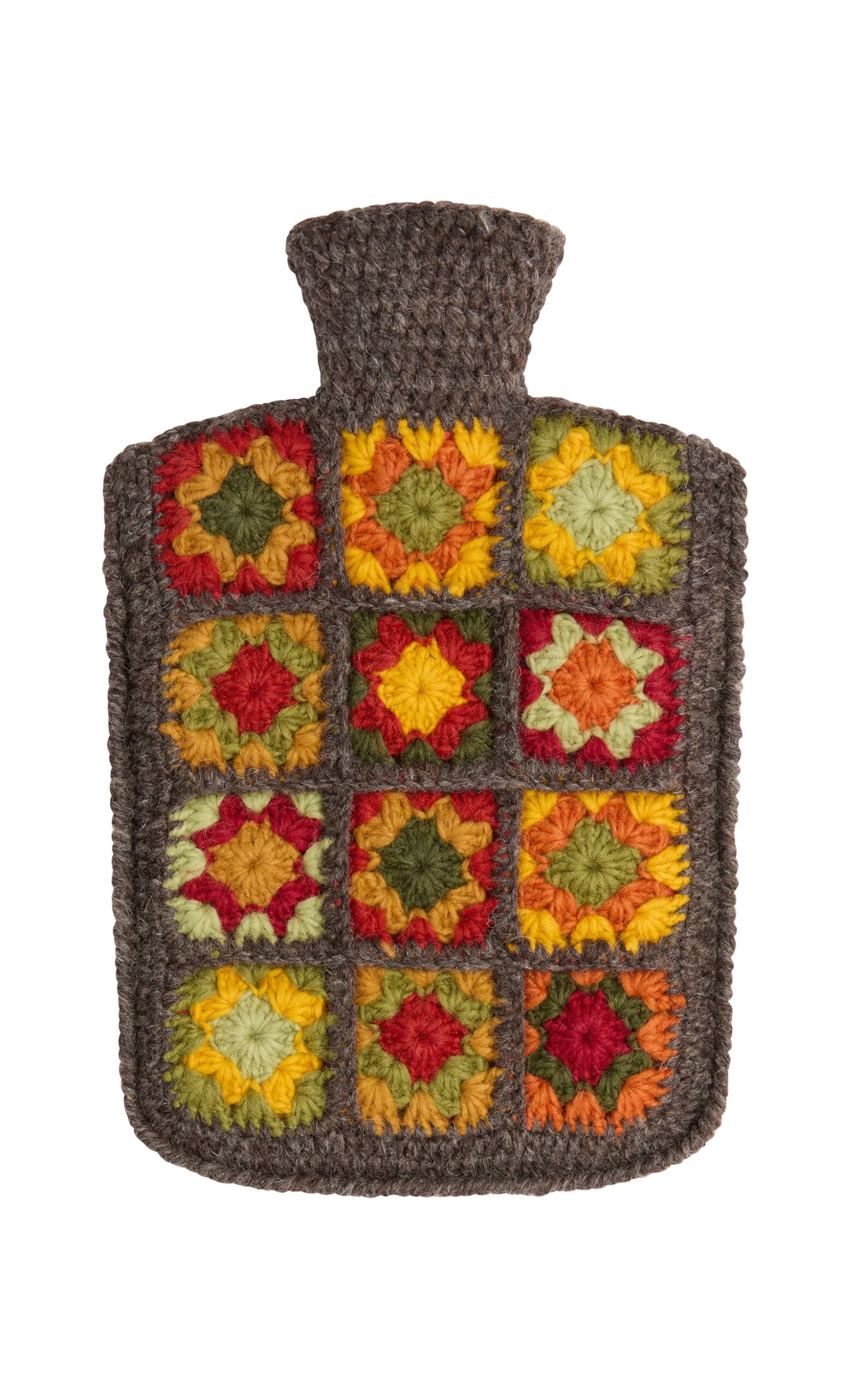 Handknitted hot water bottle cover in a cheerful patchwork of crochet flower squares. Button opening. Standard rubber hot water bottle included. Handcrafted in Nepal from pure natural wools. Fairtrade production.