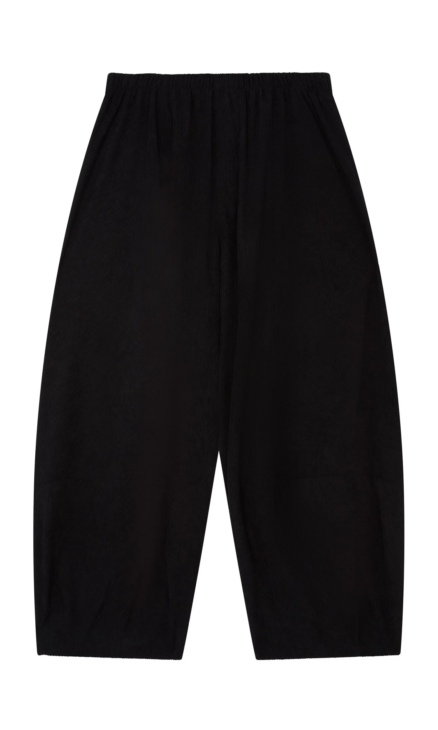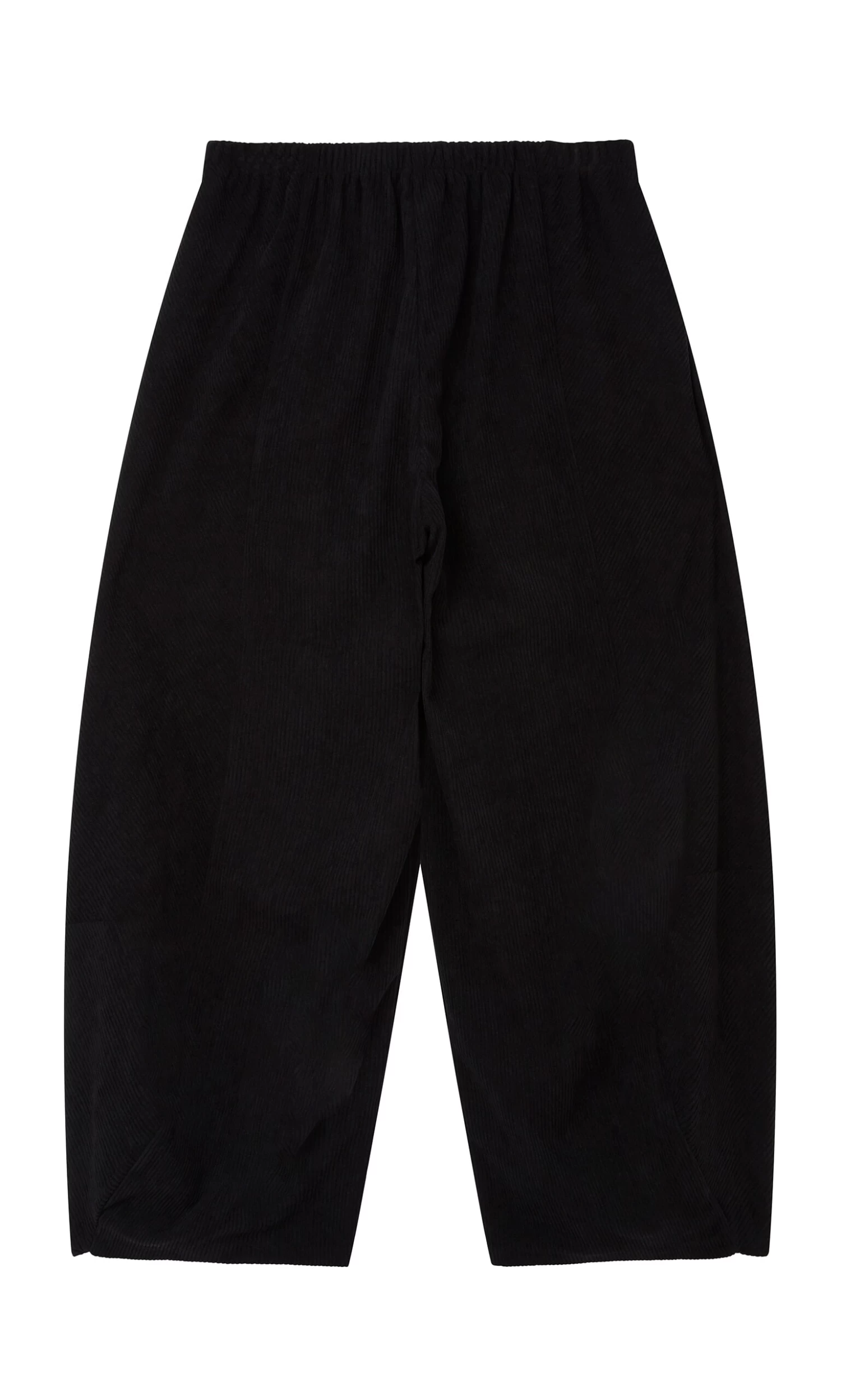 Corduroy balloon-leg pants gently gathered onto an elasticated waistband with inverted pleating at cuffs lending structure to the shape. Easy, pull on style with some added stretch for optimum comfort. Side seam pockets.