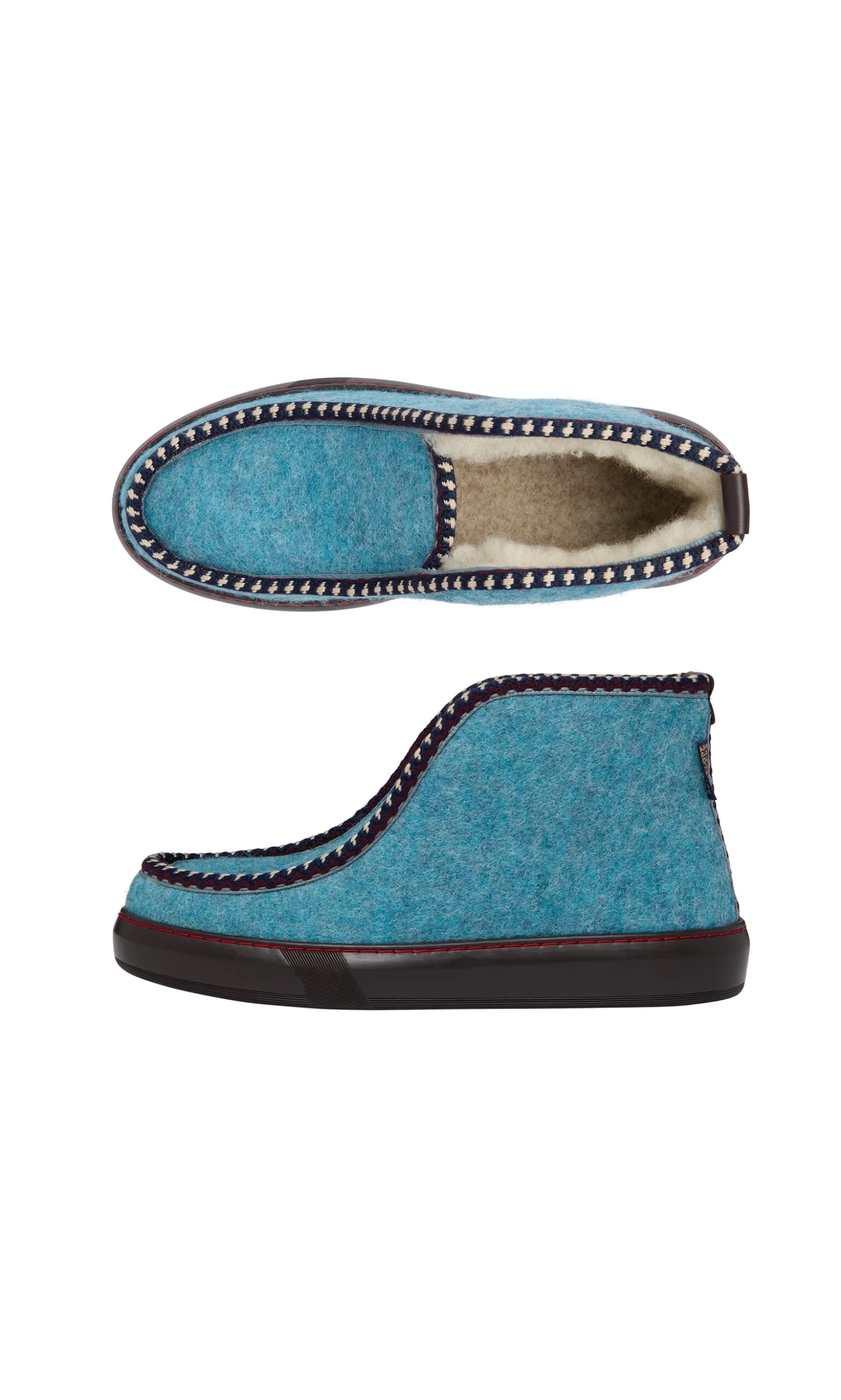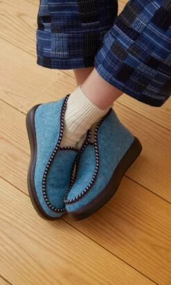 Chambray blue wool felt slippers in a retro shape, luxuriously lined in softest fleece and embellished with artisanal braided trims. Sturdy rubber outsoles mean they can be worn outside. Made in Spain. Penelope Chilvers.