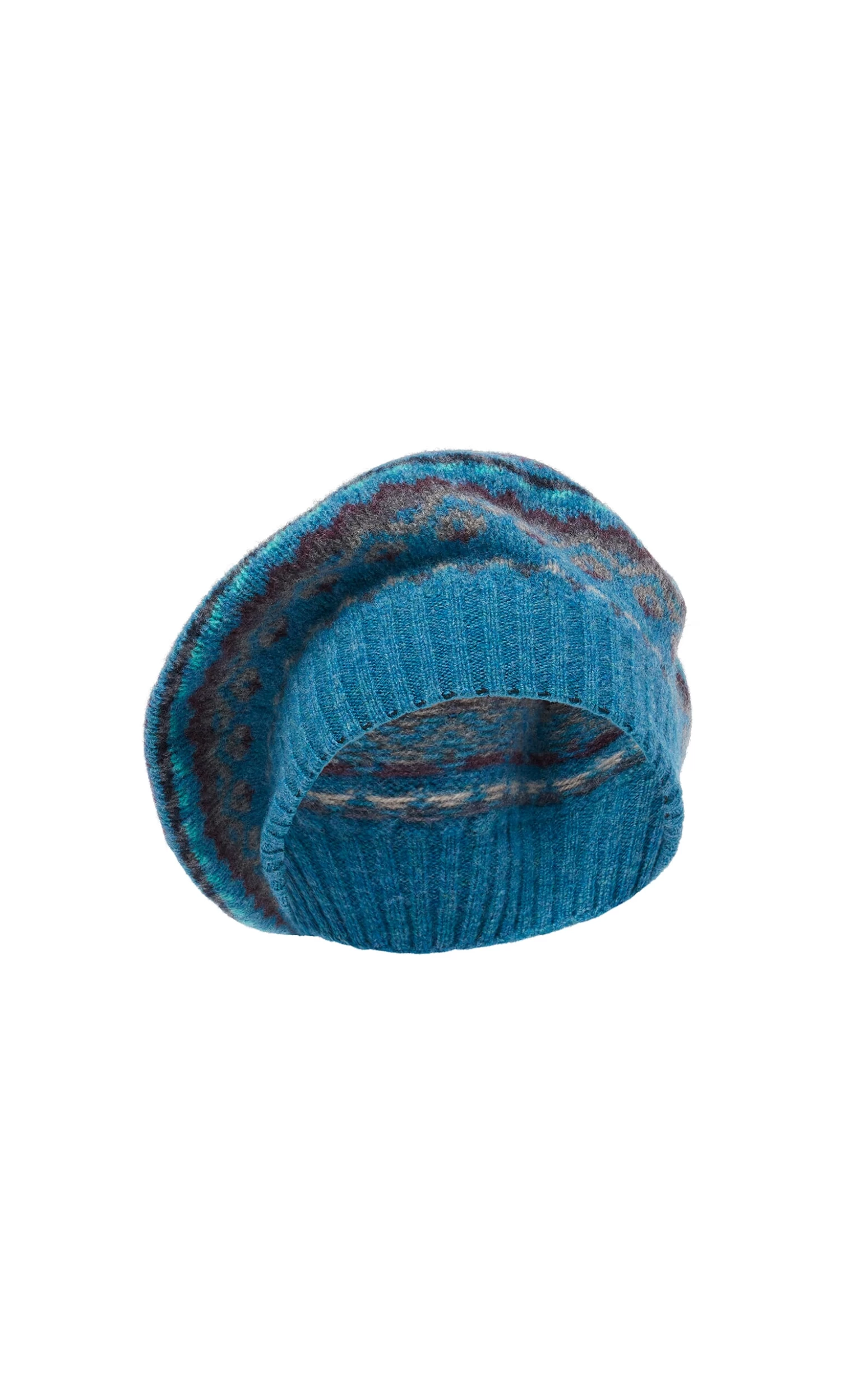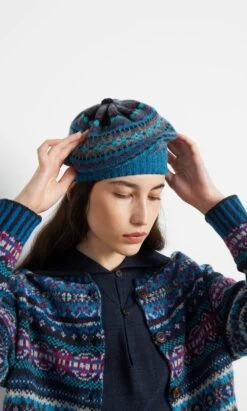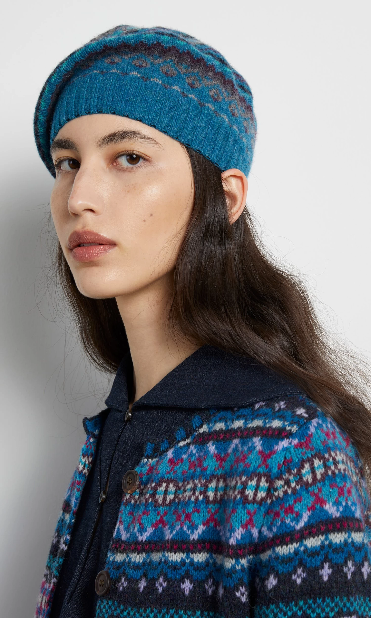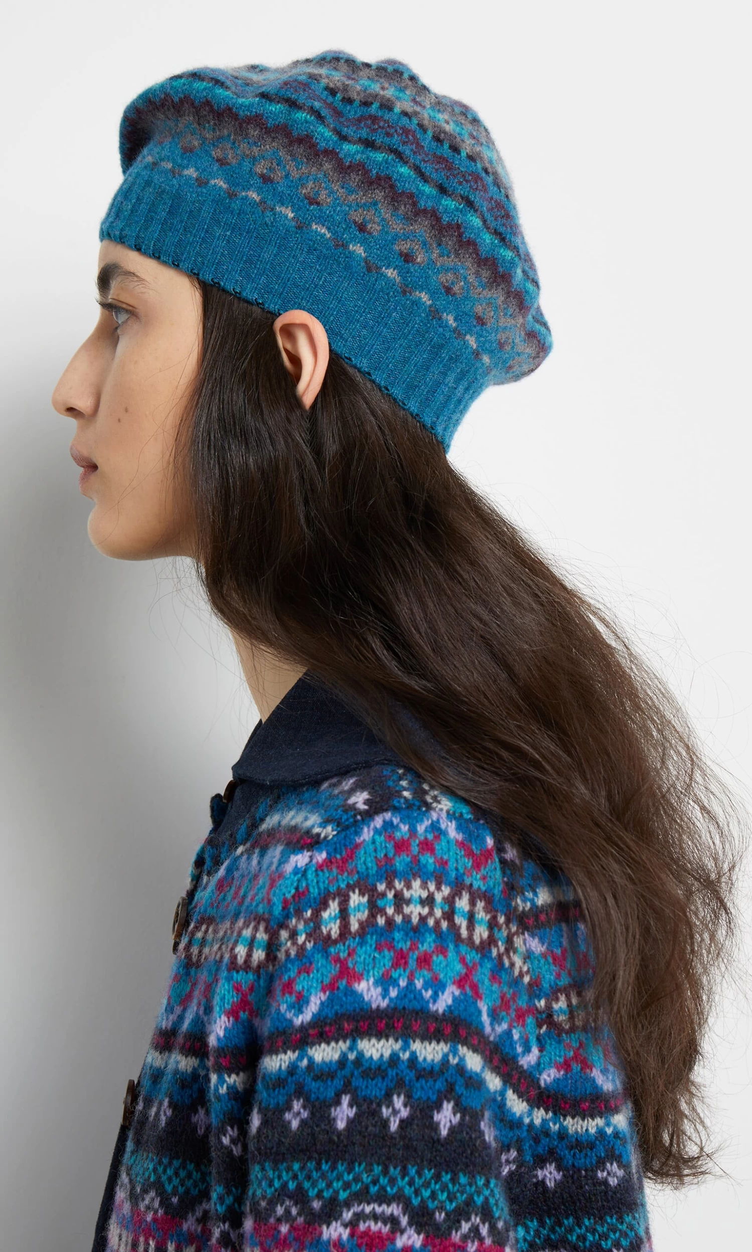 Soft lambswool beret in a mix of fair isle patterning and crowned with a tiny pompom.