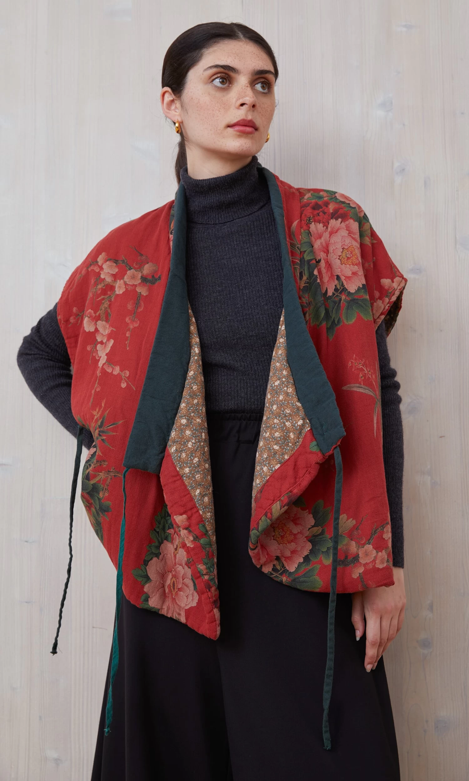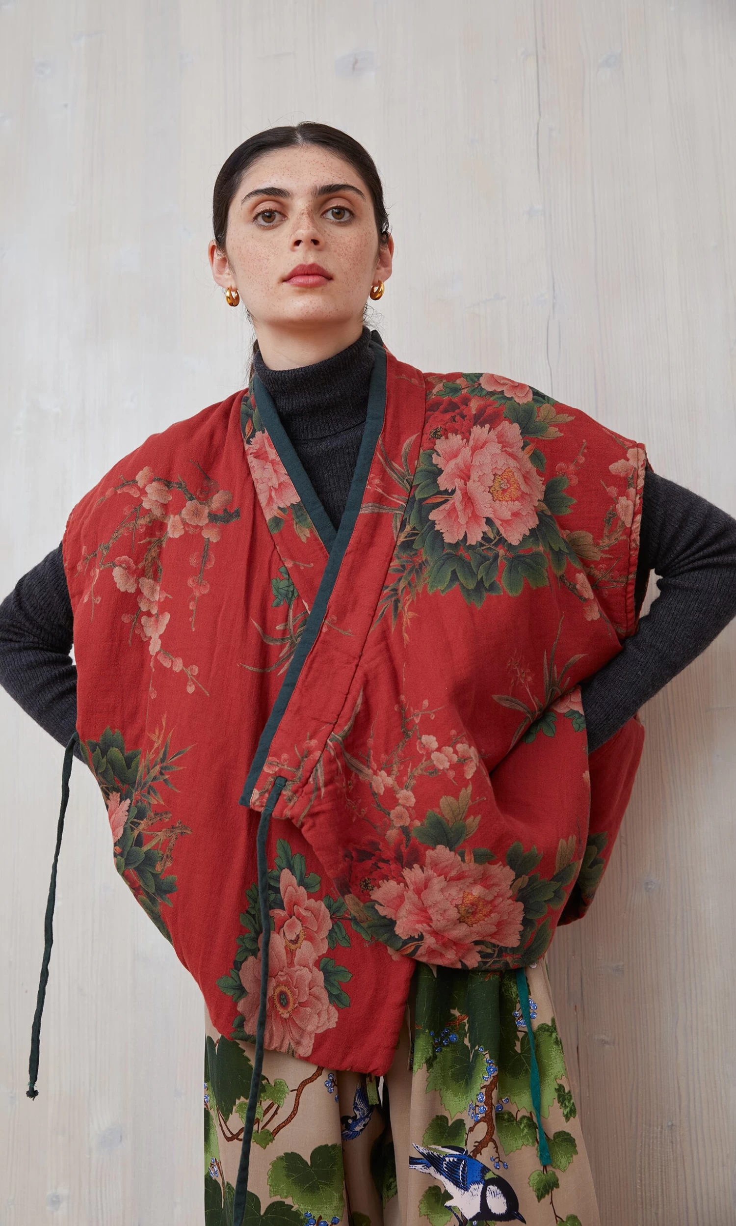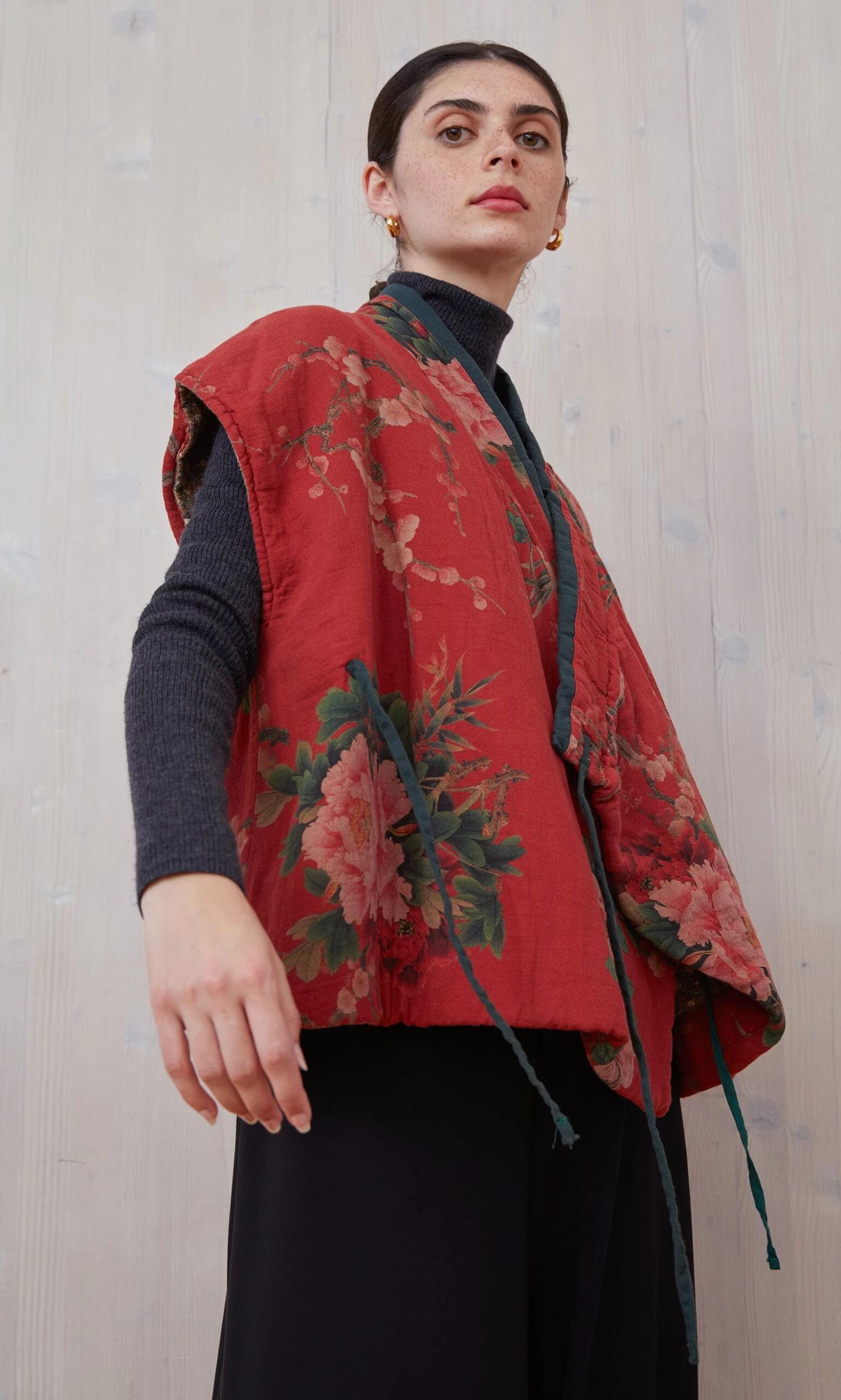 Wrap front gilet in a red chinoiserie print with lightly quilted brown daisy-print lining. Ribbon tie fastening. Relaxed fit. L62cm