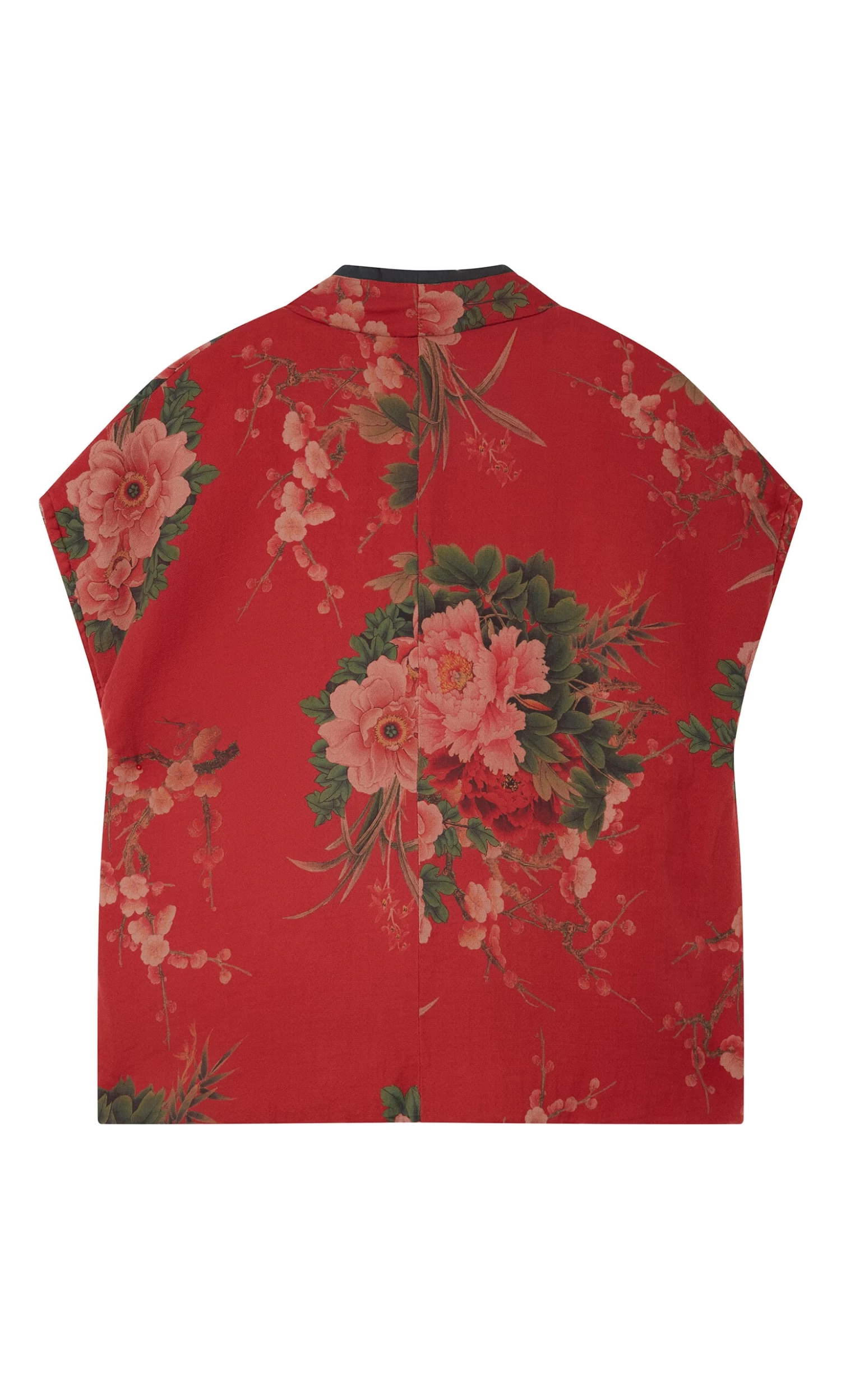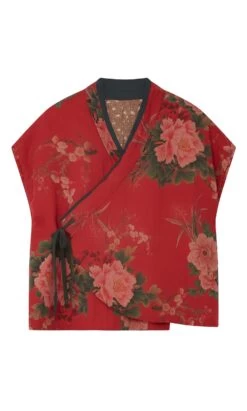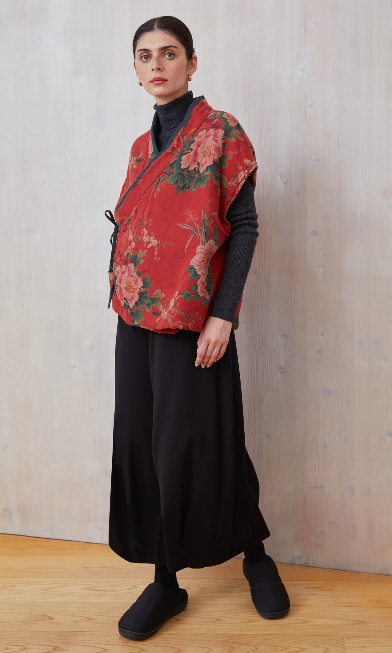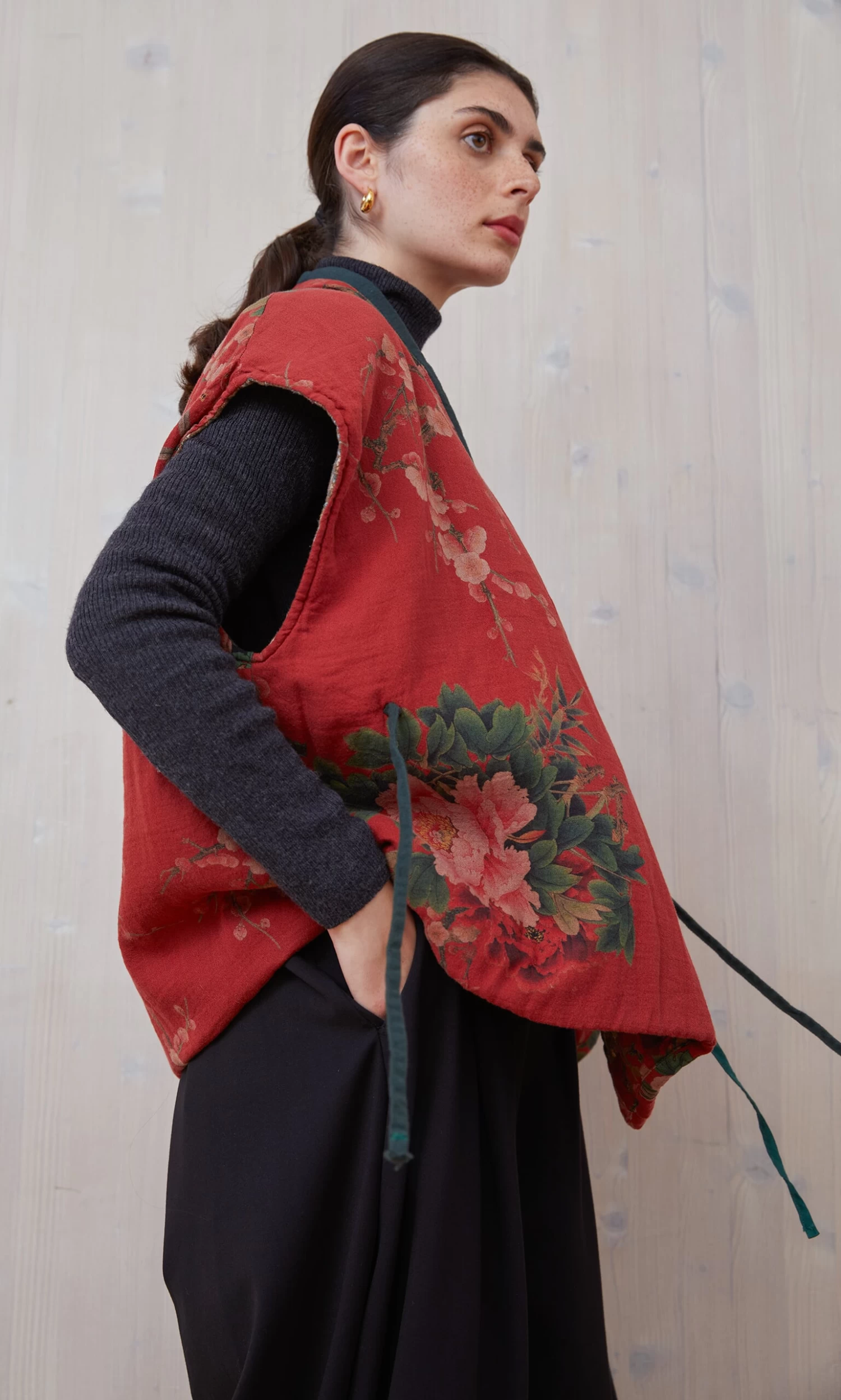 Wrap front gilet in a red chinoiserie print with lightly quilted brown daisy-print lining. Ribbon tie fastening. Relaxed fit. L62cm