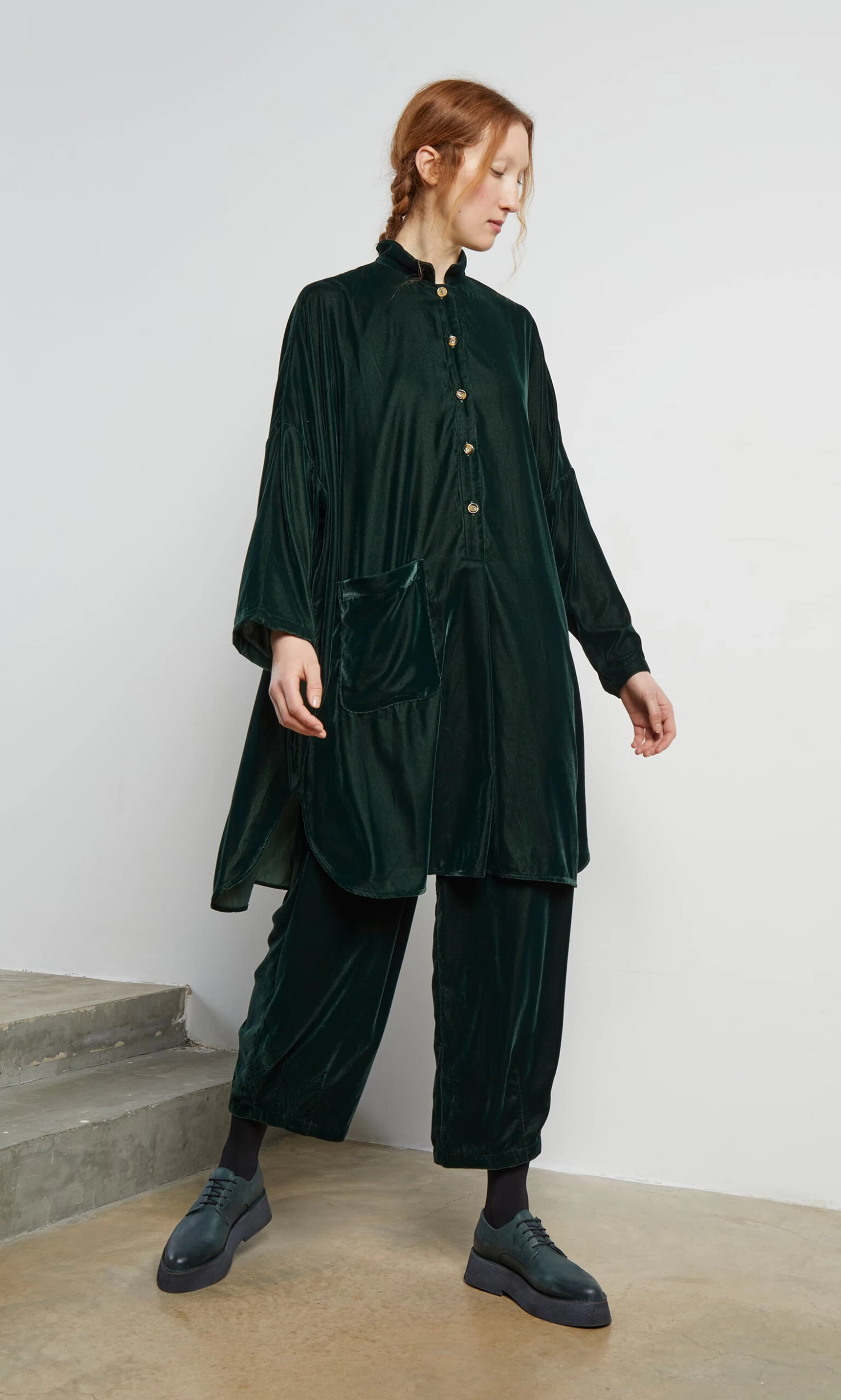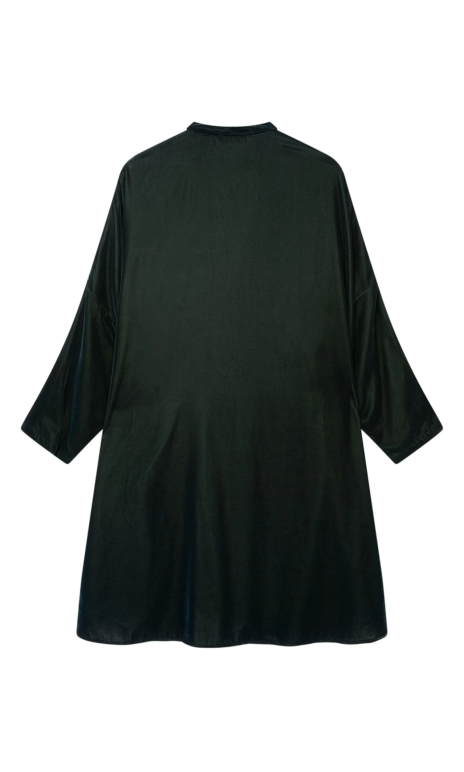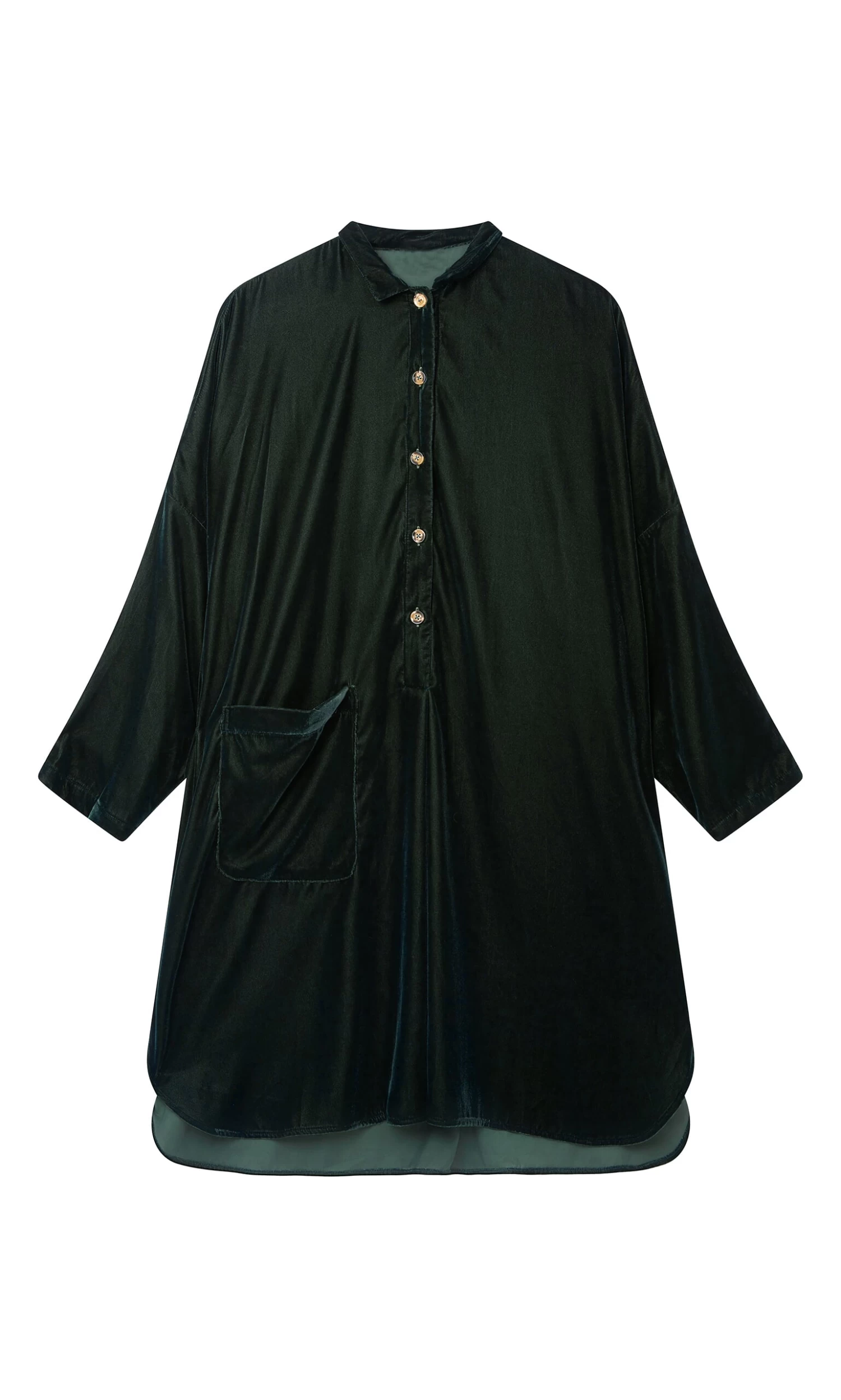 Scoop hem shirt dress crafted from plush forest velvet. Embellished with marbled buttons and single oversized patch pocket positioned at the front. Easy, relaxed cut. Tapered sleeves. L102cm.