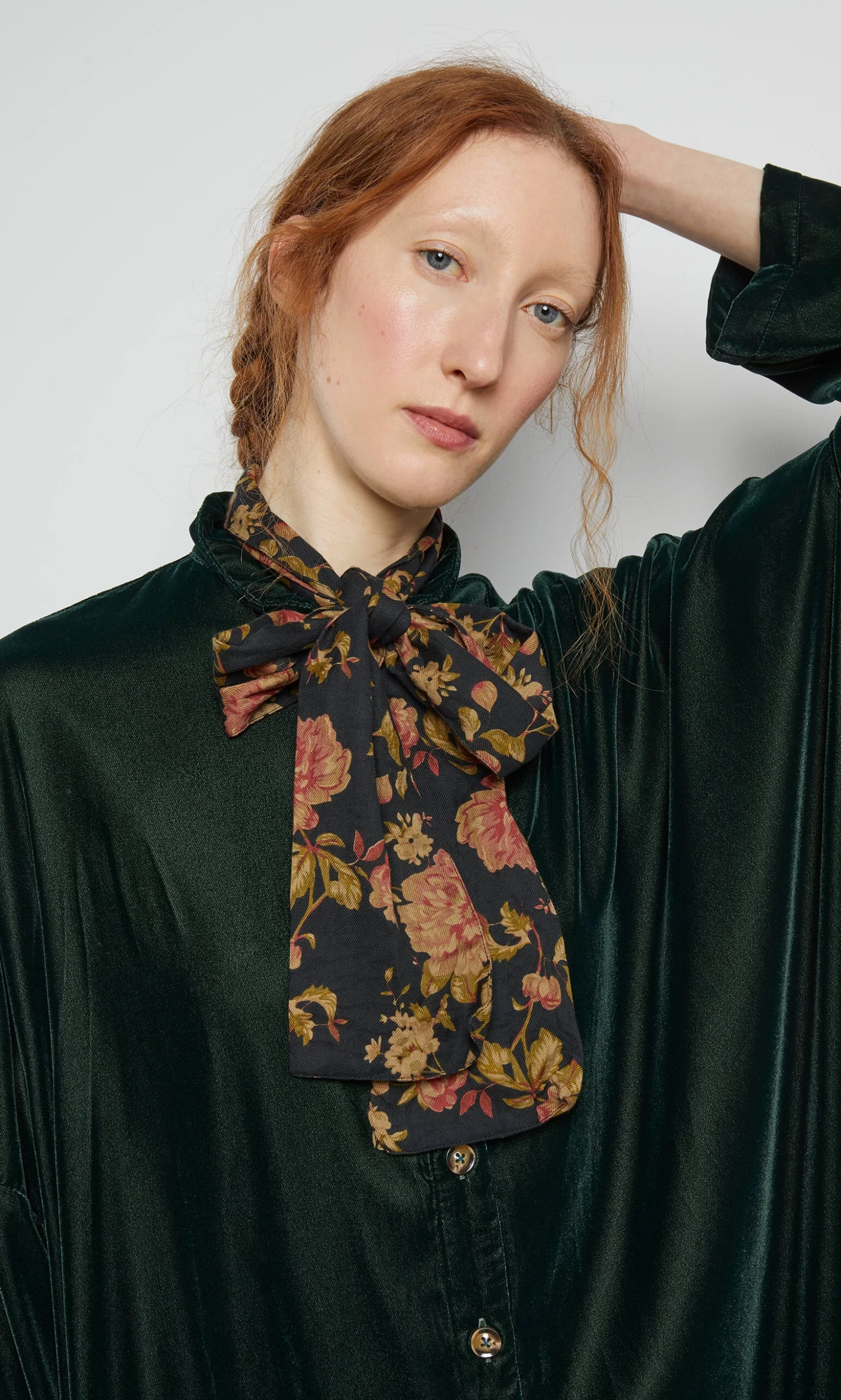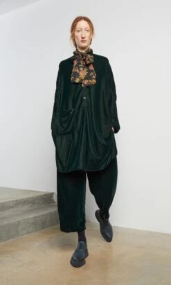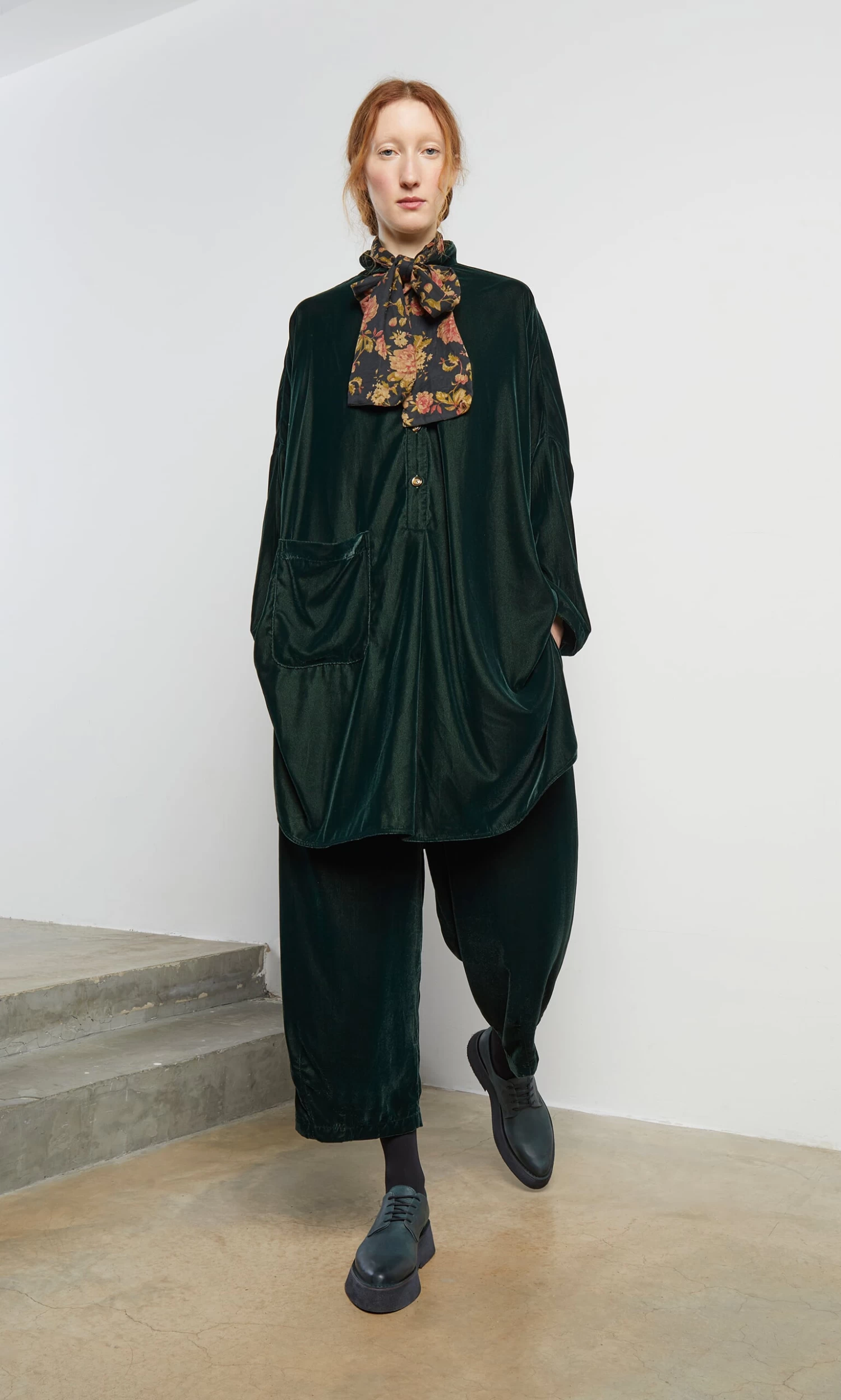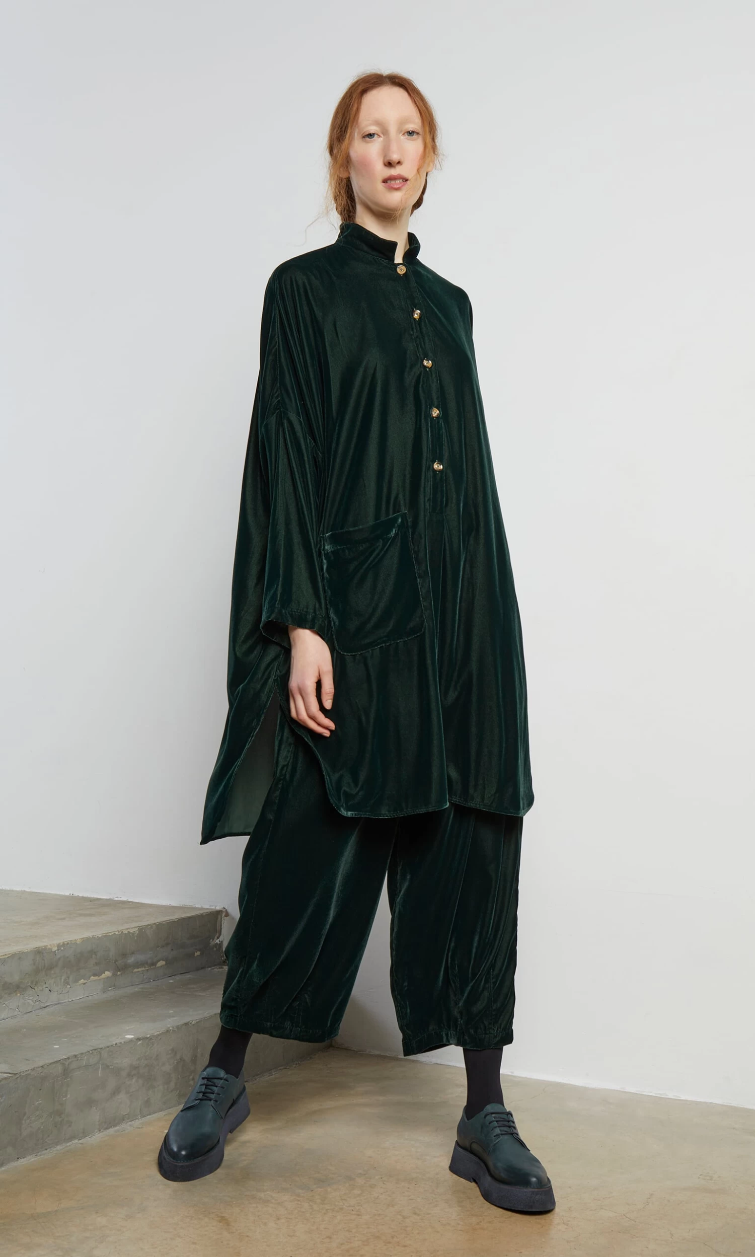 Scoop hem shirt dress crafted from plush forest velvet. Embellished with marbled buttons and single oversized patch pocket positioned at the front. Easy, relaxed cut. Tapered sleeves. L102cm.