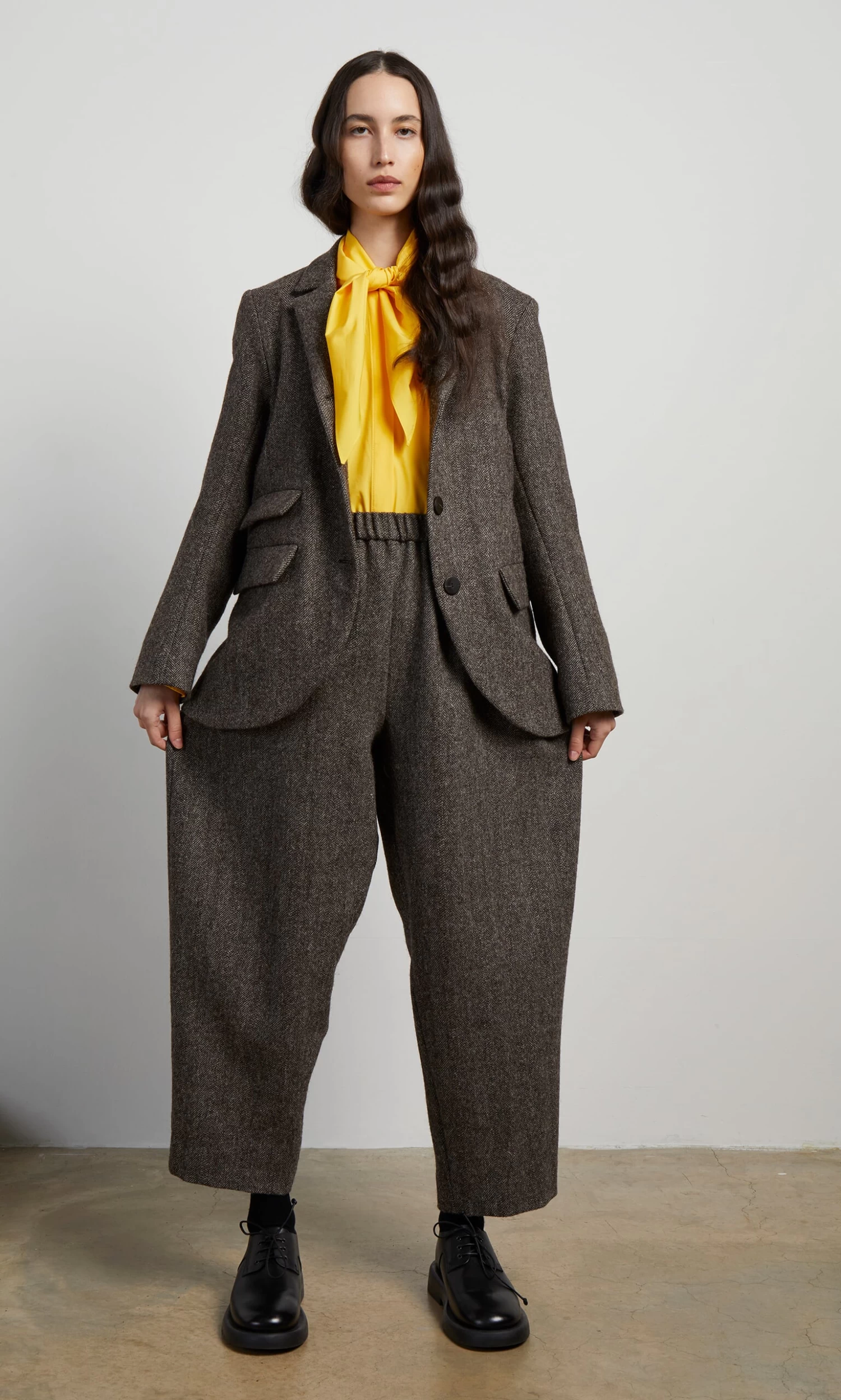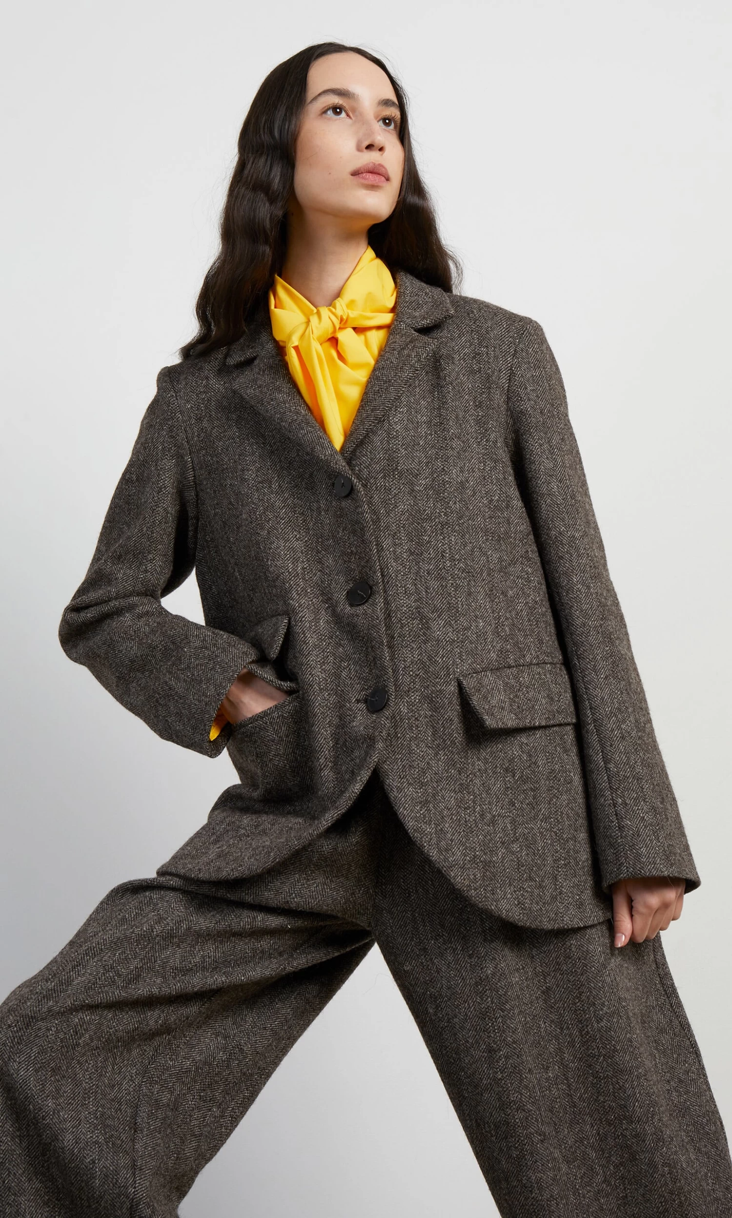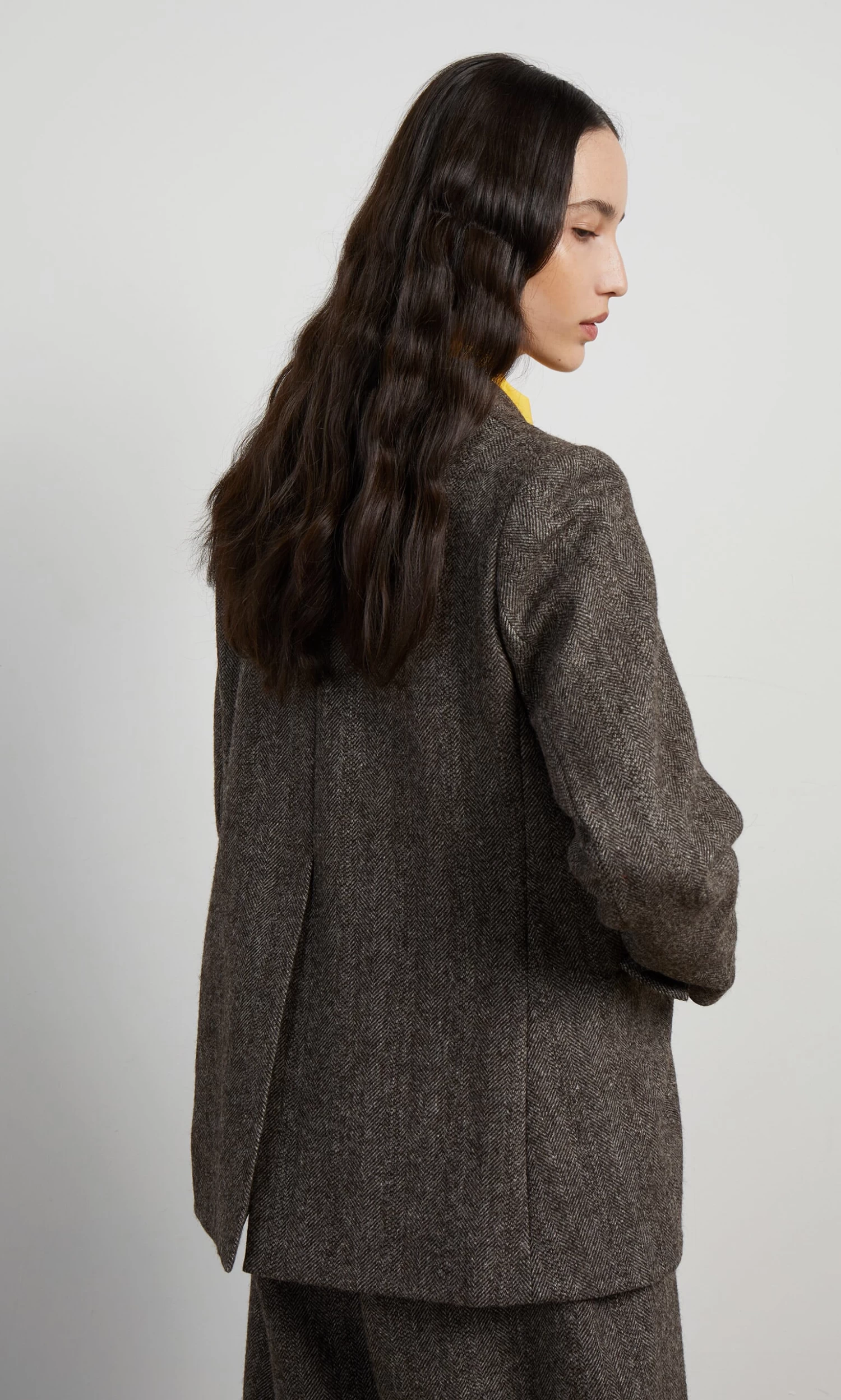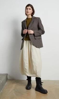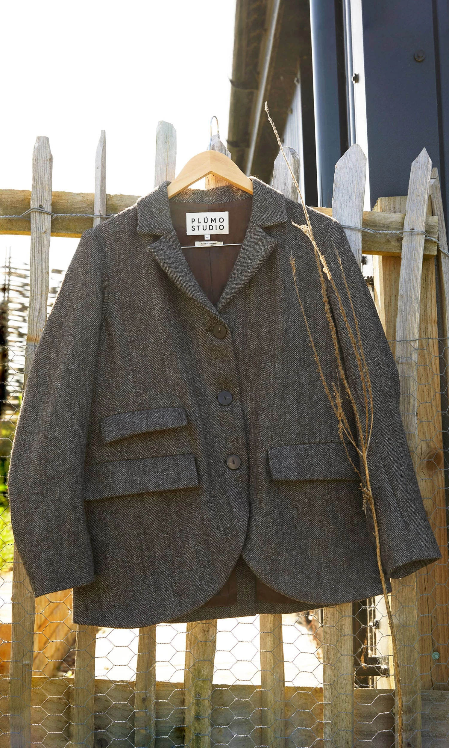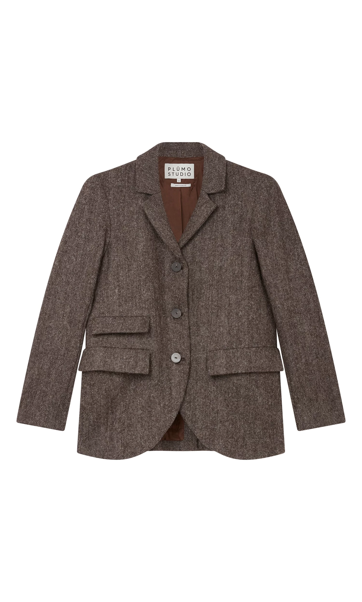 Wool tweed jacket classically shaped with 3 button fastening at the front, notched collars and a curved hem. Vent at back and 3 flapped pockets. Made in England from Lovat tweed which is manufactured in the Scottish Borders. Neat-ish fit. Fully lined with a single interior slip pocket. Sustainable, environmentally friendly and local production. Lined.