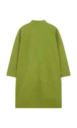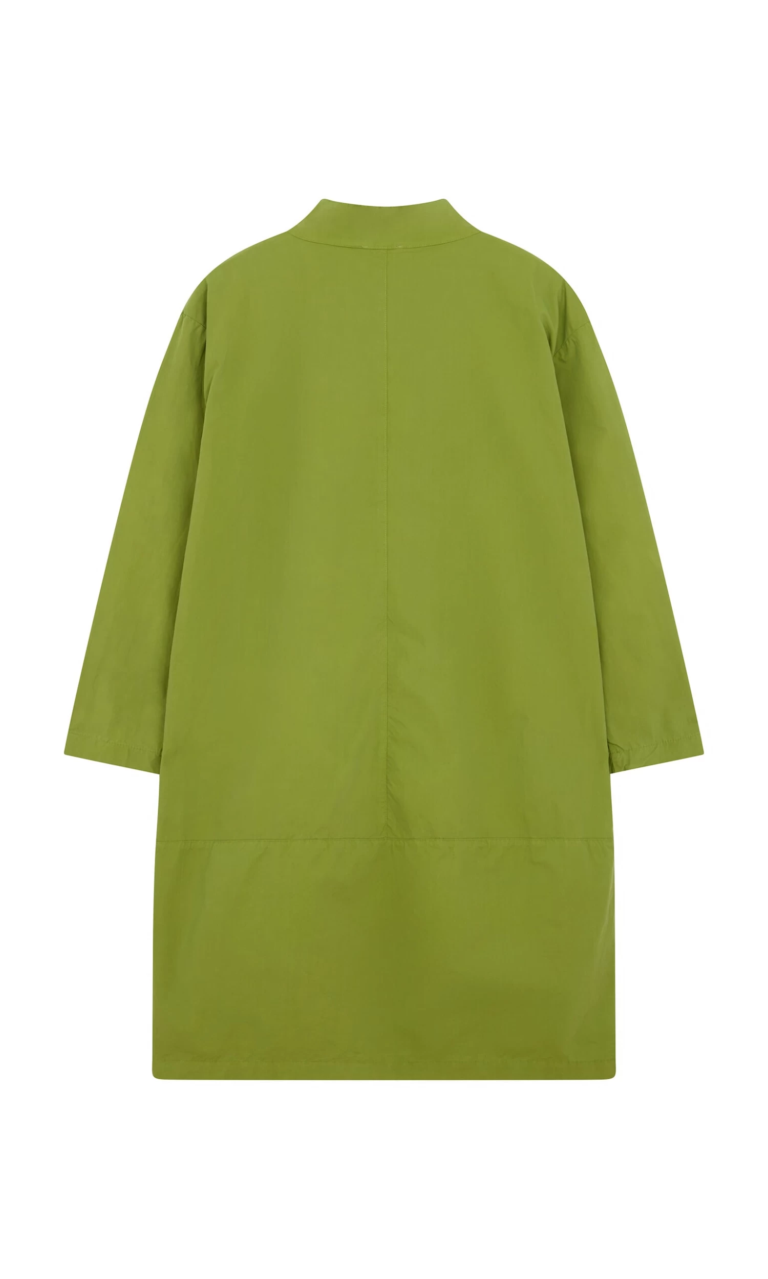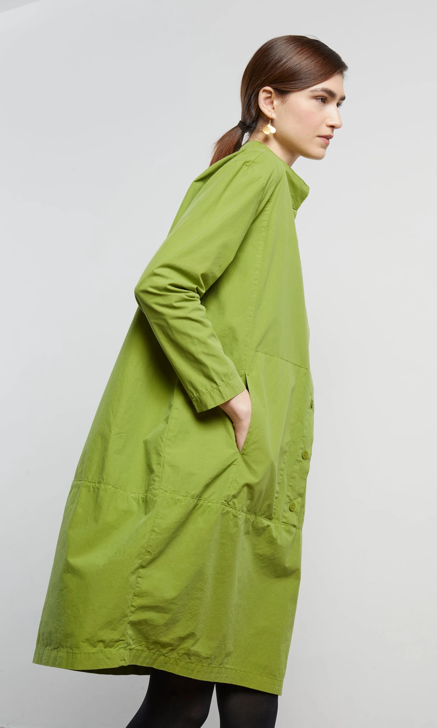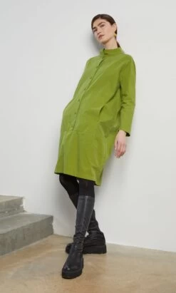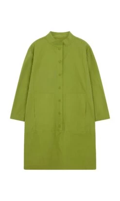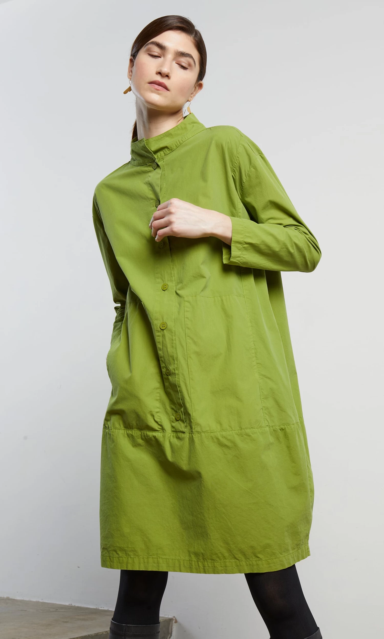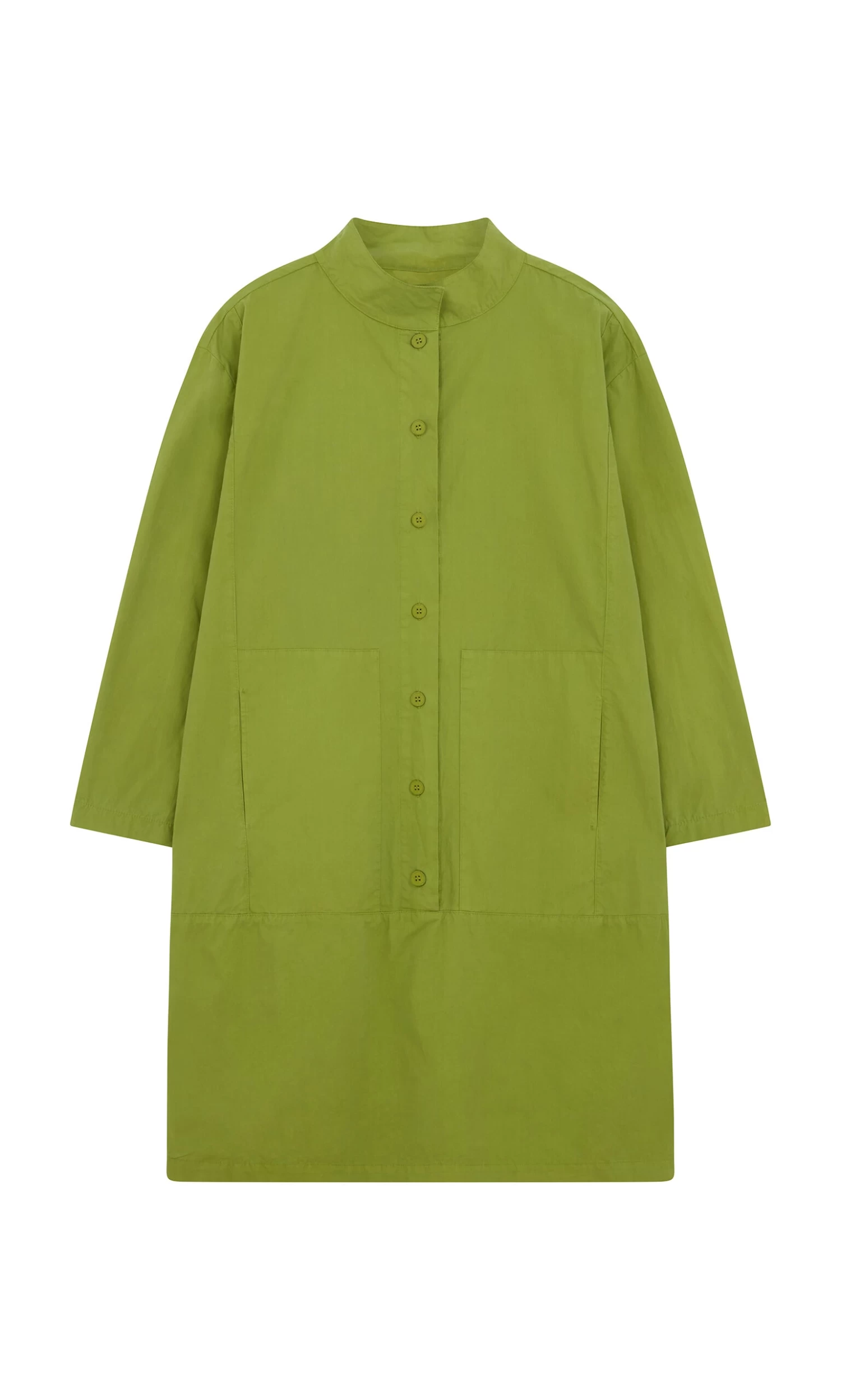Cool green tunic dress in overstitched panels of crisp cotton poplin. Easy, relaxed shape with slip in pockets positioned on the front. Button-up front fastening and long simple sleeves. L100cm.