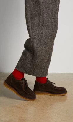 Suede moccasins handcrafted with locally sourced vegetable tanned suede, featuring a hand moulded and stitched crepe outsole. Leather lined with padded footbed. Lace up front. Made in Italy.
