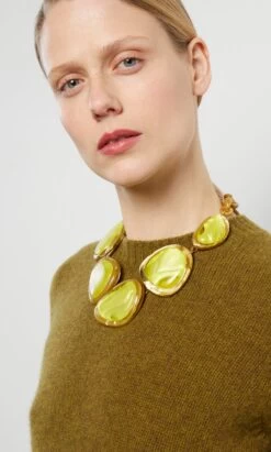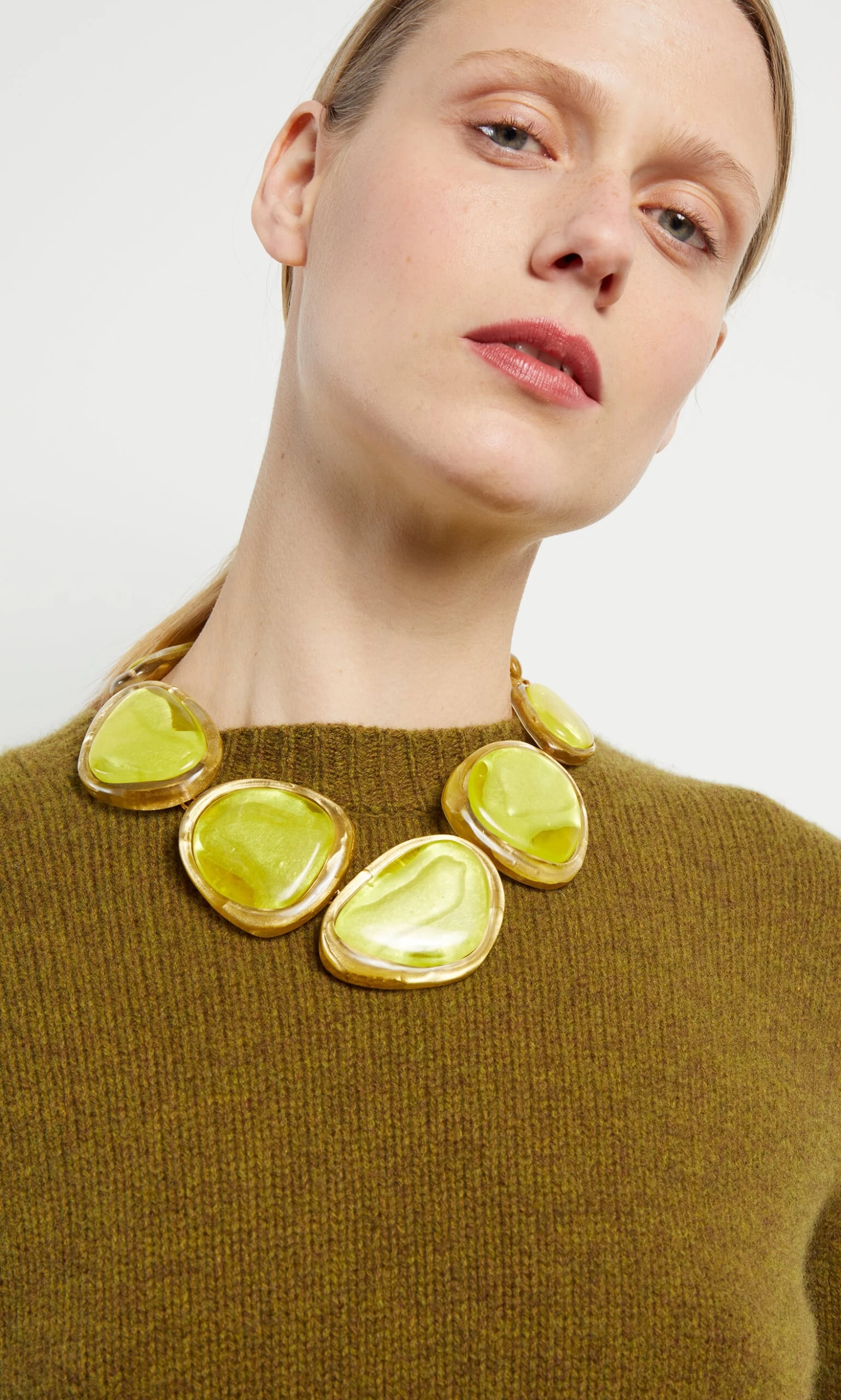 A stunning necklace made from a row of organically shaped, irregular pebbles, inspired by master glass blowers and crafted from iridescent, smooth and light resin. The chain is adjustable. Attaches in gold plated brass. Handmade in Parisian workshop. L50cm.
