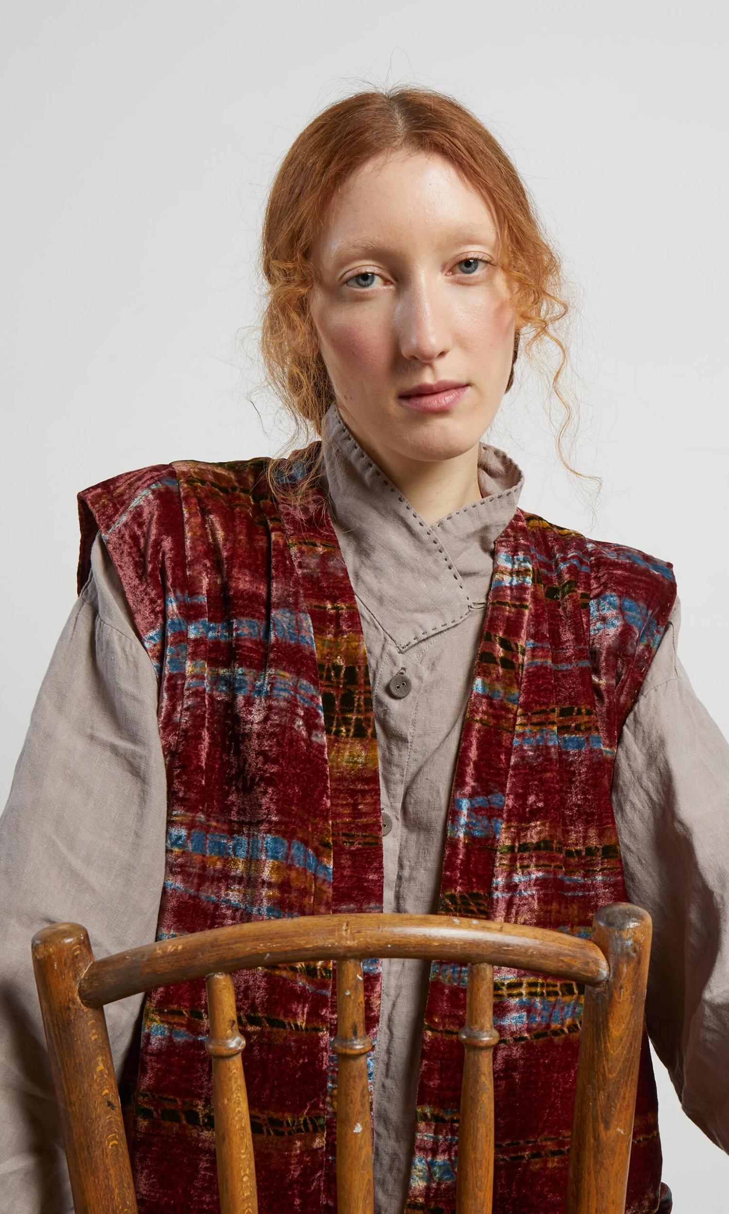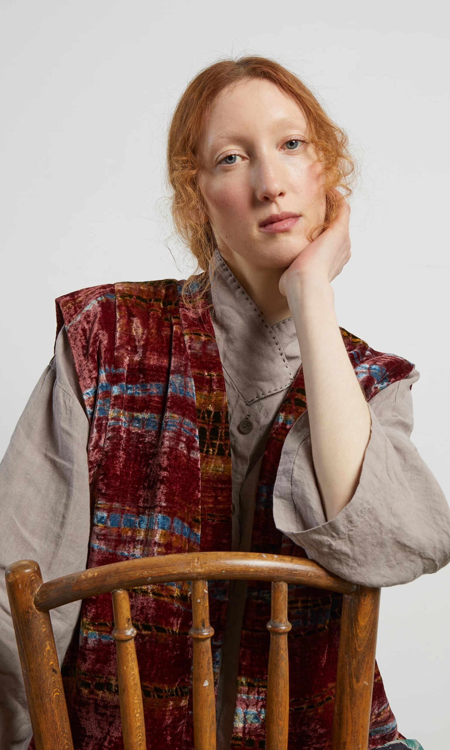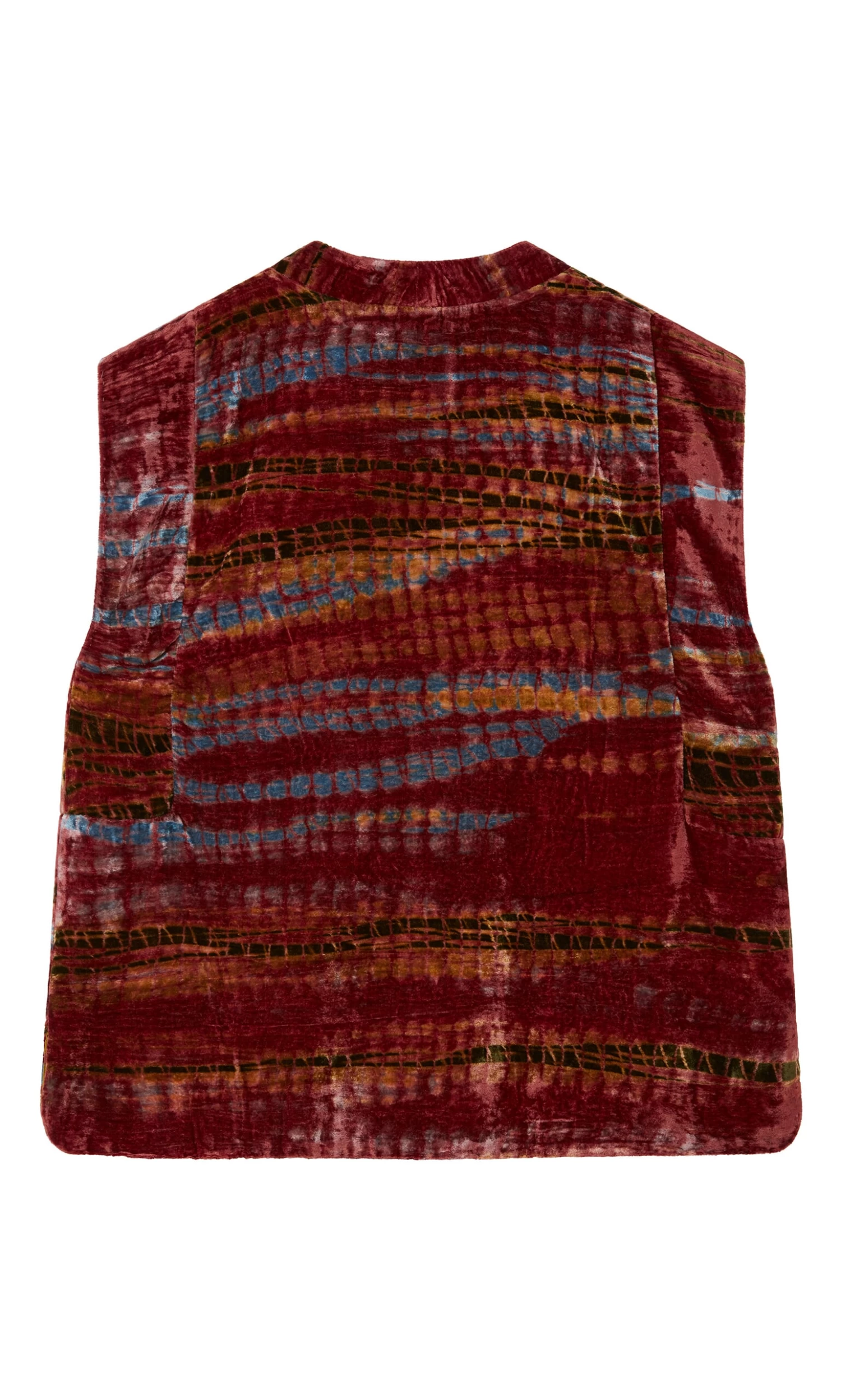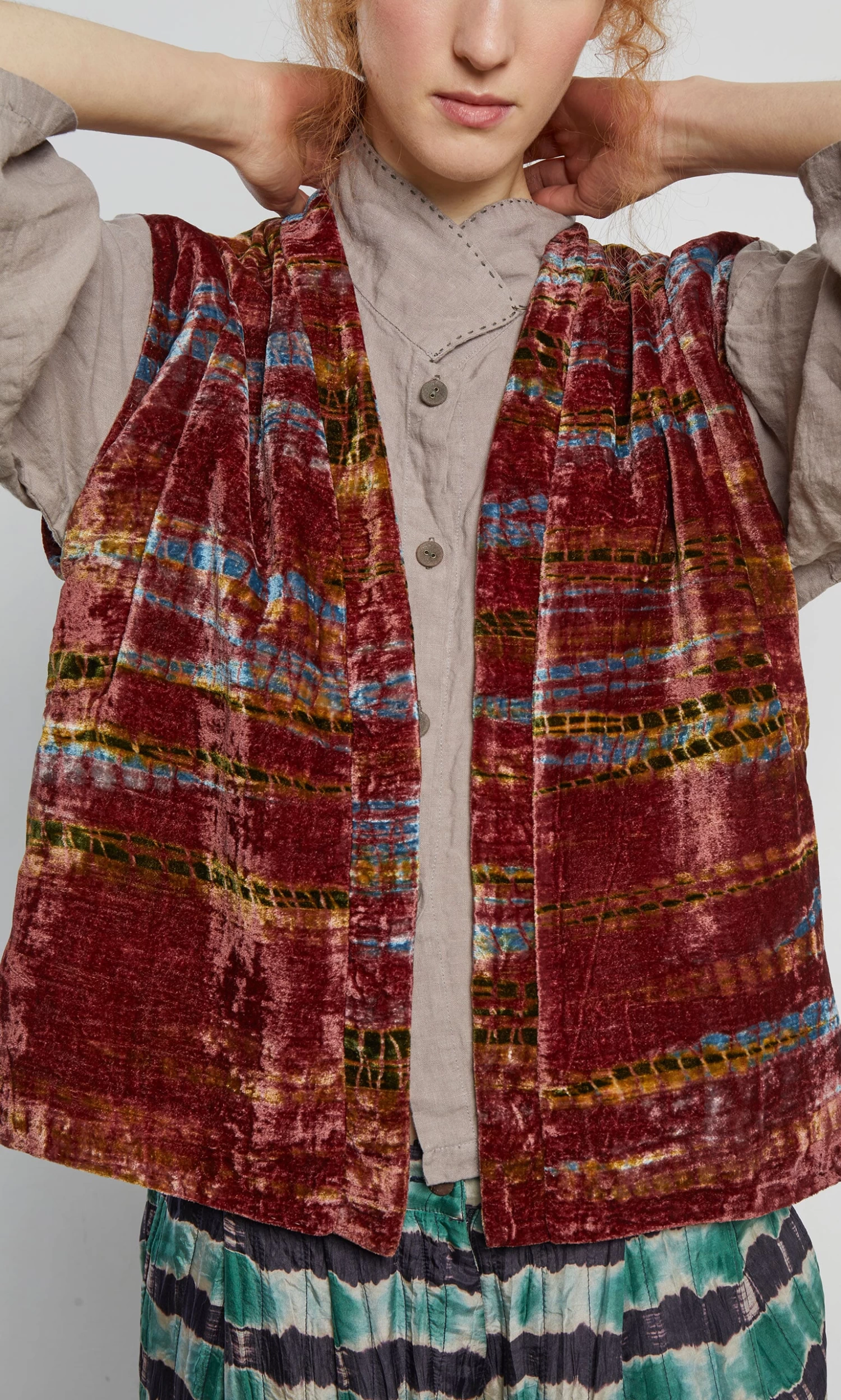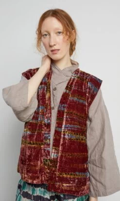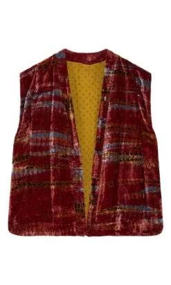 Crushed velvet sleeveless jacket with contrasting dot-print gold lining. Open front straight-ish cut.