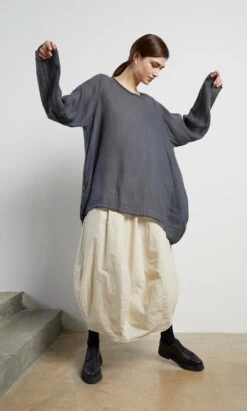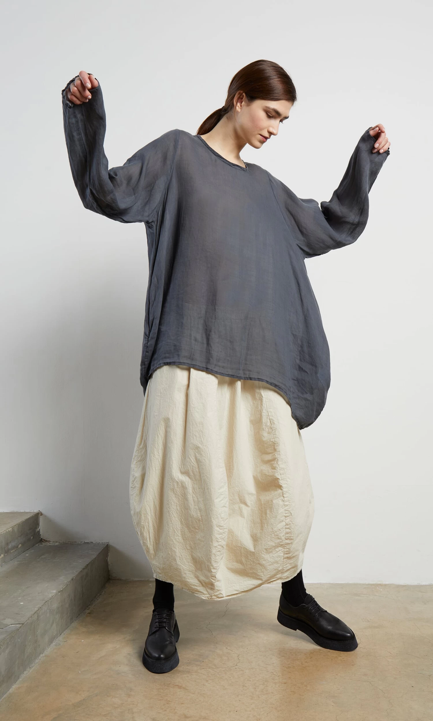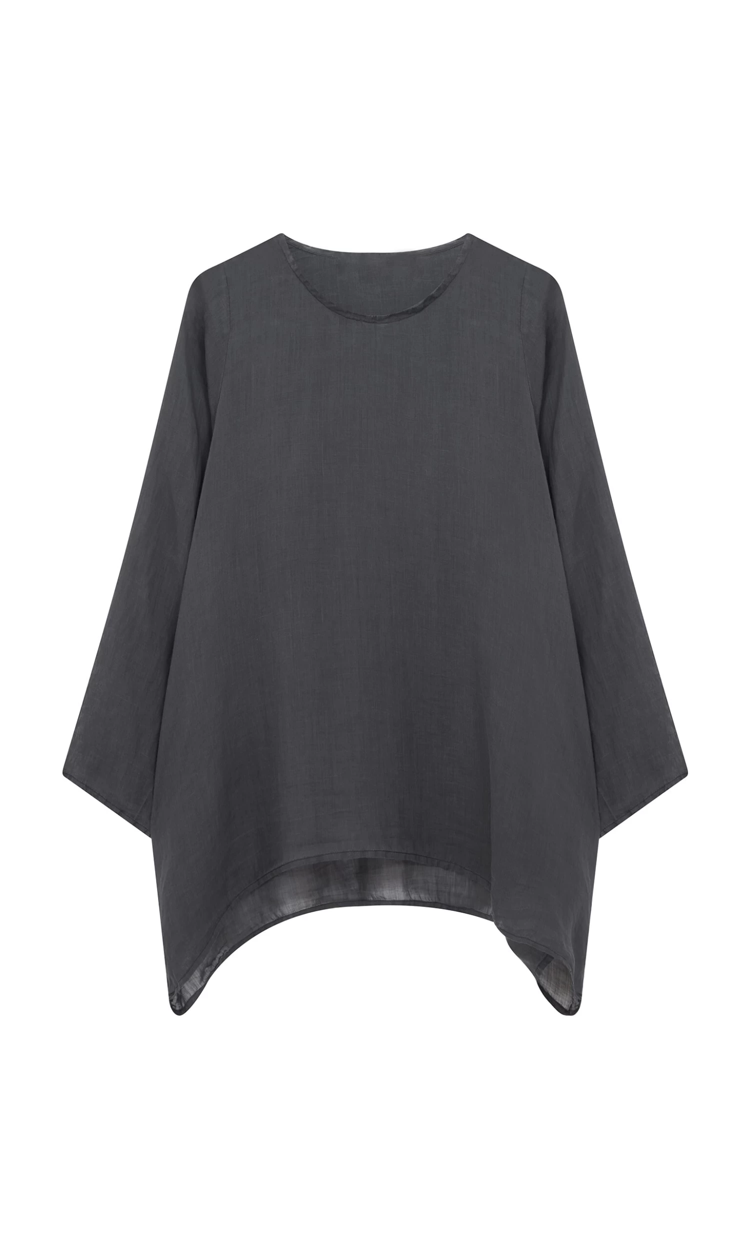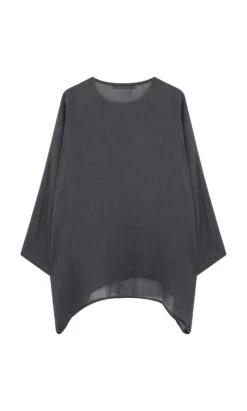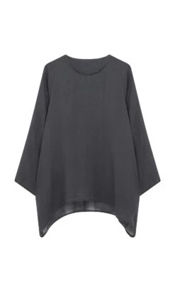 Slash neck top made from charcoal superfine ramie. Simple overall silhouette cut wide for a drapey, understated look. Side seam pockets add to the relaxed feel. Long tapered sleeves. Semi-sheer. L72-82cm.