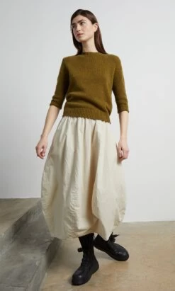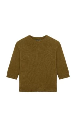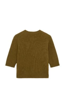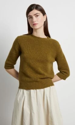 Crew neck sweater with flattering three quarter length sleeves, neck and hem have shapely rib-knit trims. Knitted from supersoft merino wool. Neat, boxy fit. Ethical production.