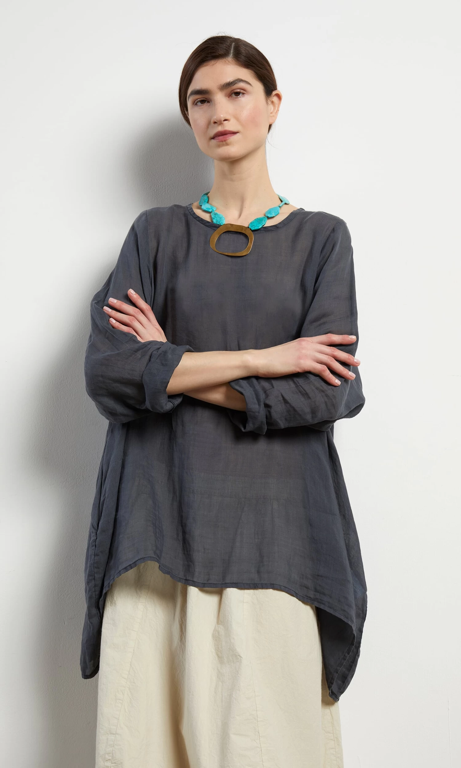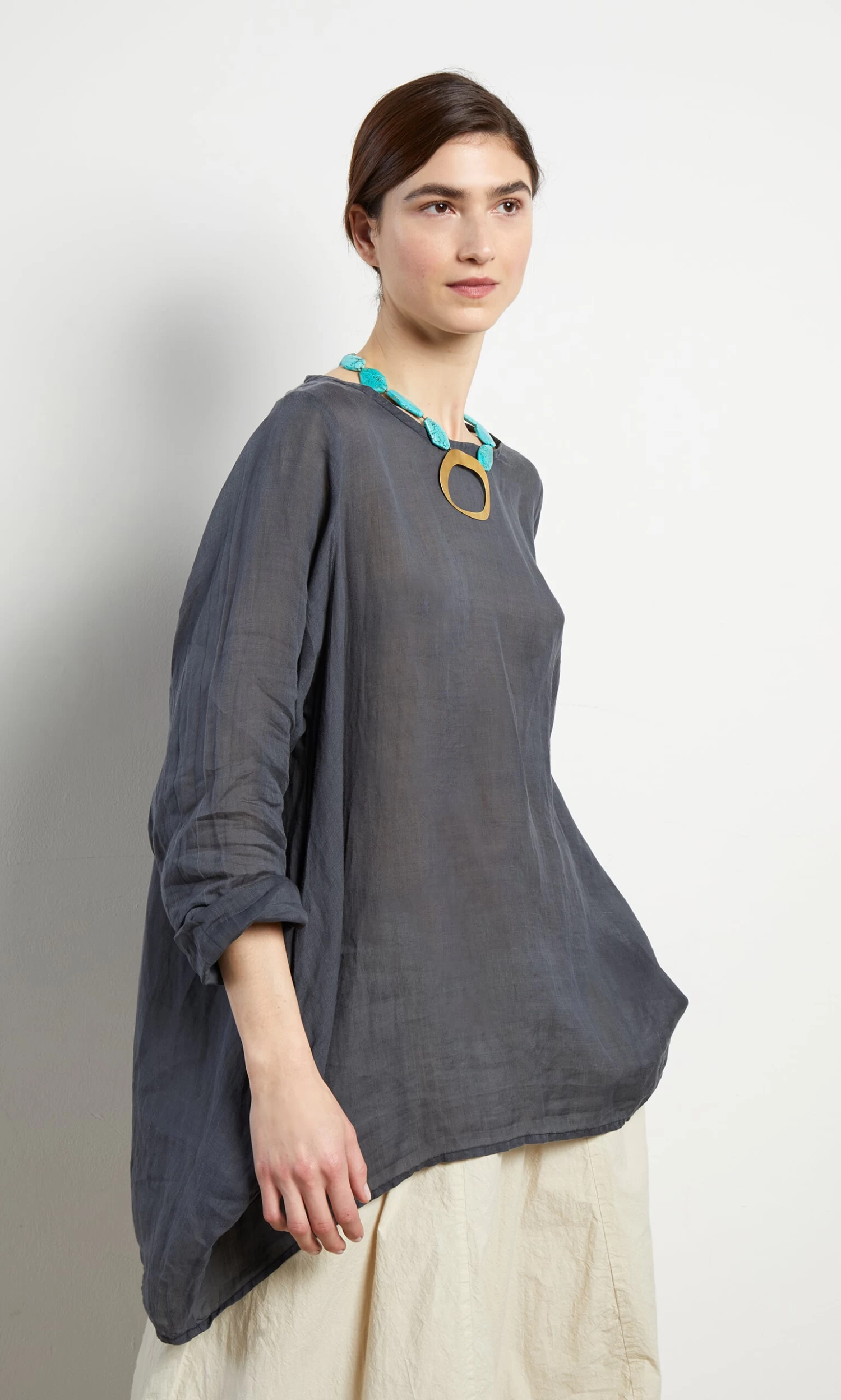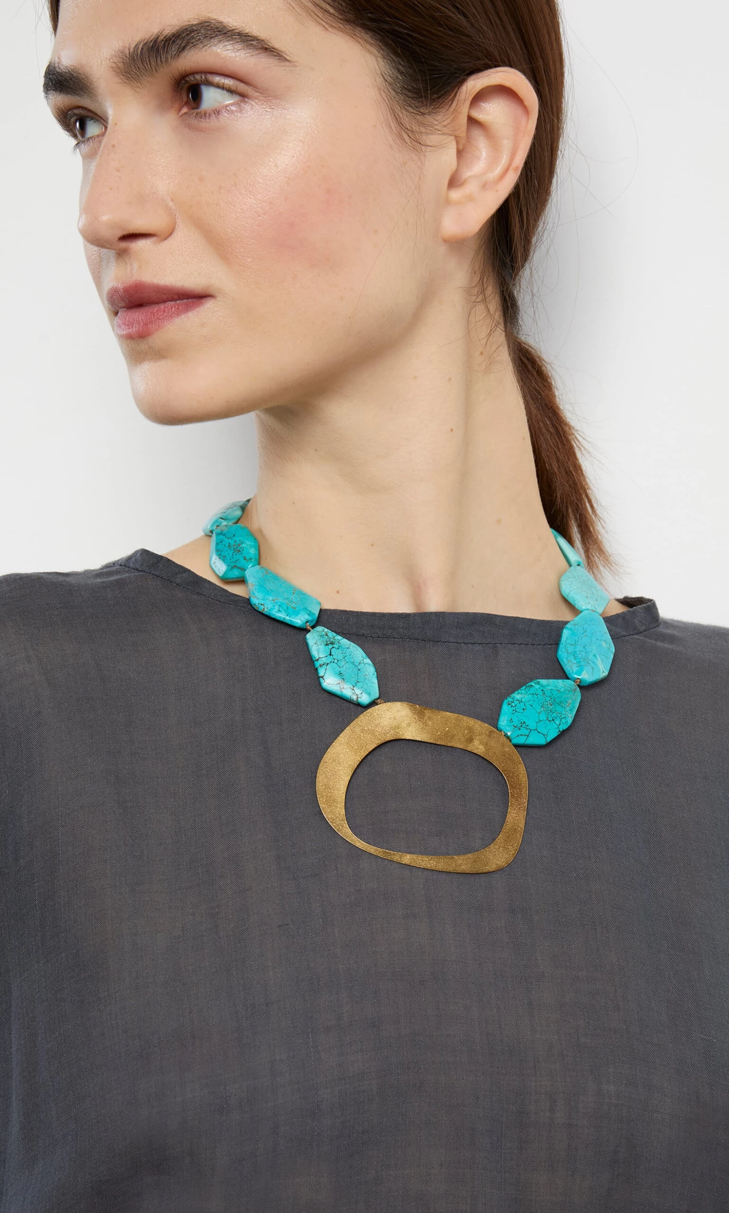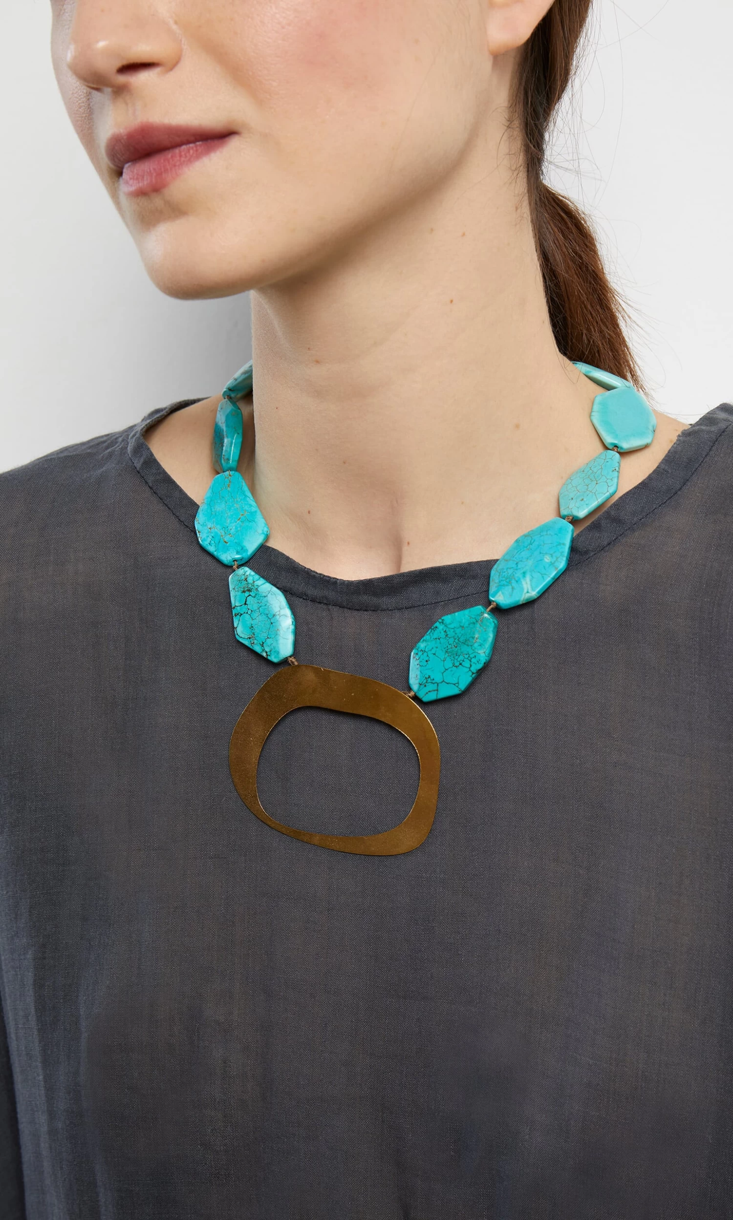 Necklace of faceted turquoise beads with rounded hammered gold plated bronze pendant. Gold lobster clasp and adjustable chain fastening. This necklace is made from natural cut stones, so shape and size may vary from image shown, making this a truly unique statement piece. L48cm.