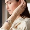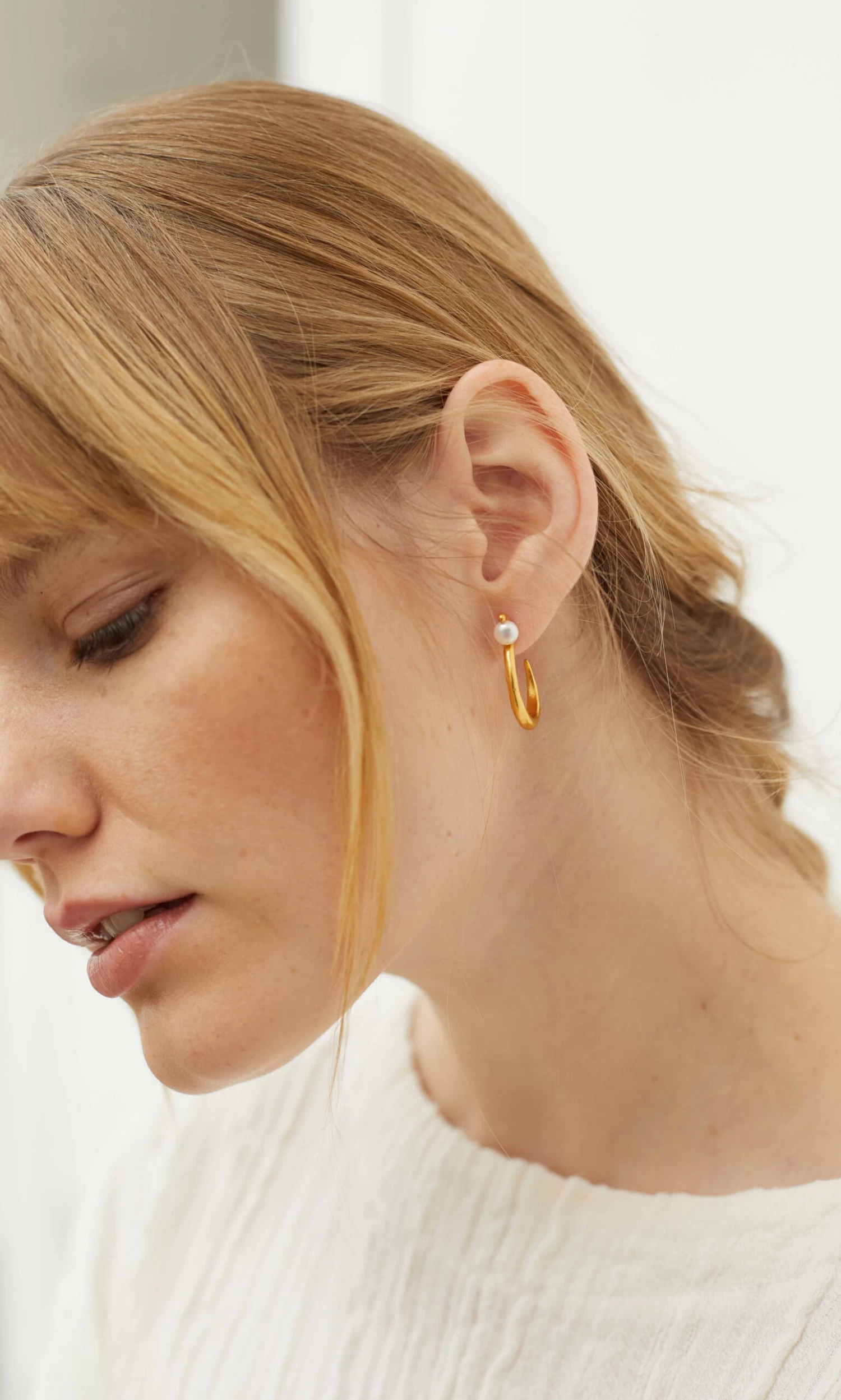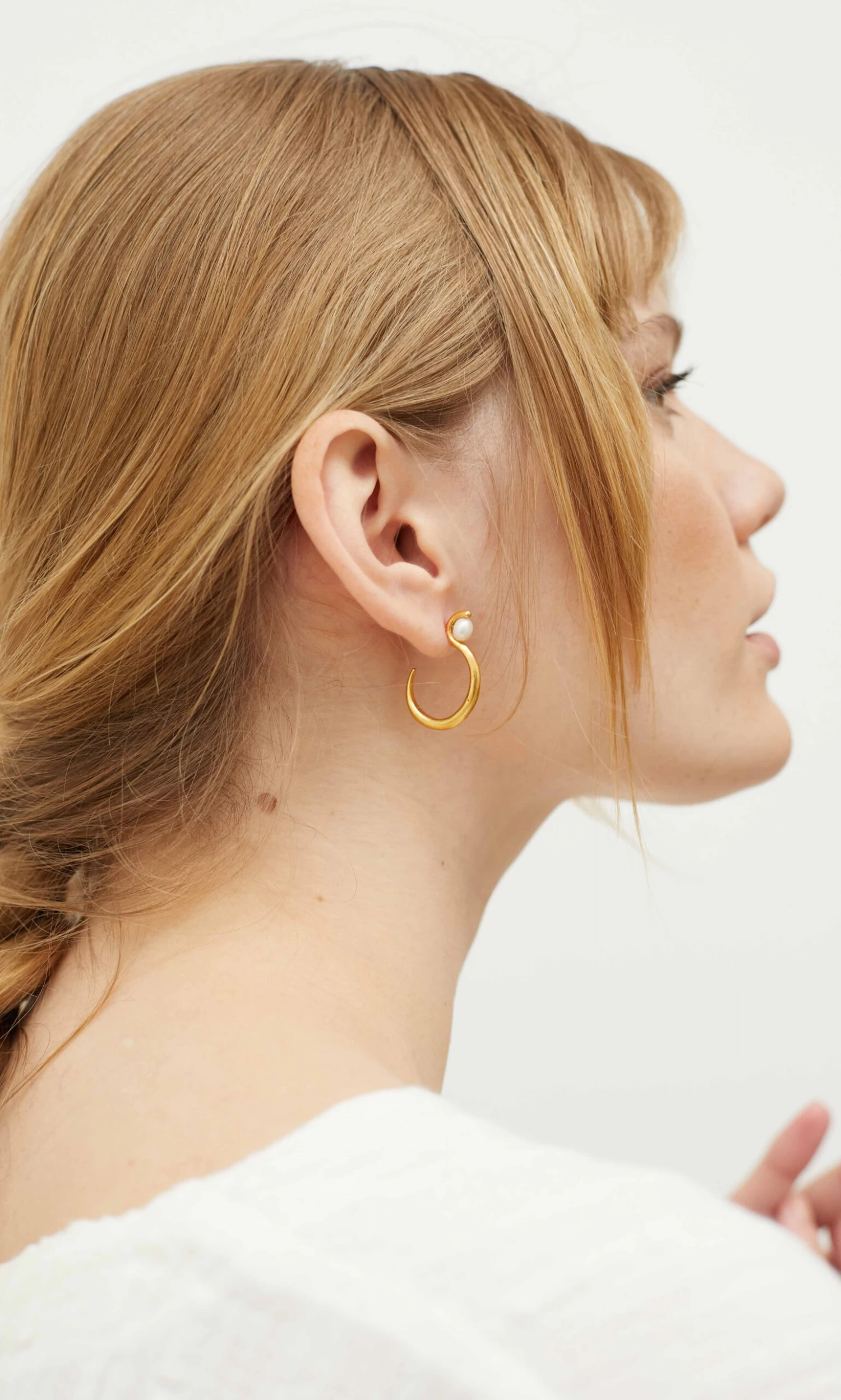 Beautifully crafted gold plated half hoop earrings balanced with a pearl stud on each earring. For pierced ears only.