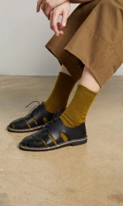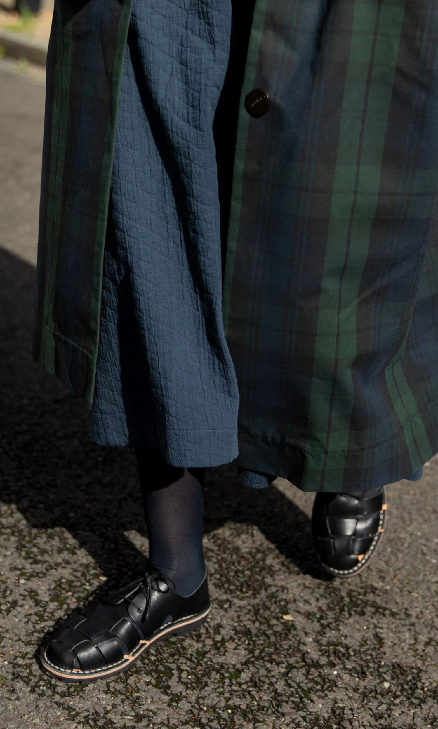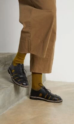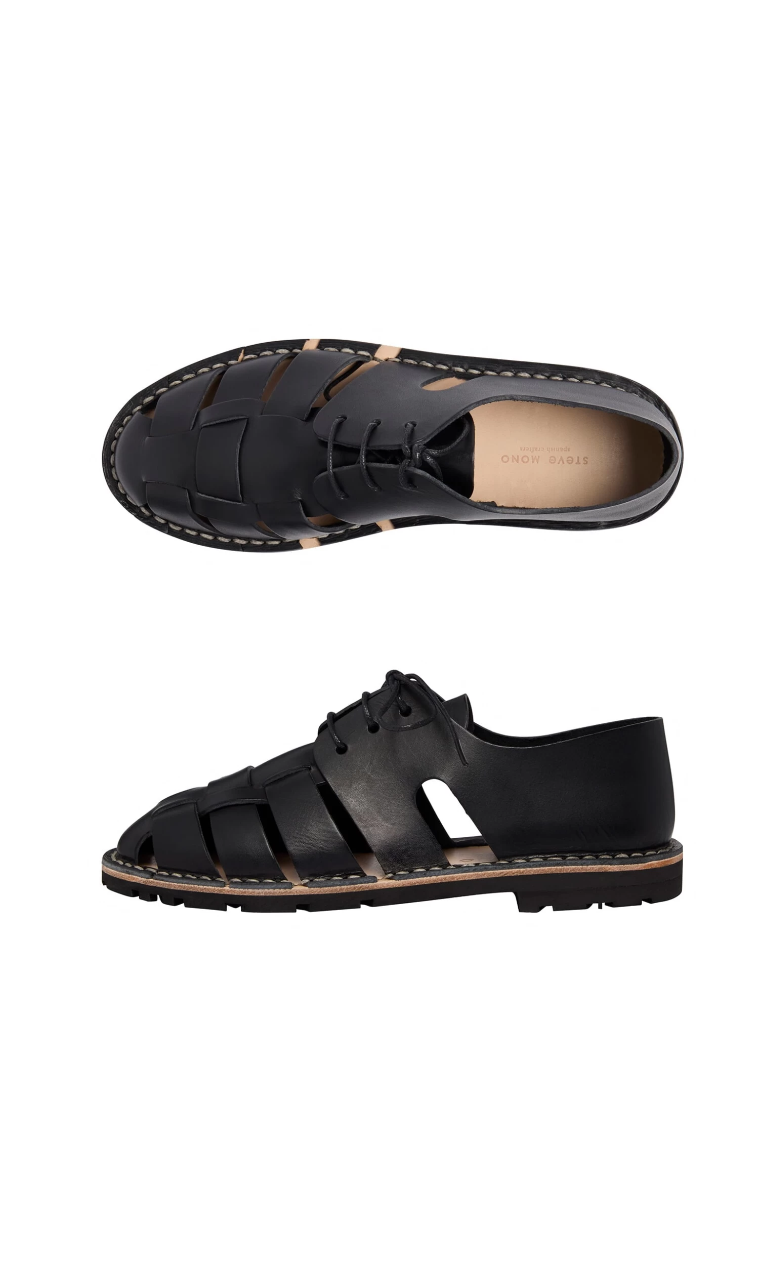 Black lace-up sandals with woven closed toe and recycled rubber soles. Handcrafted in Spain from vegetable tanned Tuscan leather. If between sizes, we recommend sizing up. Steve Mono.