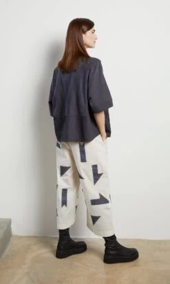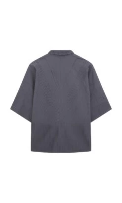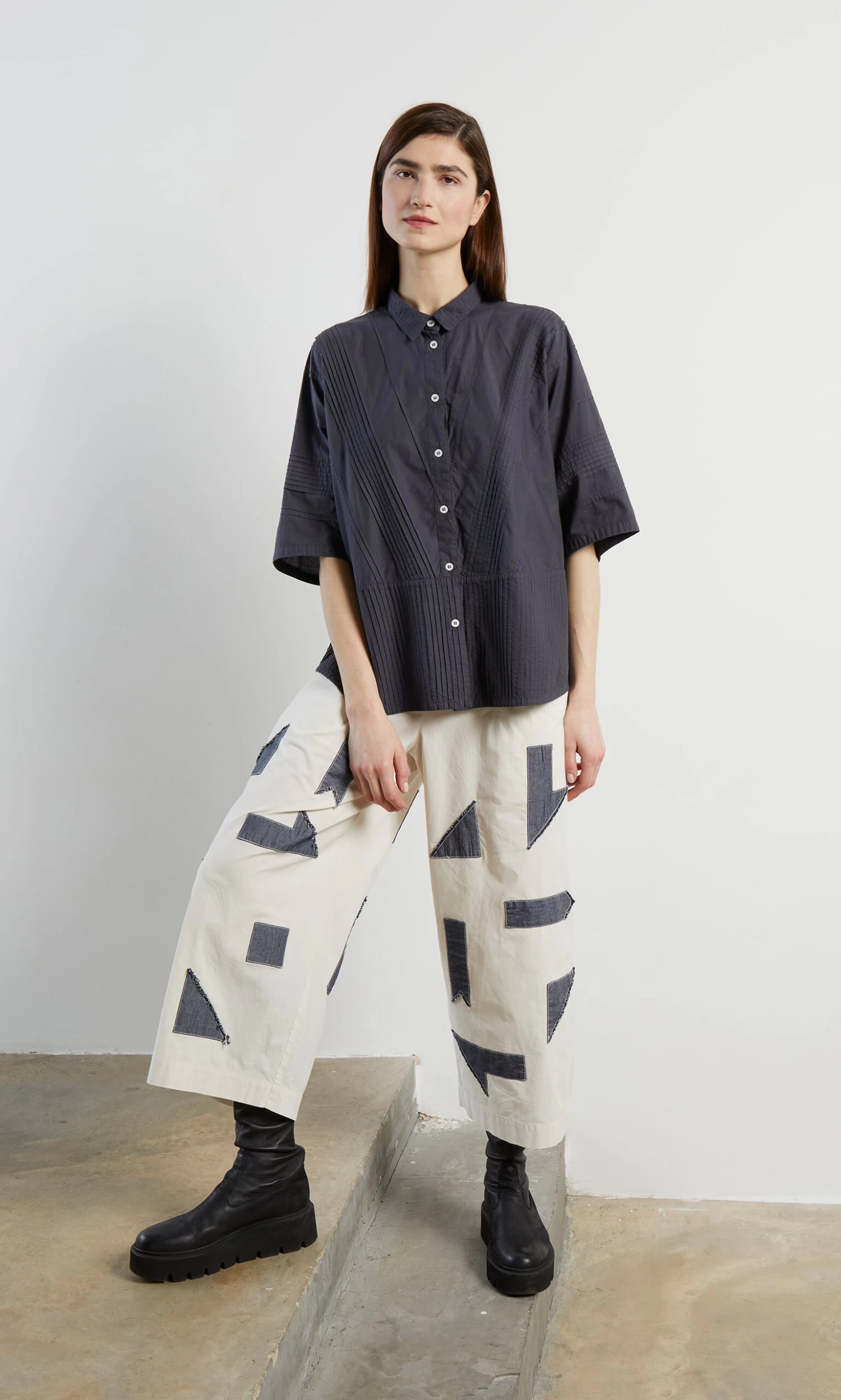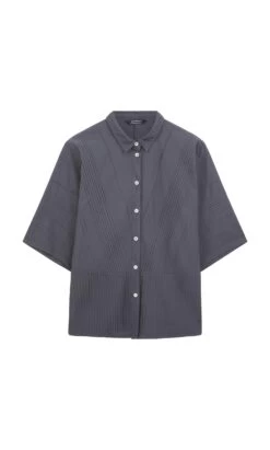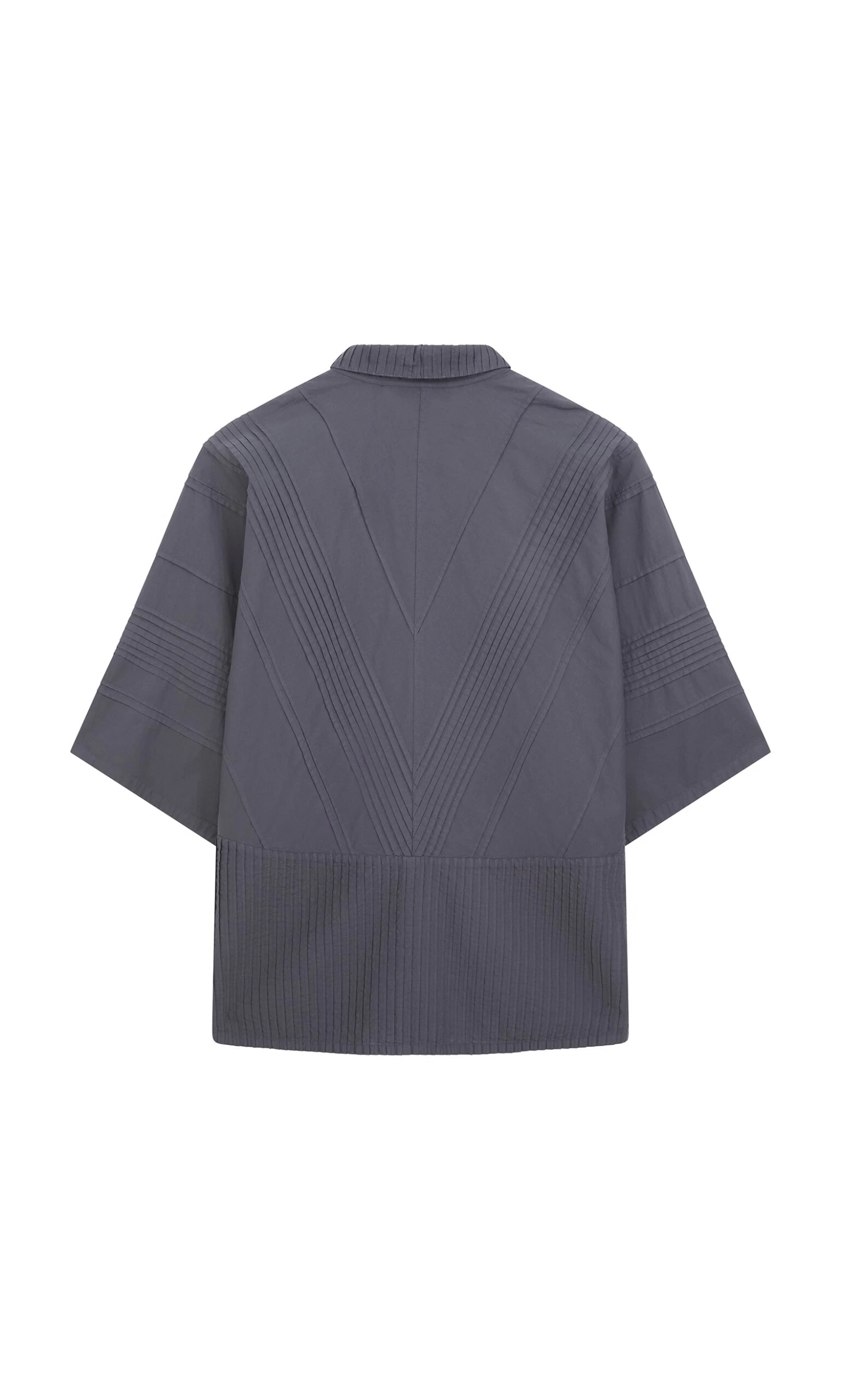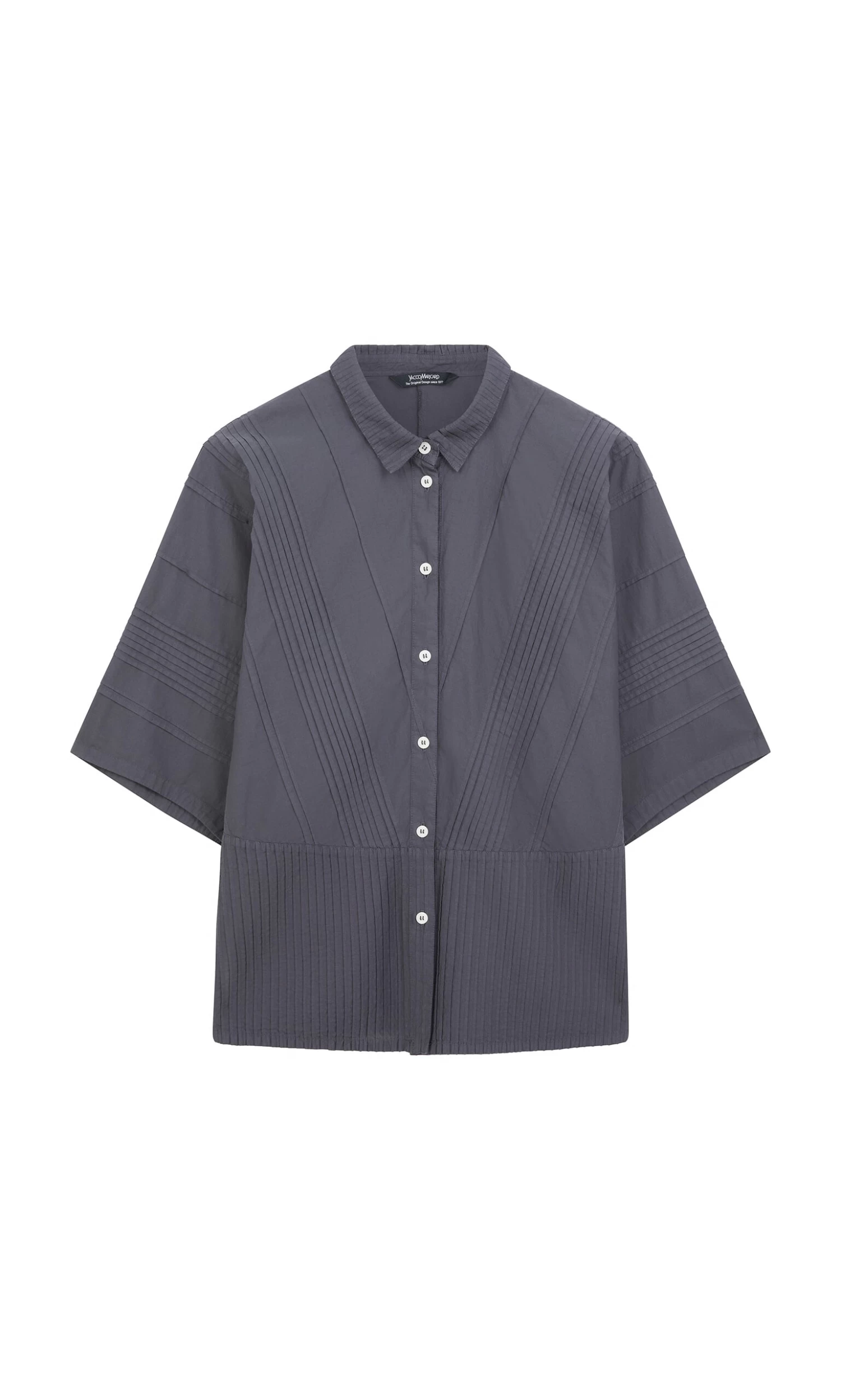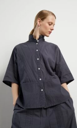 Charcoal cotton shirt constructed from overstitched pintuck panels. Squarish shape with short boxy sleeves and narrow point collar. Button fastening at front. Yacco Maricard. L66cm.