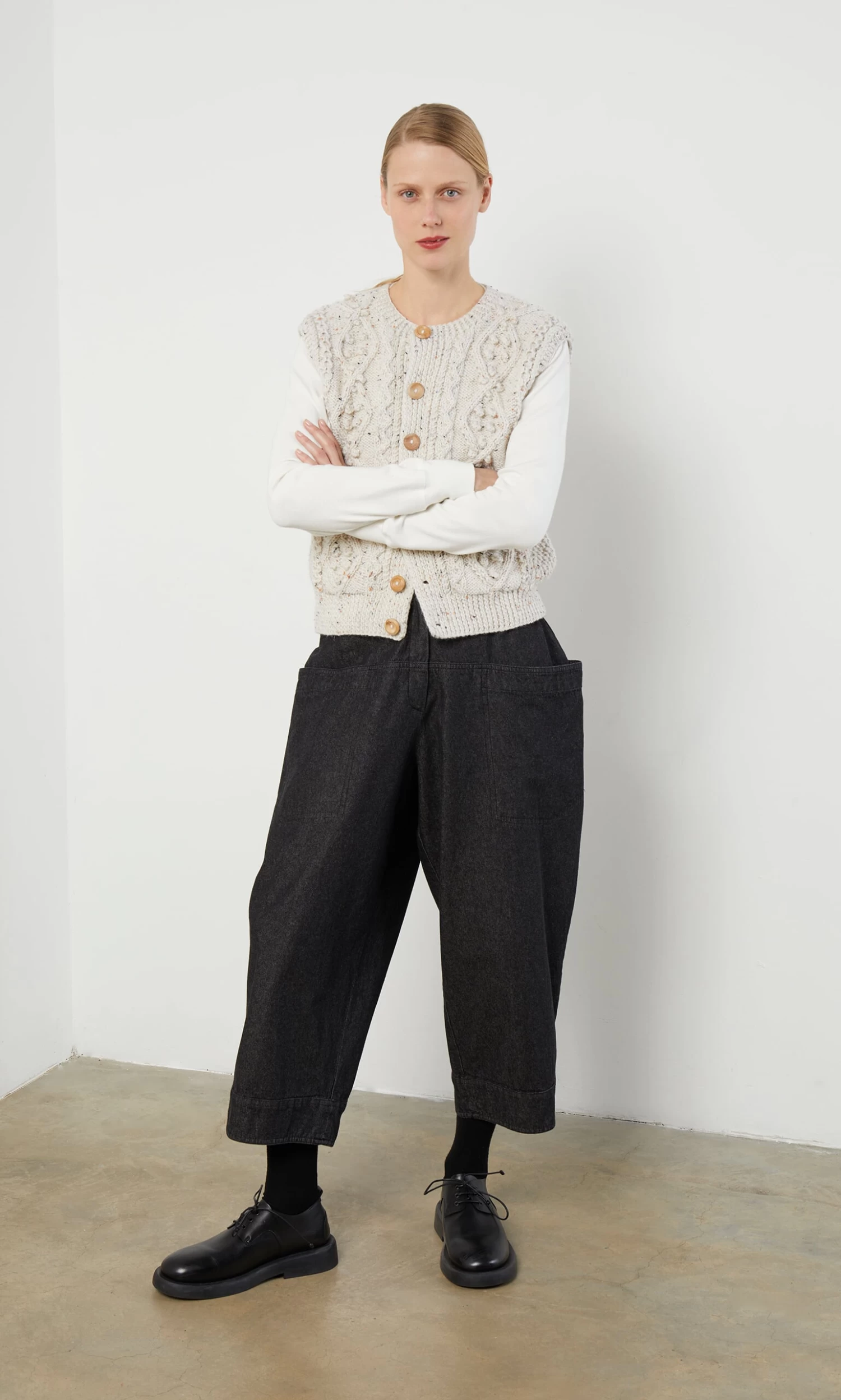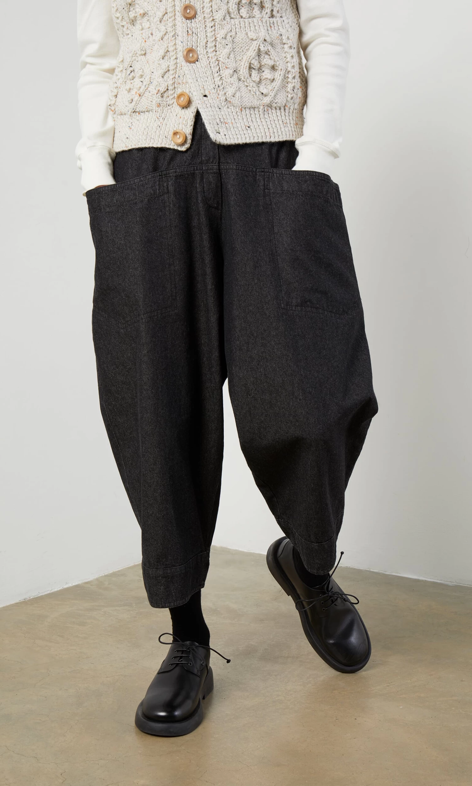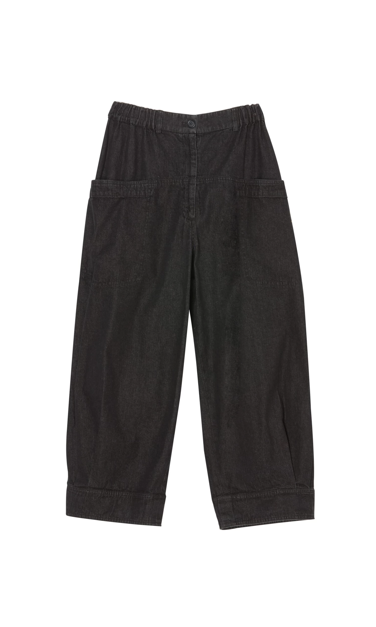 Super comfortable black-wash denim pants cut wide through the leg curving into slightly tapered ankles creating relaxed volume. Finished with patch pockets, an elasticated waist and a zip fly button fastening. Elasticated waist 34cm-48cm seam-seam. Inside leg L60cm.
