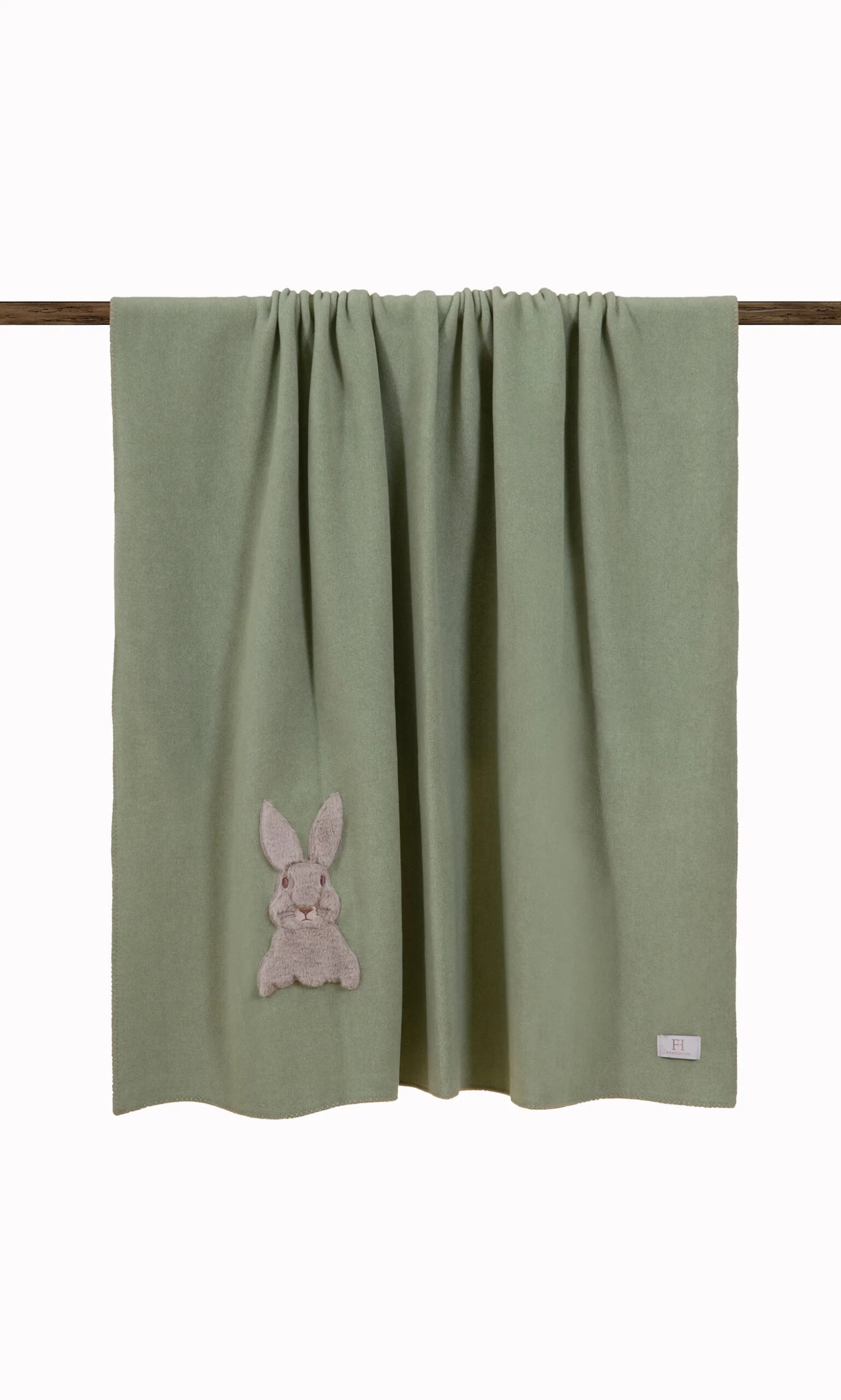 Thick fleece blanket that feels like cashmere, edged with whipstitch binding and embellished a plush bunny motif. Sustainably made in Italy. 130cm x 160cm.