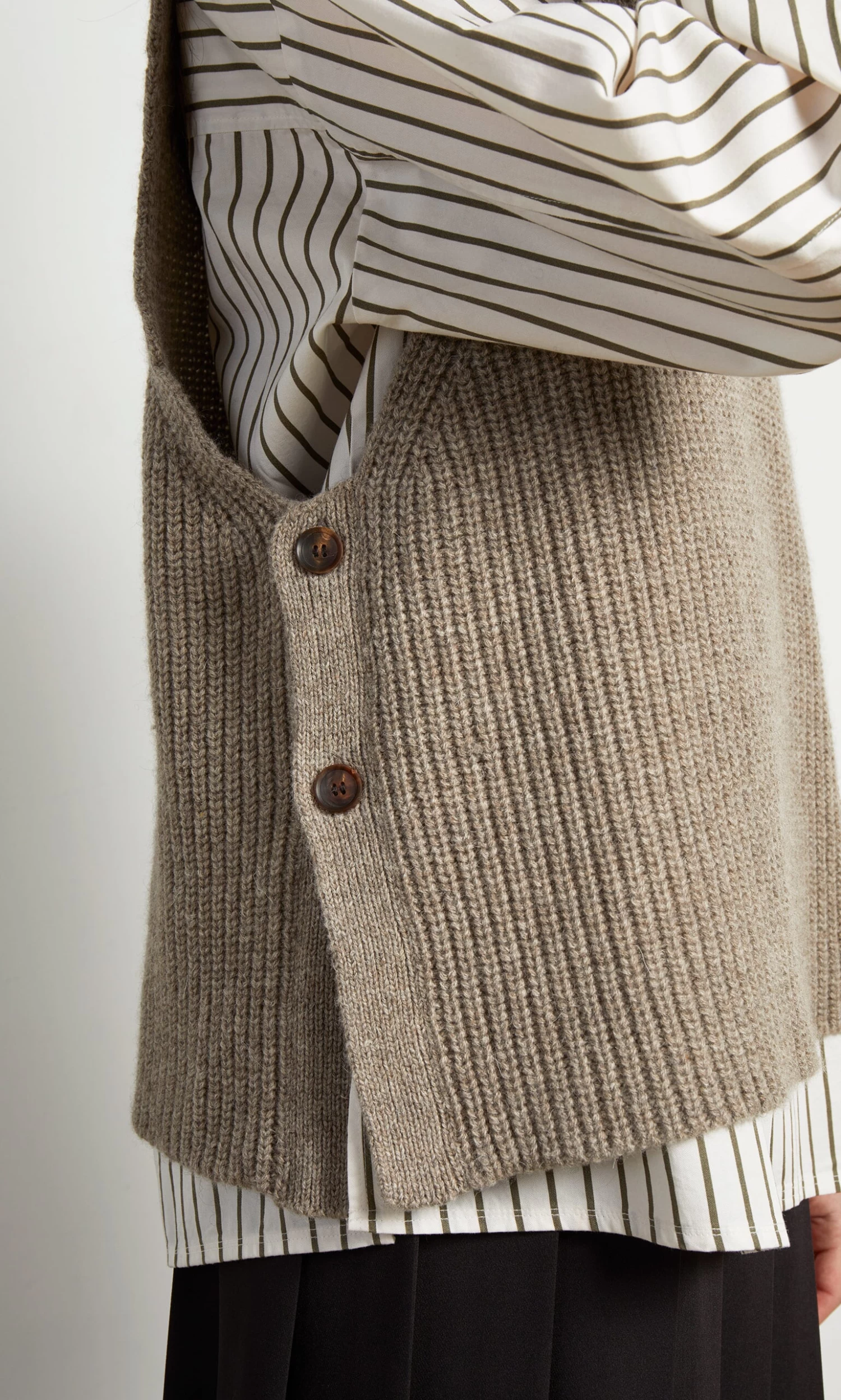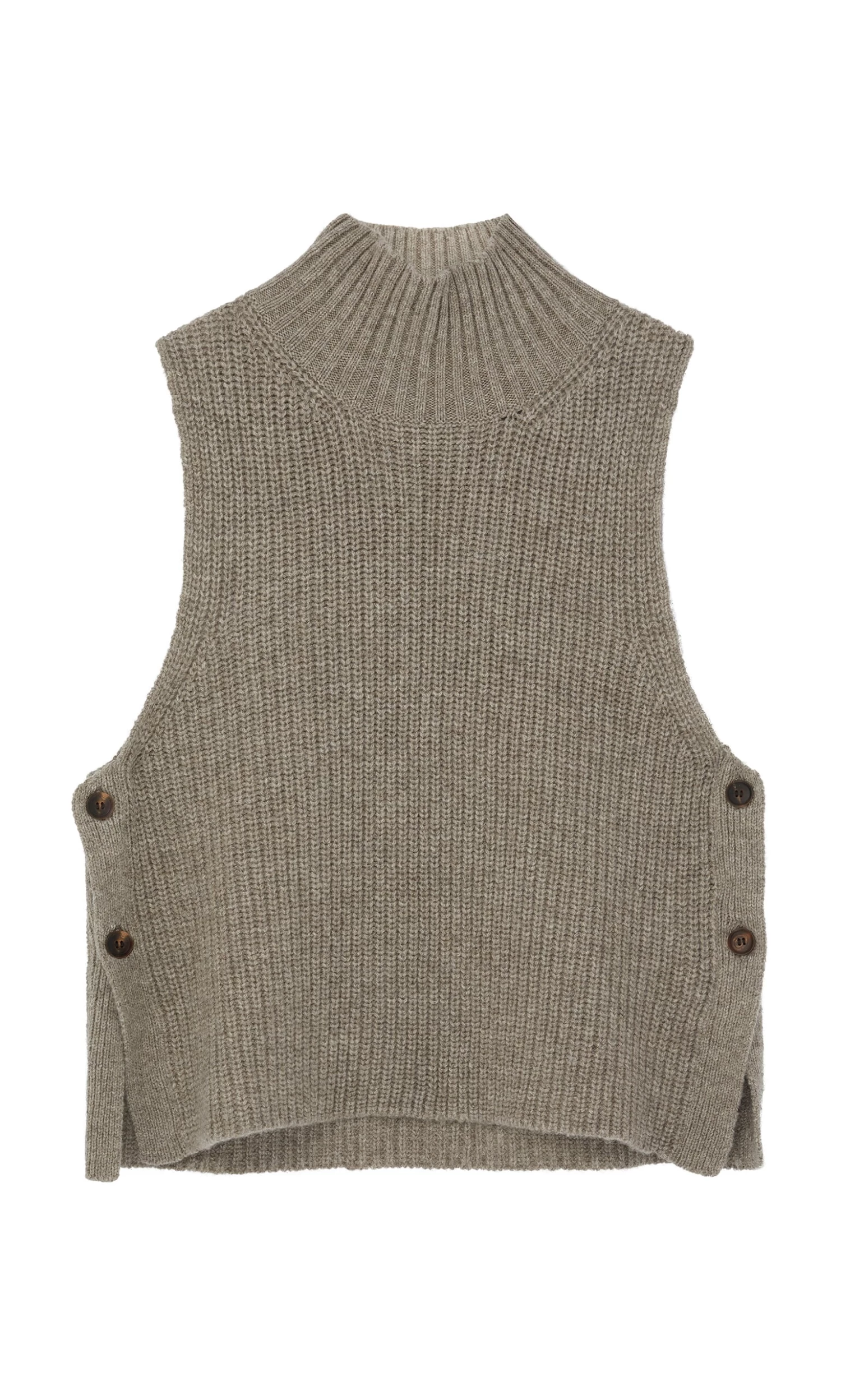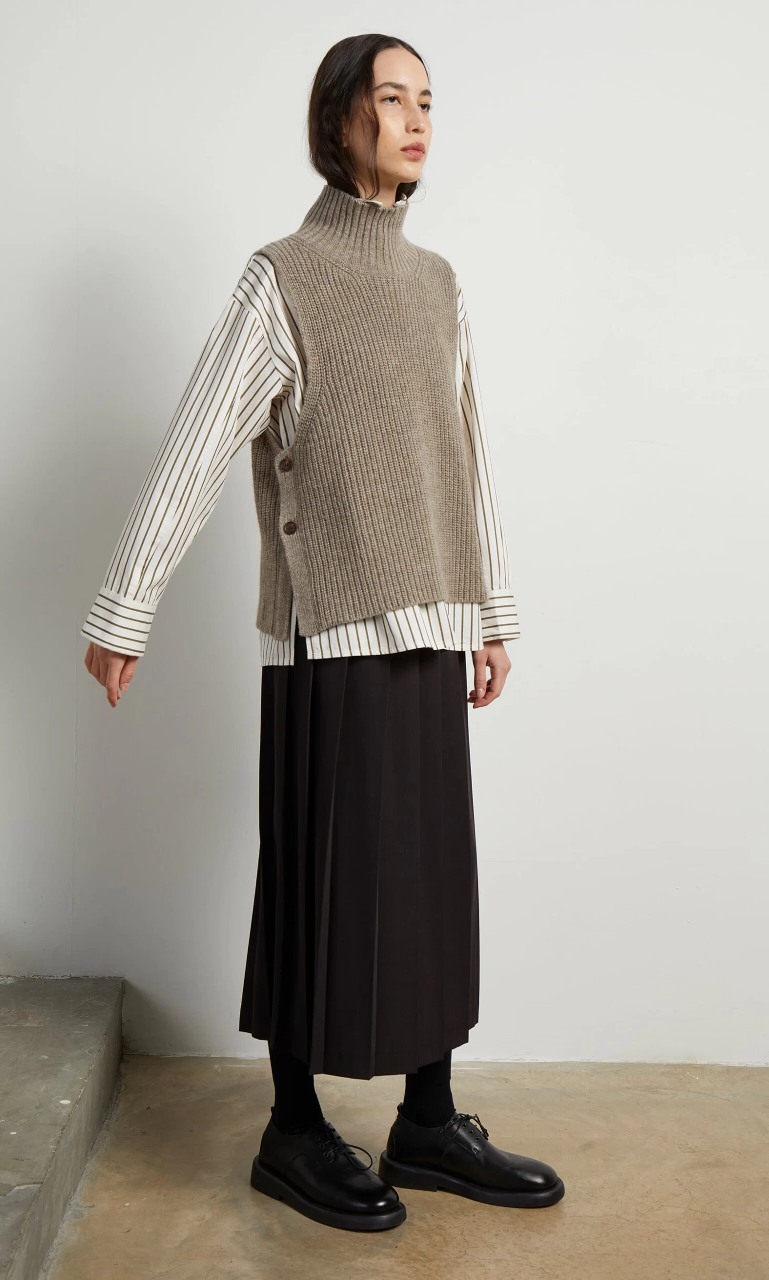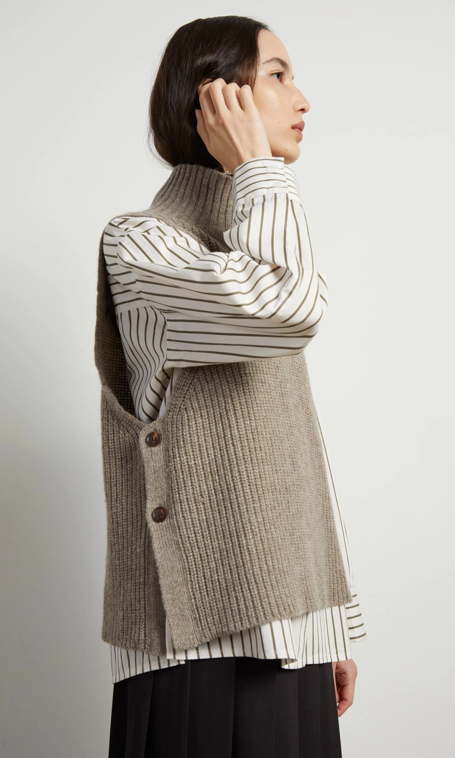 Rib-knit slipover with cosy roll neck sustainably produced using warm rare breed Mongolian Sartuul wool which softens with wear. Shaped for an easy fit with deep armholes and chunky button fastening at sides. Made in Nepal.