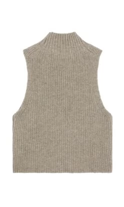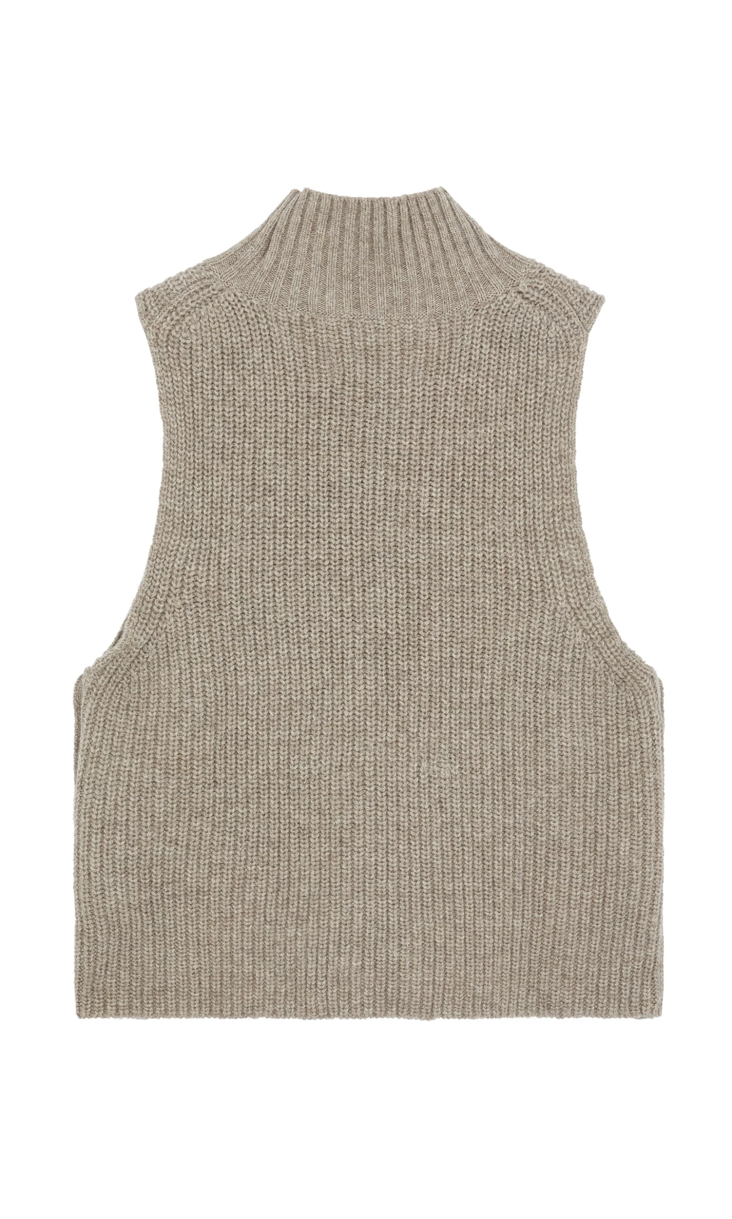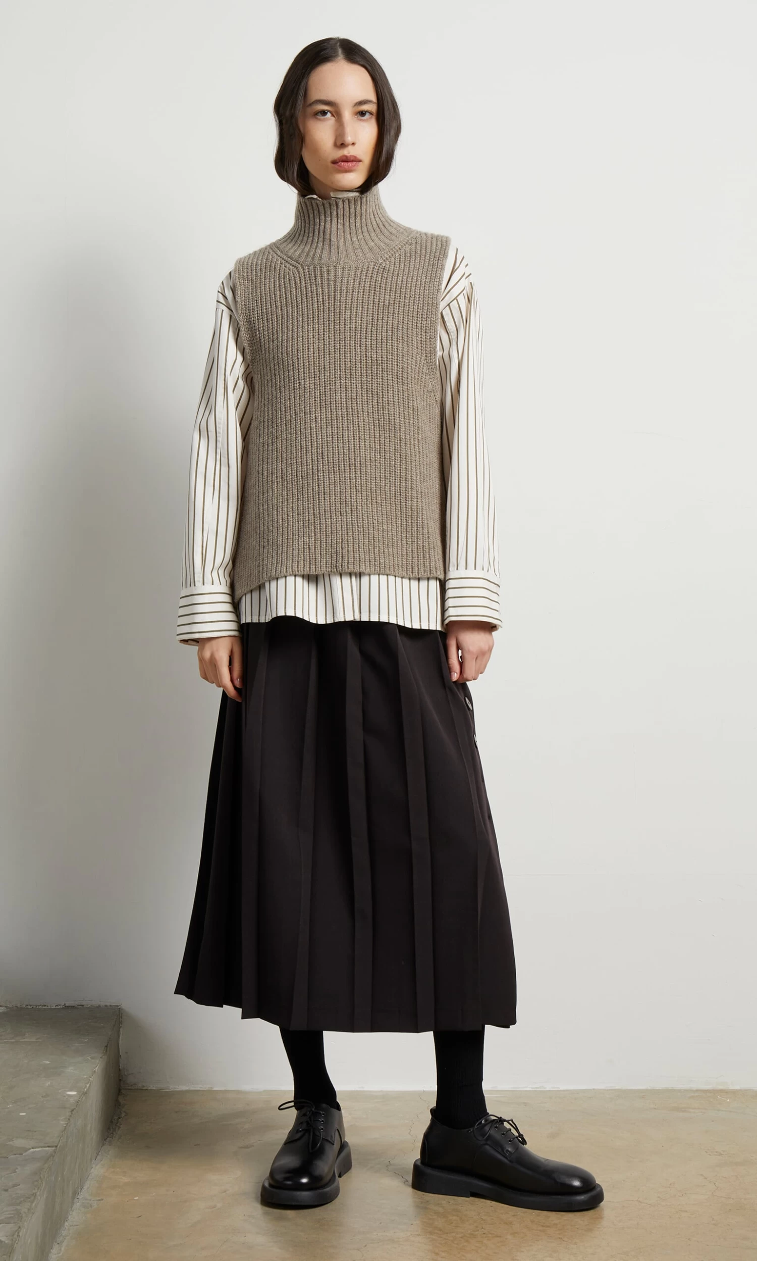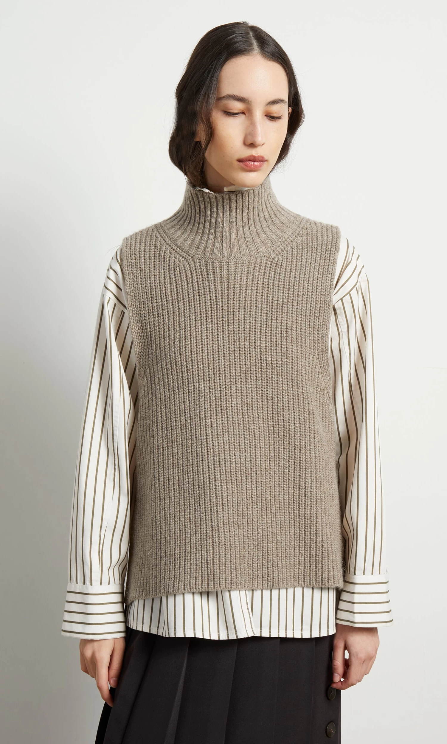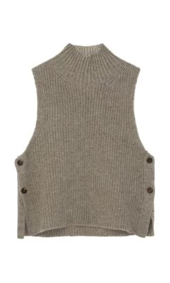 Rib-knit slipover with cosy roll neck sustainably produced using warm rare breed Mongolian Sartuul wool which softens with wear. Shaped for an easy fit with deep armholes and chunky button fastening at sides. Made in Nepal.