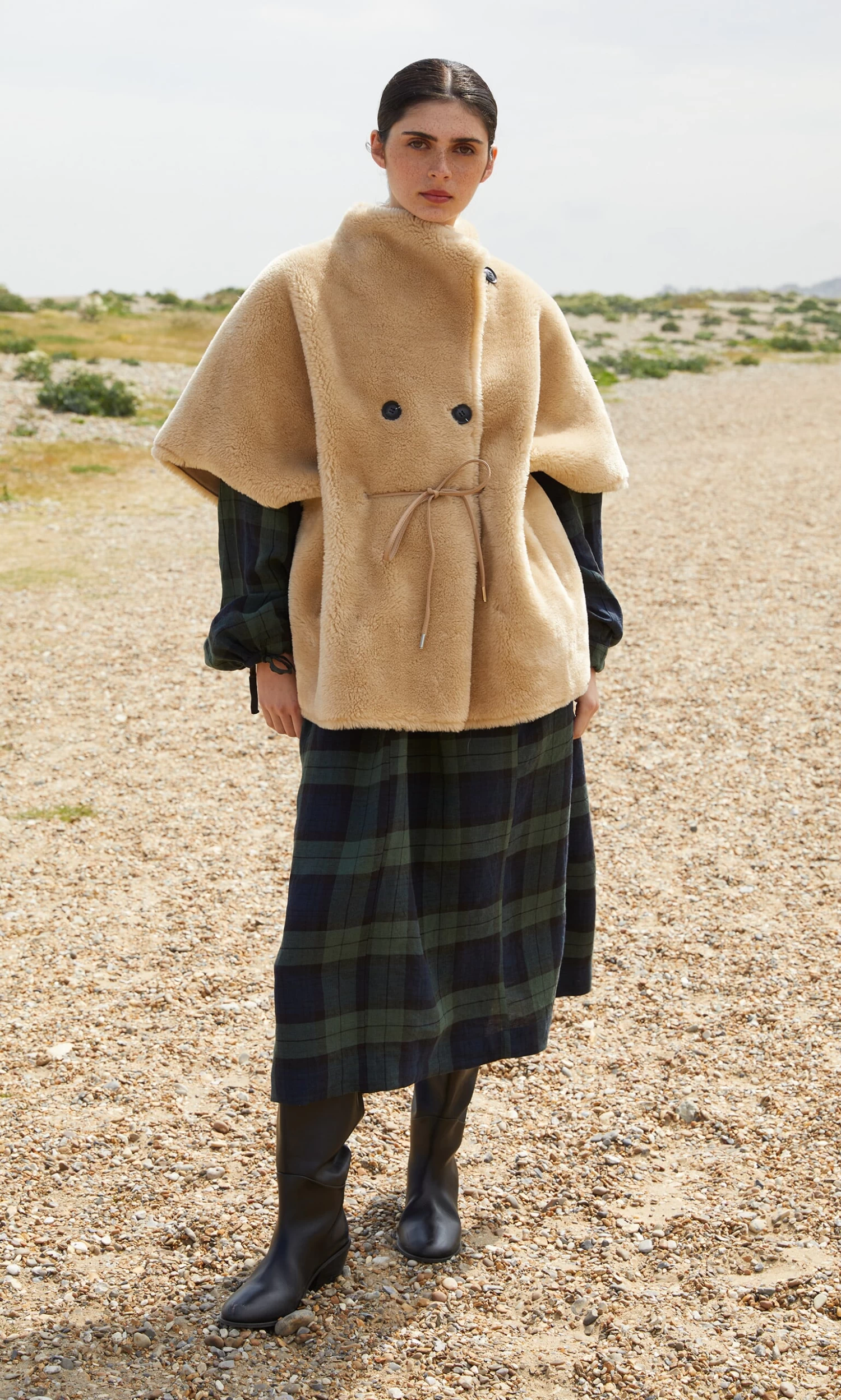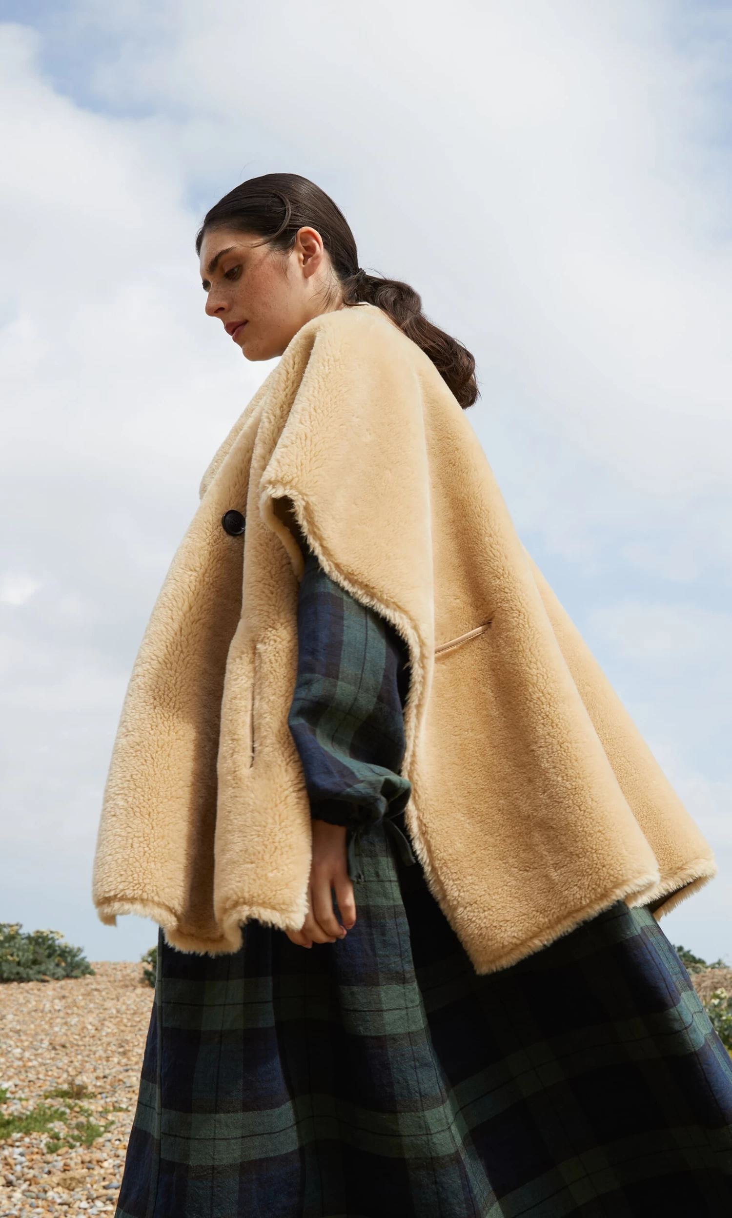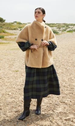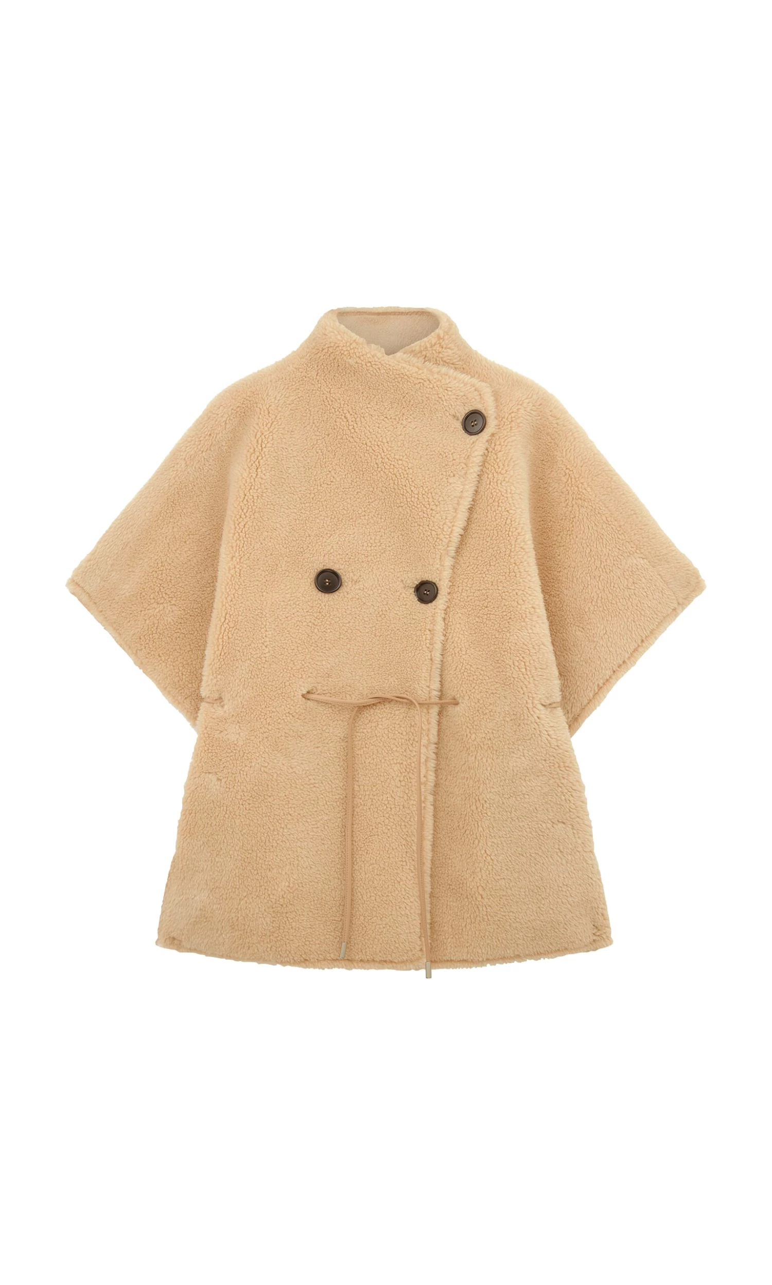 Natural faux sheepskin cape with asymmetric chunky button fastening and internal faux leather cord for adjusting the fit. Finished with cosy side pockets. L76cm.