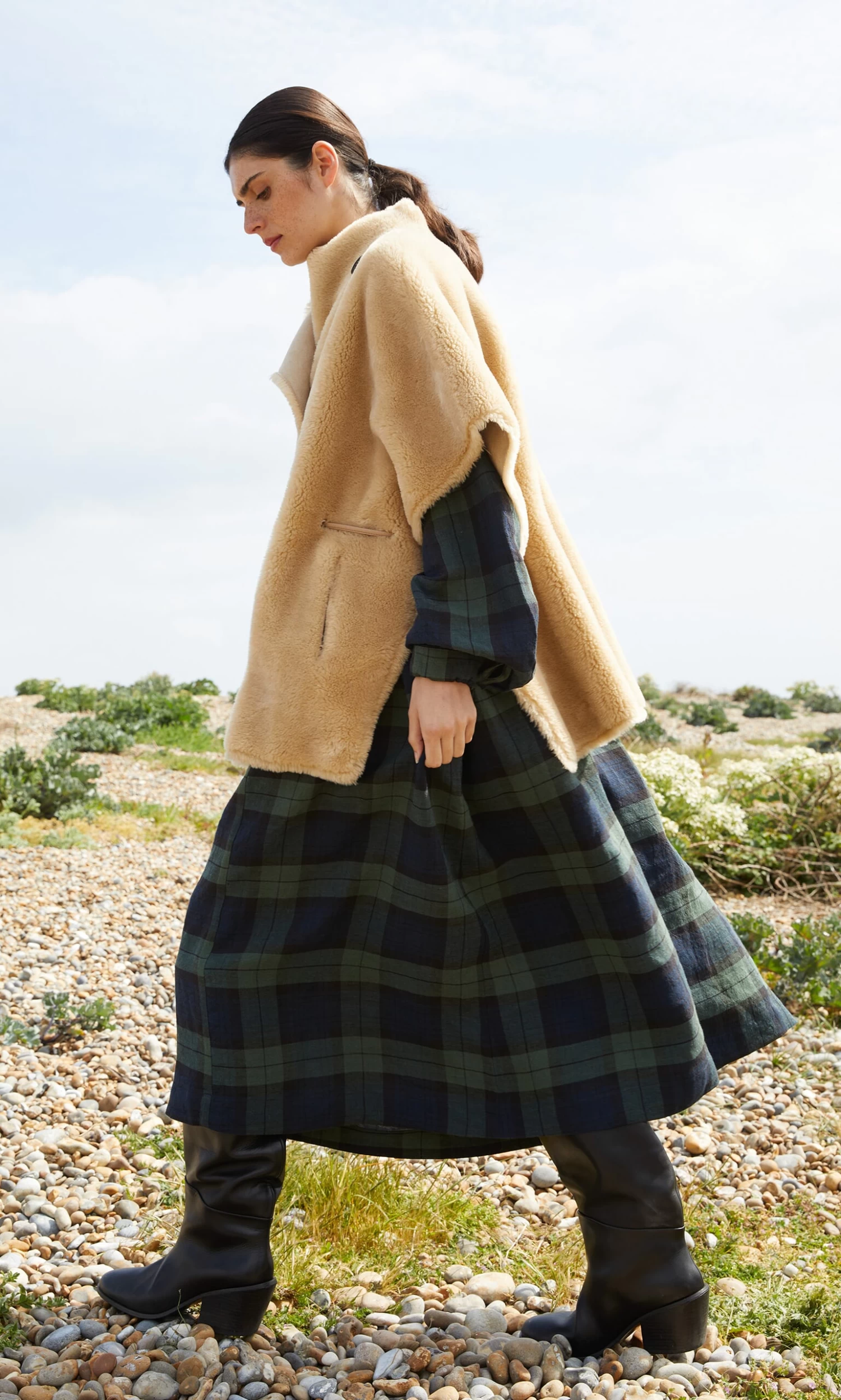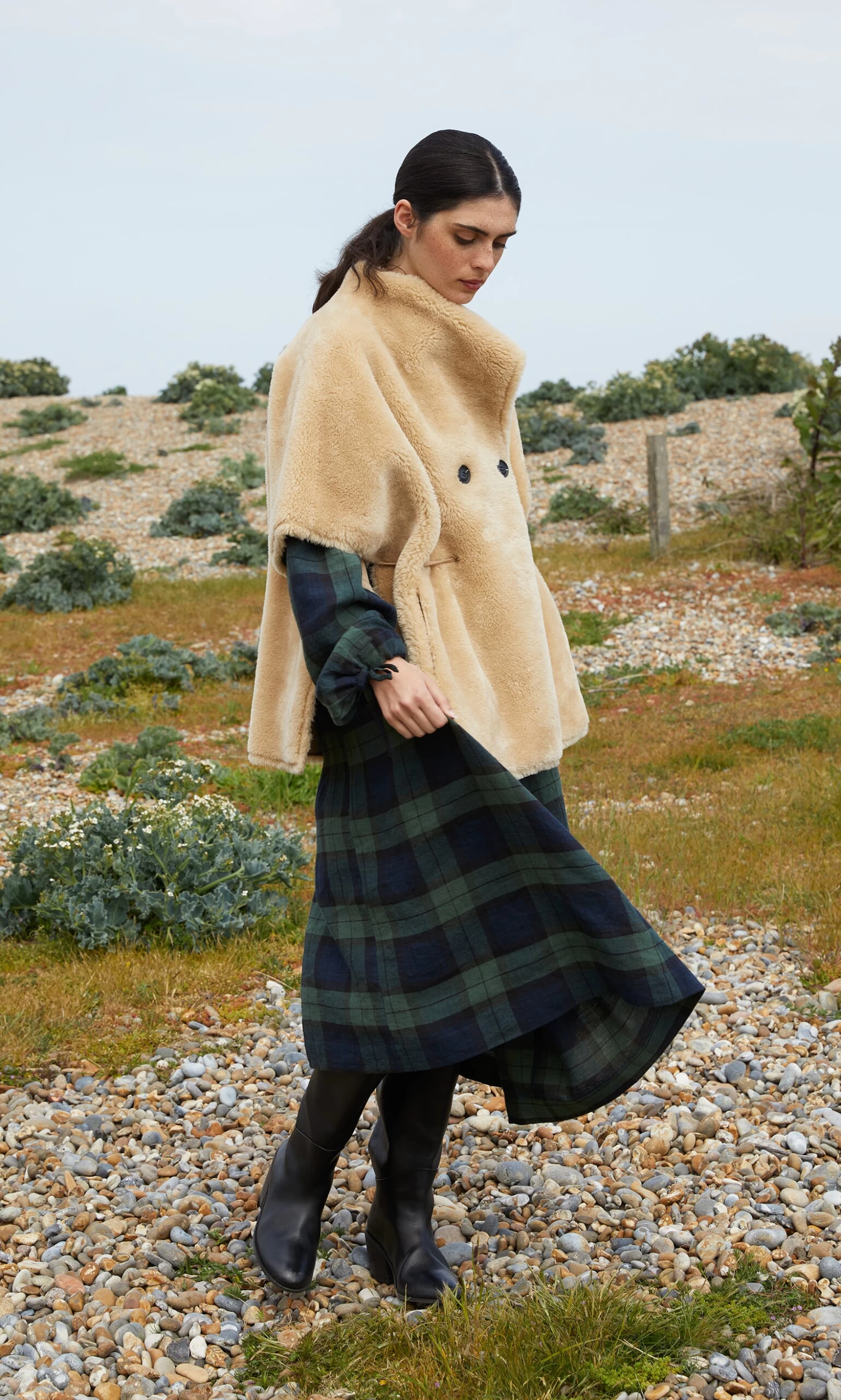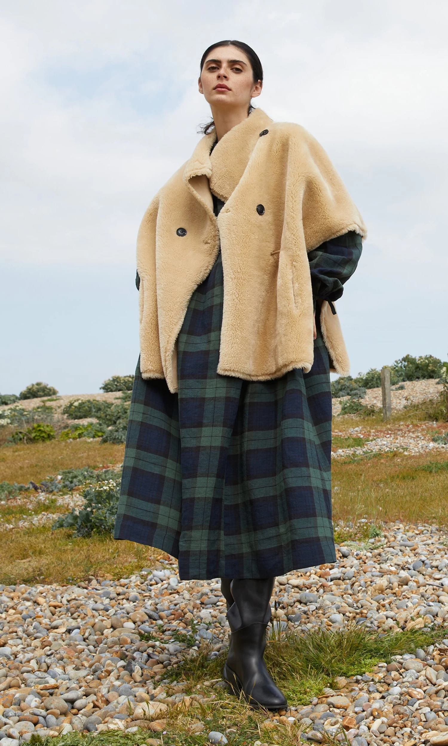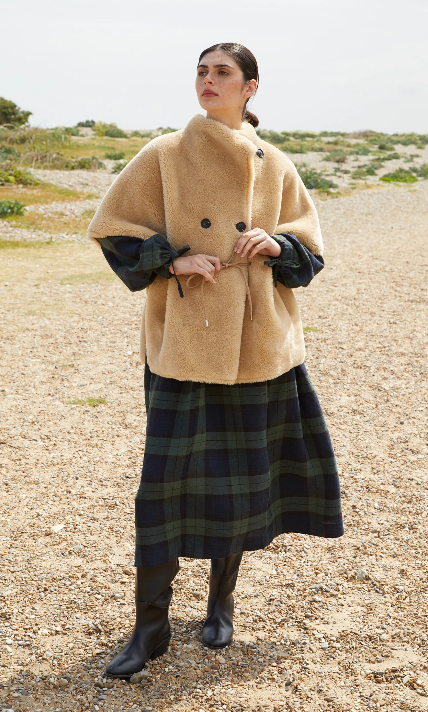 Natural faux sheepskin cape with asymmetric chunky button fastening and internal faux leather cord for adjusting the fit. Finished with cosy side pockets. L76cm.