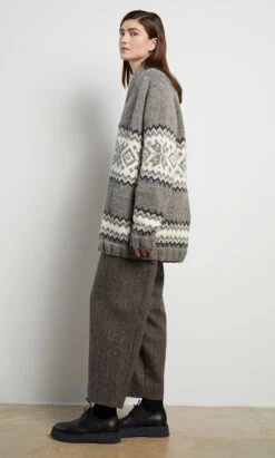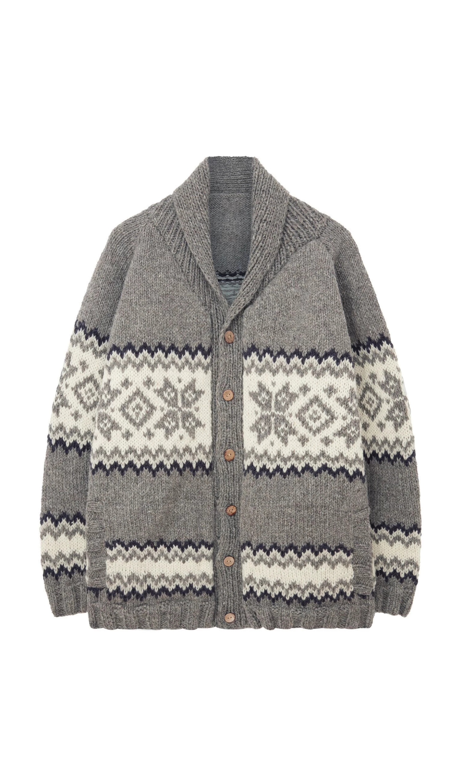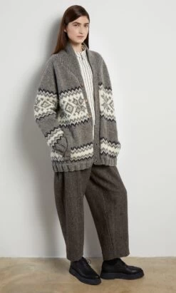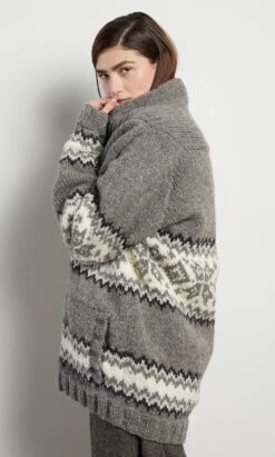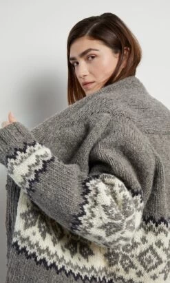 Tactile woollen cardigan knitted from naturally coloured yarns in traditional Fair Isle design. Generously shaped with narrow shawl collar and finished with coconut shell buttons. Generous, oversized style. Fairtrade, handknitted in Nepal. This cardigan is a one size item. L73cm.