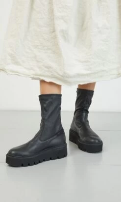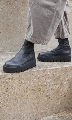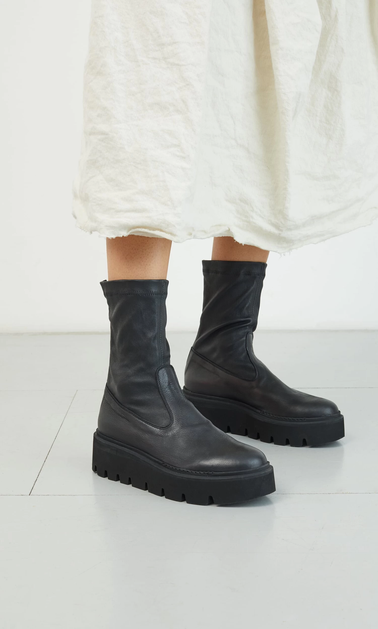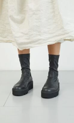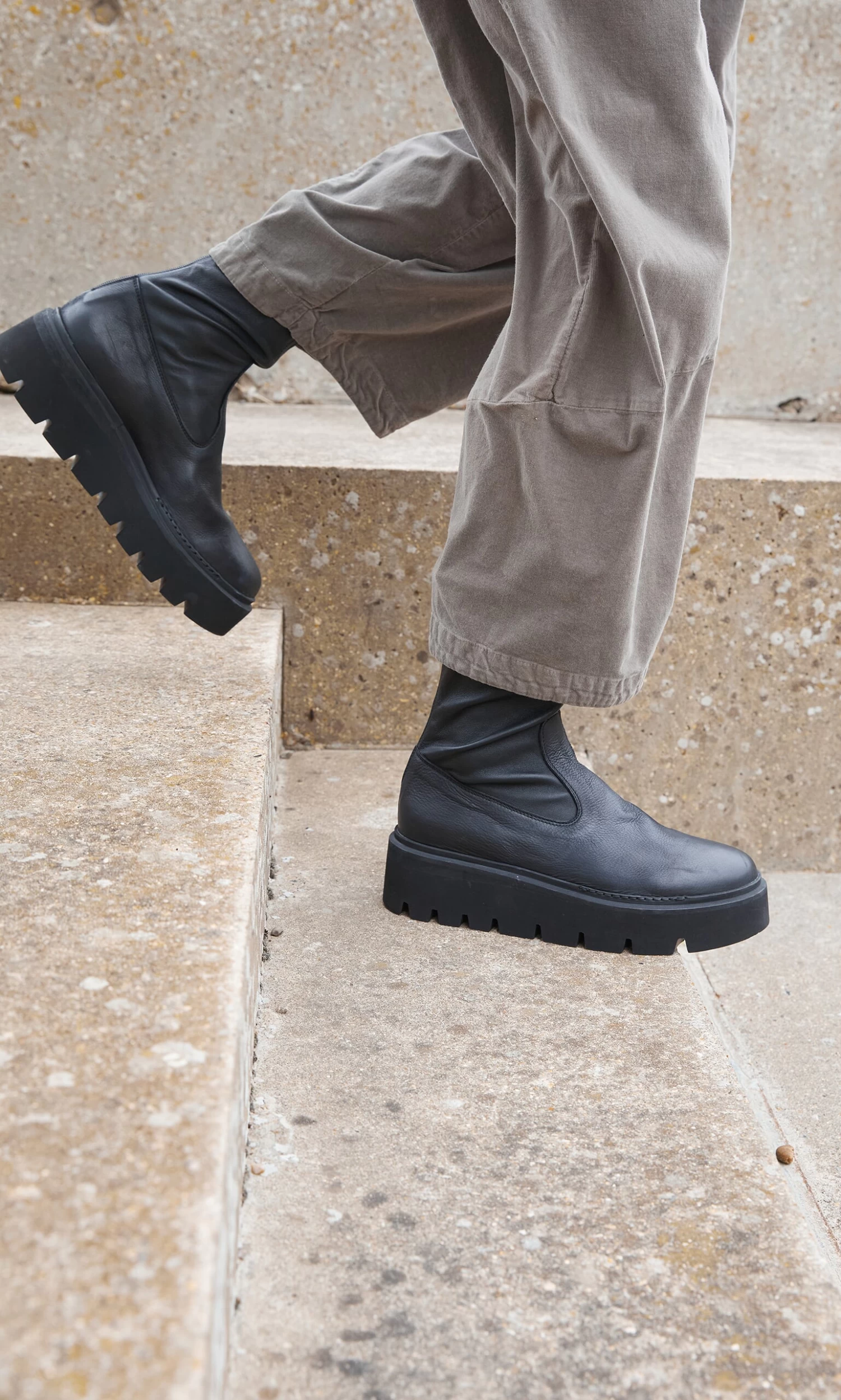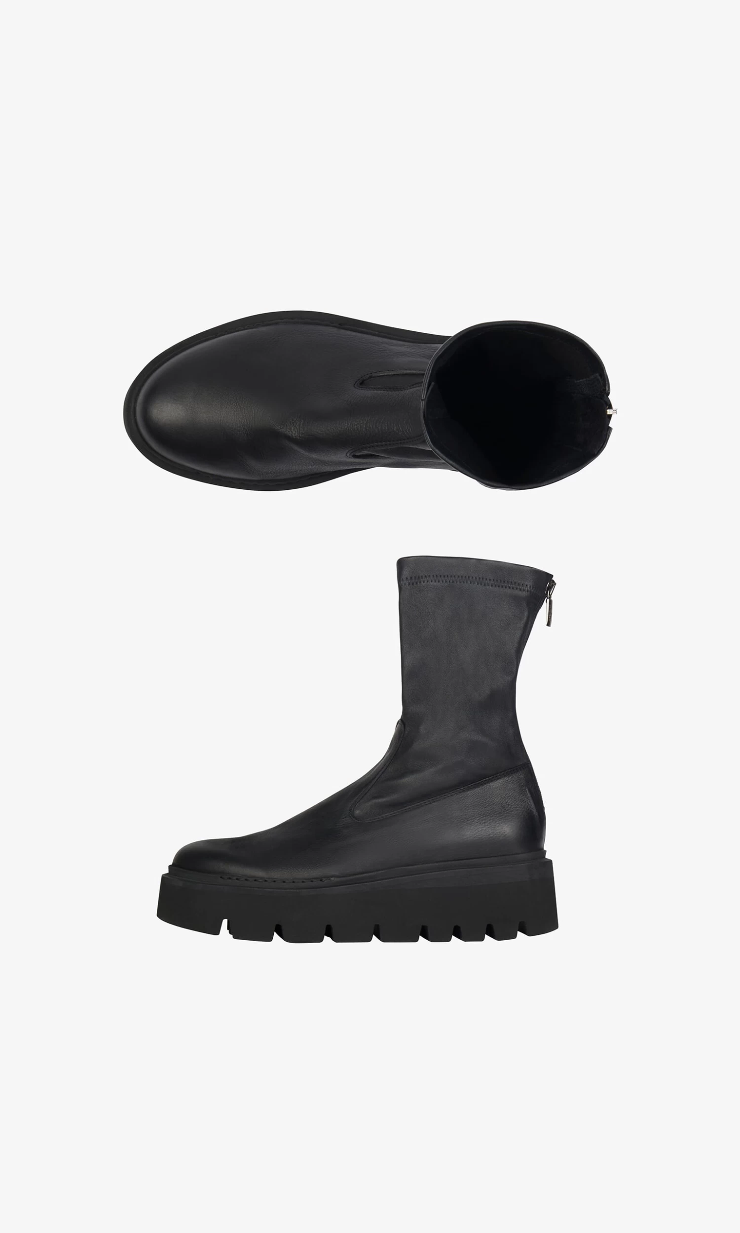 Directional ankle boots crafted from soft matt leather with stretchy faux-leather shaft for premium comfort and fit. The minimal silhouette is balanced by the chunky ridged soles which are super light and easy to wear. Back zips ensure they are easy to get on and off. Leather lined with padded footbed. Danish design, handmade in an Italian workshop. Heel 5cm