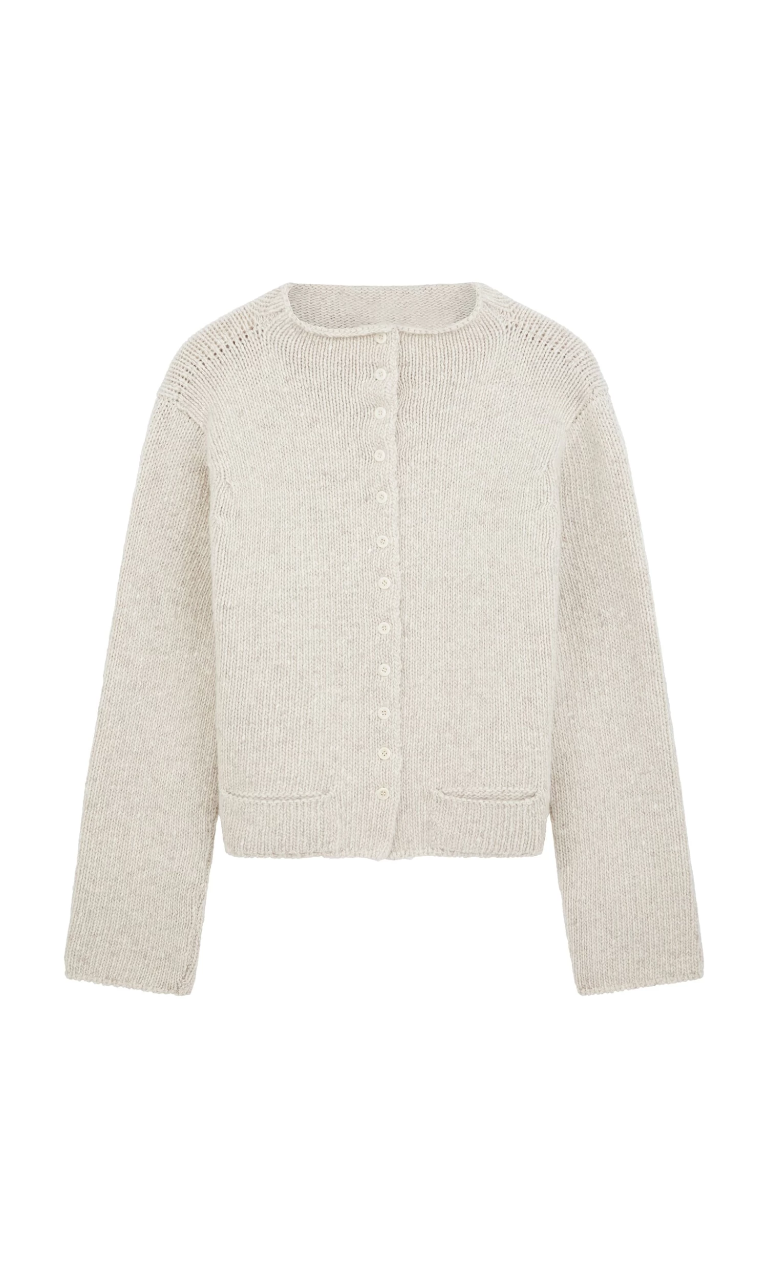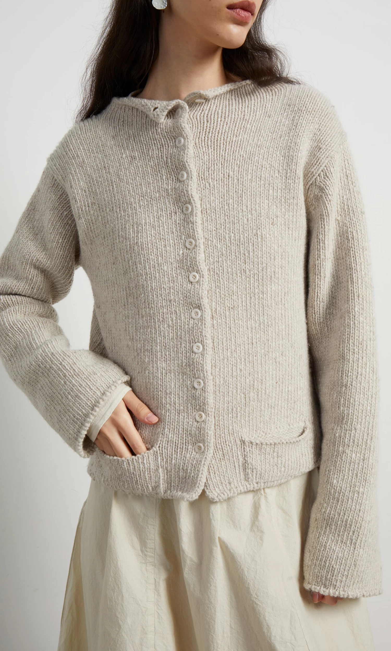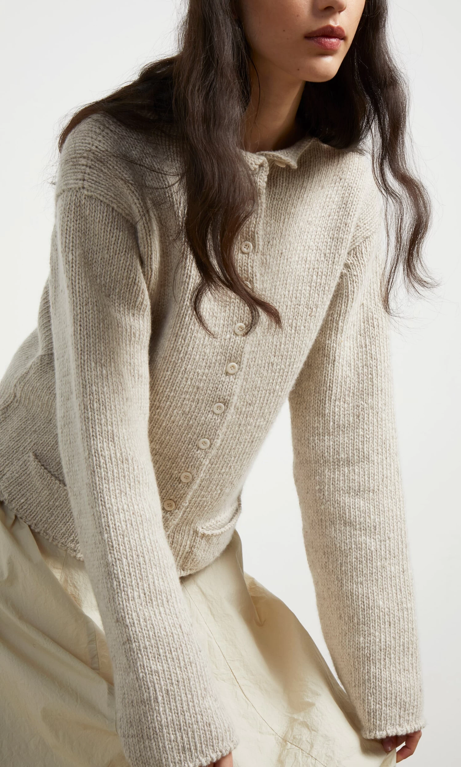 Neatly shaped button-up cardigan knitted in a soft blend of natural merino wool and cashmere. Pleasingly soft and weighty, the perfect chic body warmer with slip pockets positioned on the hem. Made in Scotland.