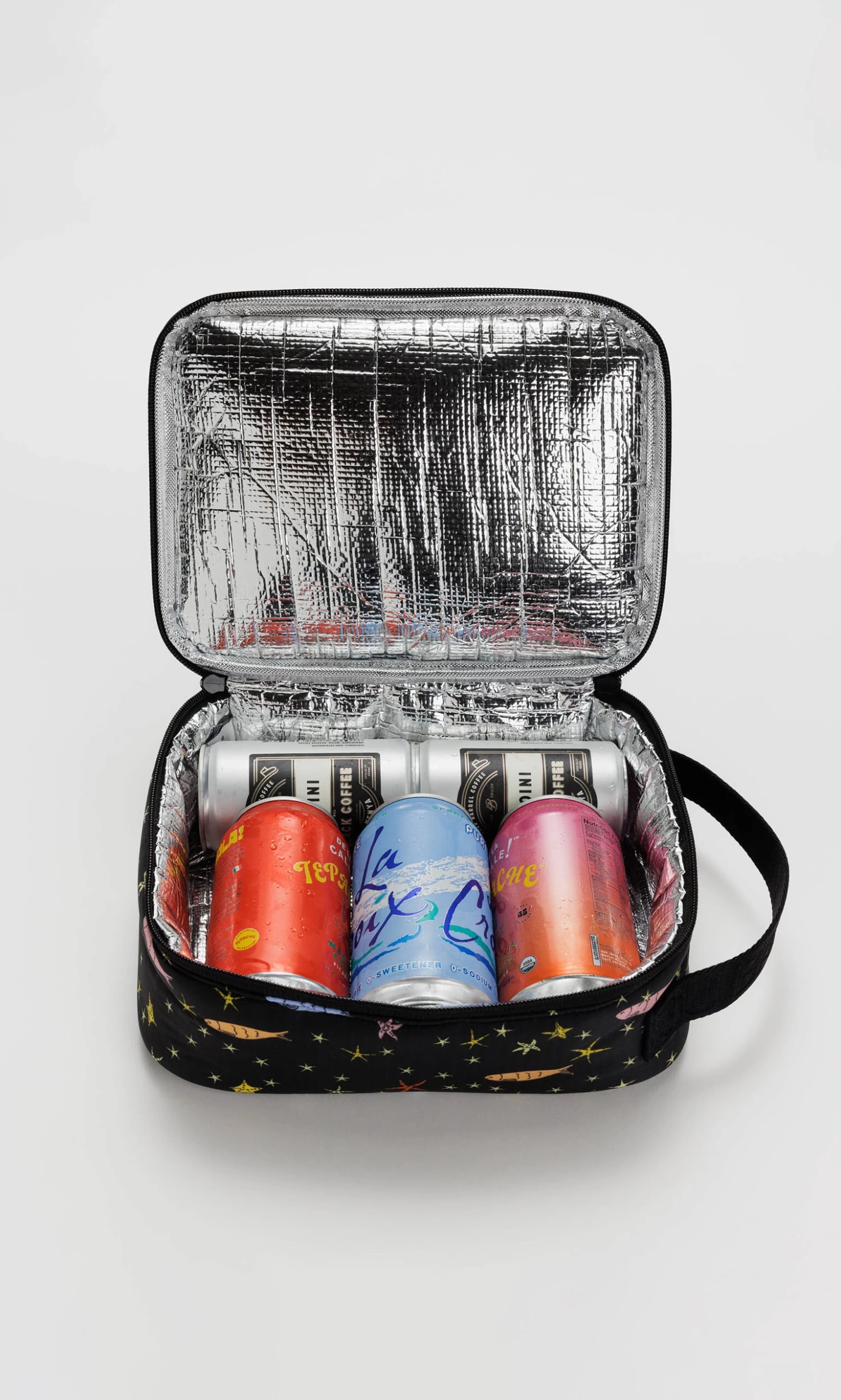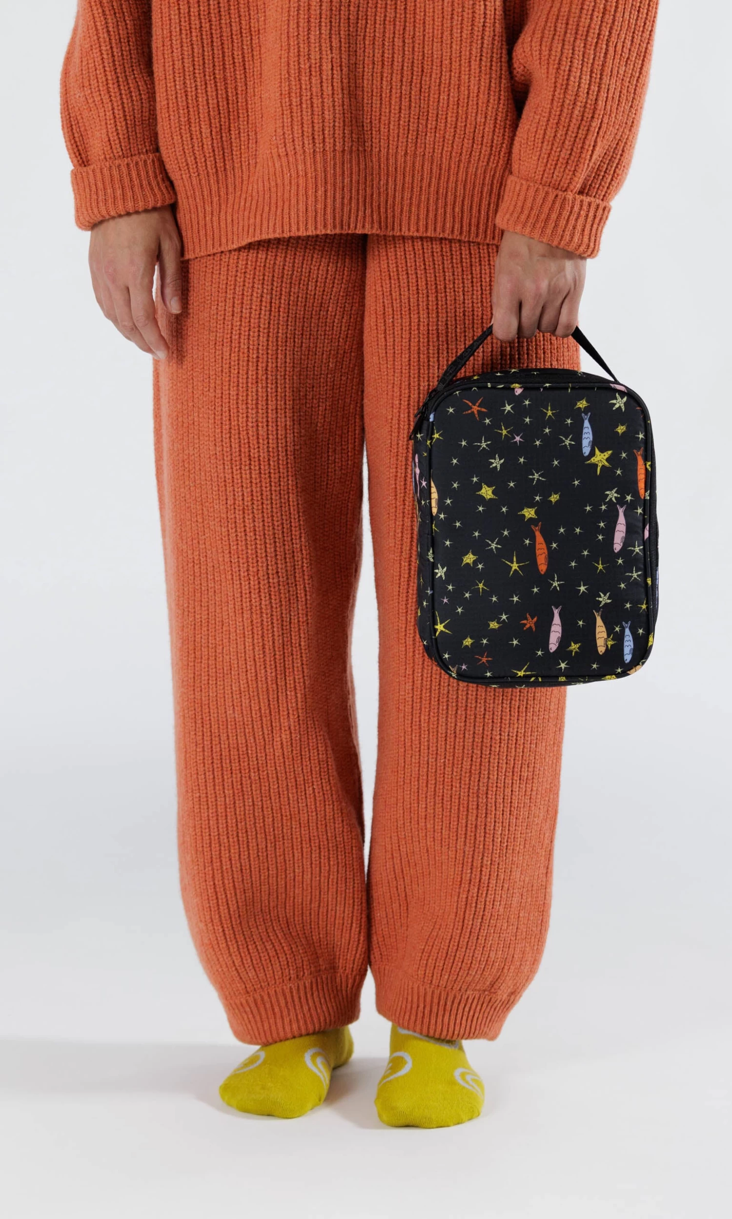 Insulated lunch box to keep your food cool and cushioned, made from a recylced nylon in a cosmic fish pattern. Zip closure to avoid any spillages. Spot clean and line dry. 24cmx19cmx9cm.