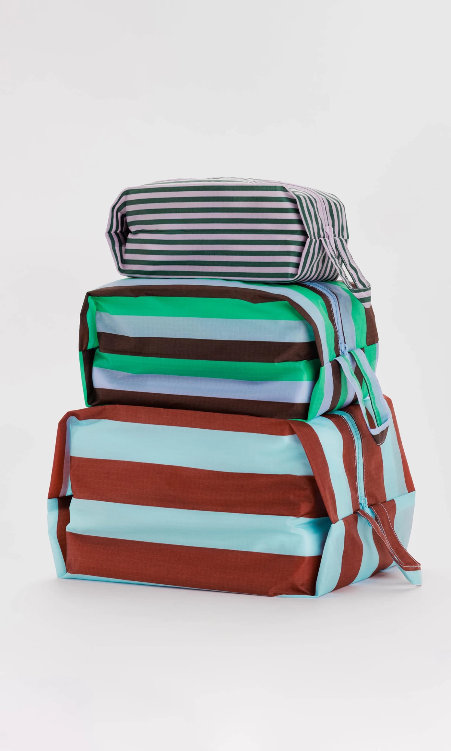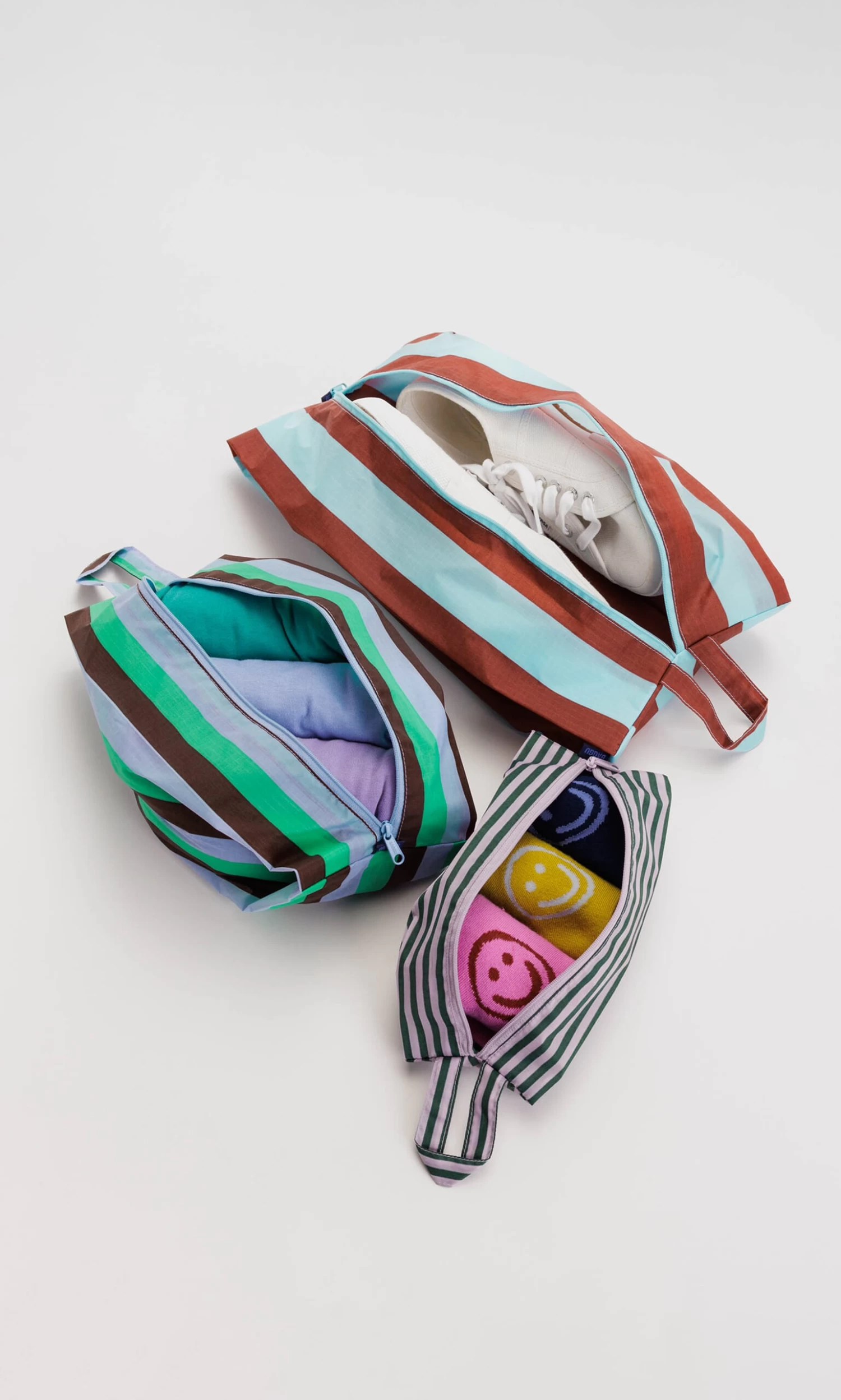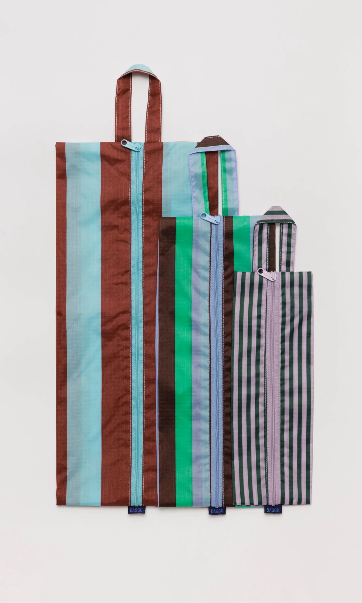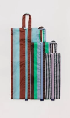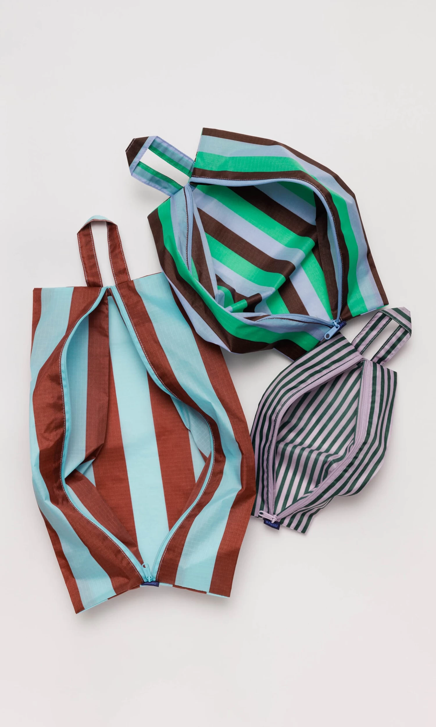 Set of three zip pouches in varying sizes, made from a colourful assortment of recycled nylon fabrics. Features attached loops for carrying and hanging on the go, these pouches can be used to aid in organising your life, whether at home or when travelling. Machine washable. Large bag: 25cmx18cmx17cm, Medium bag: 22cmx13cmx13cm, Small bag: 18cmx9cmx9cm.