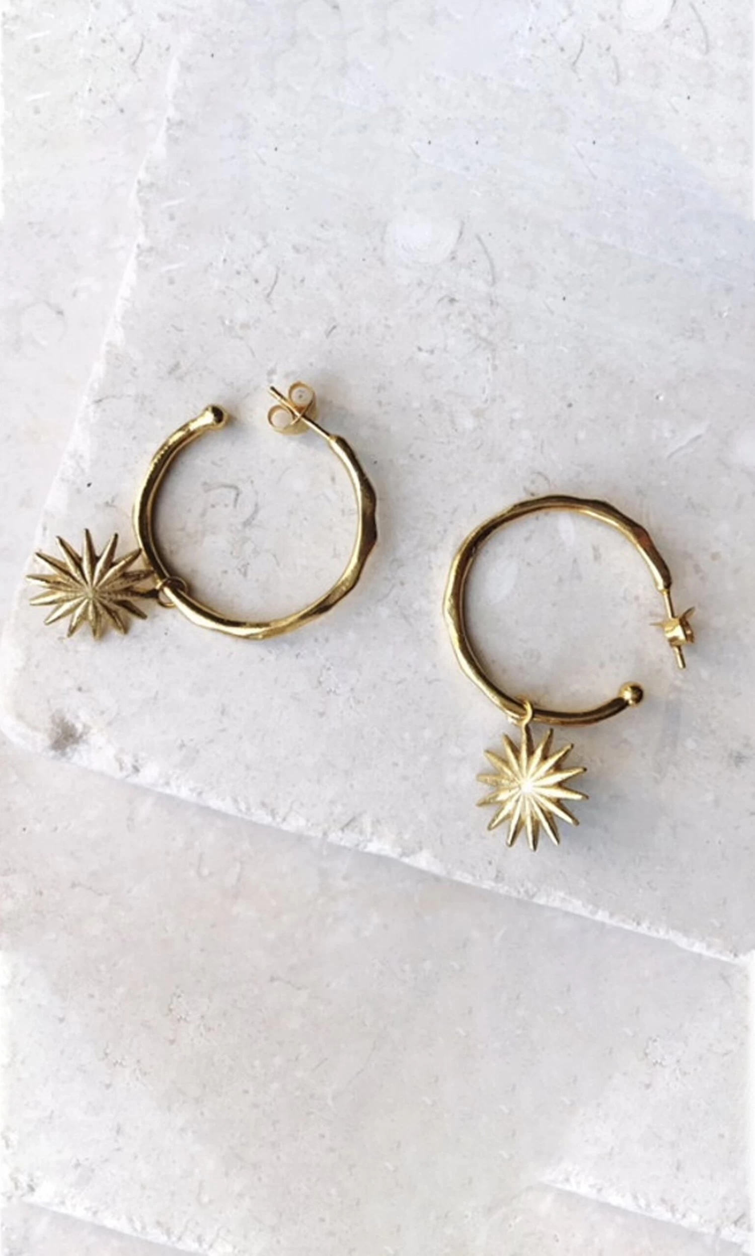 Round gold plated earrings with sun dangling pendant. For pierced ears only.