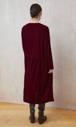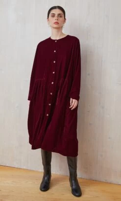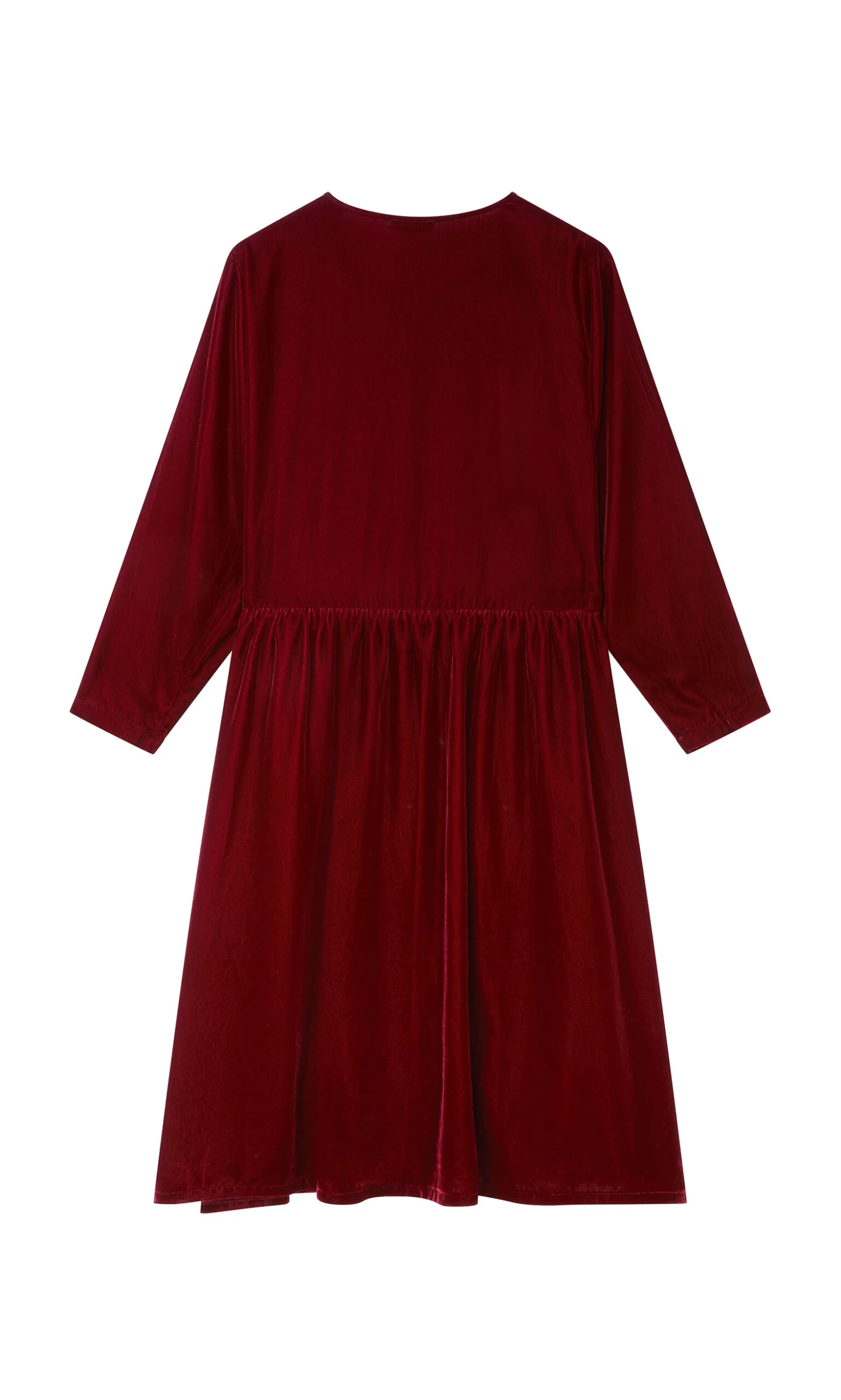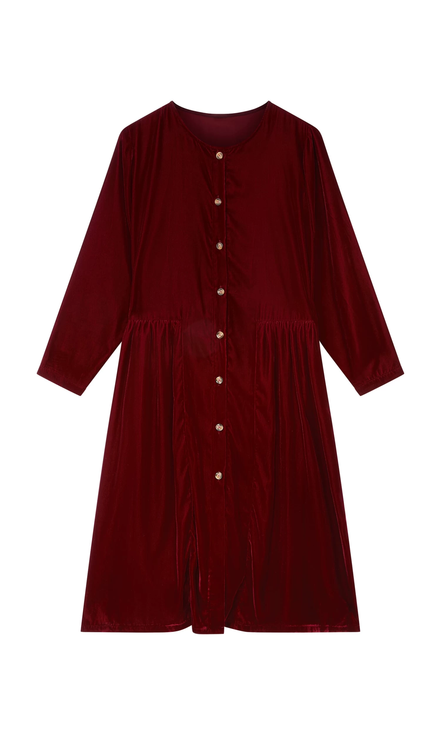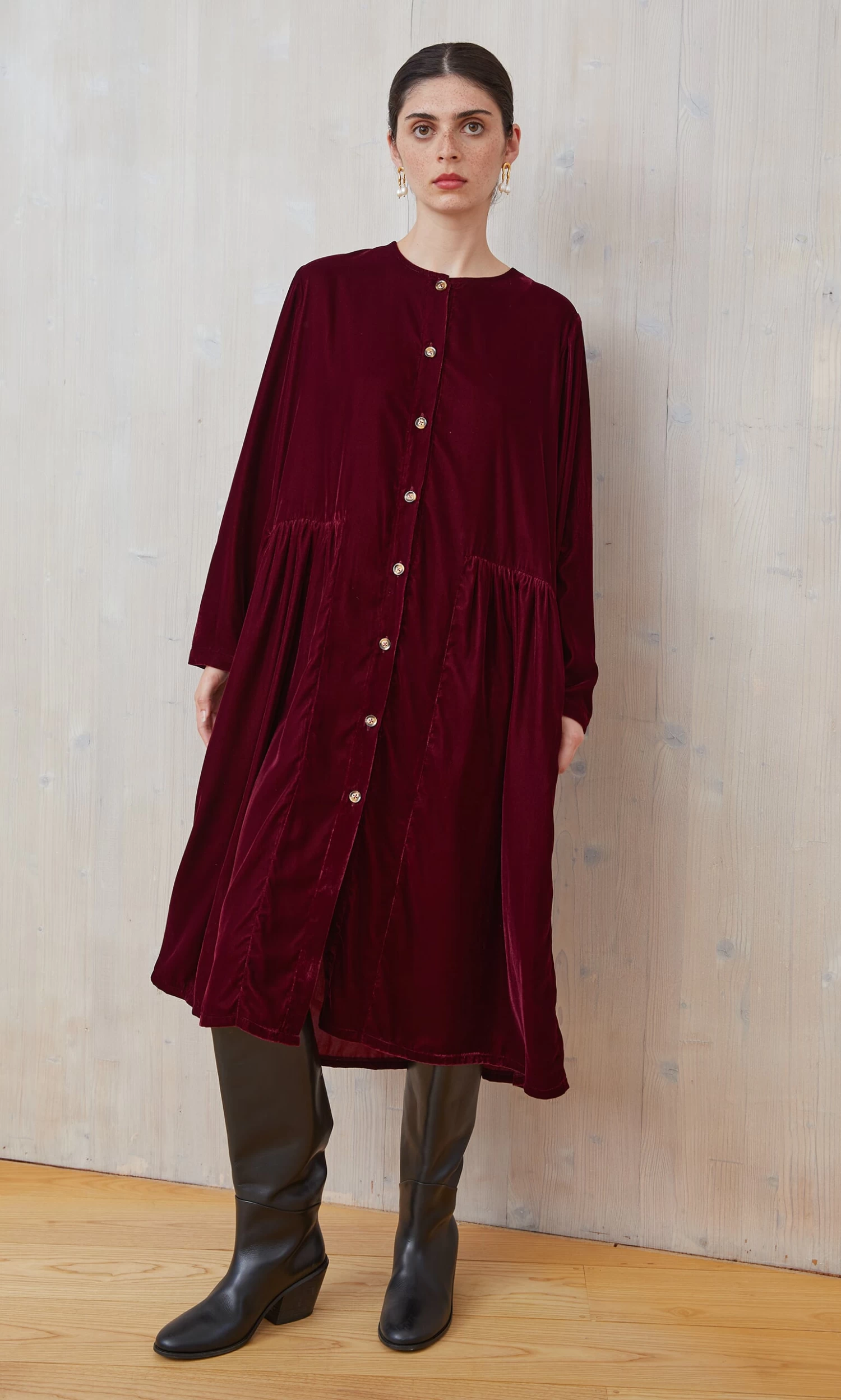 Silk-blend velvet dress with skirt gathered onto a marked waistband and marbled buttons that fasten up the front. Round neck and long straight sleeves. Made in Italy. L118cm.